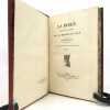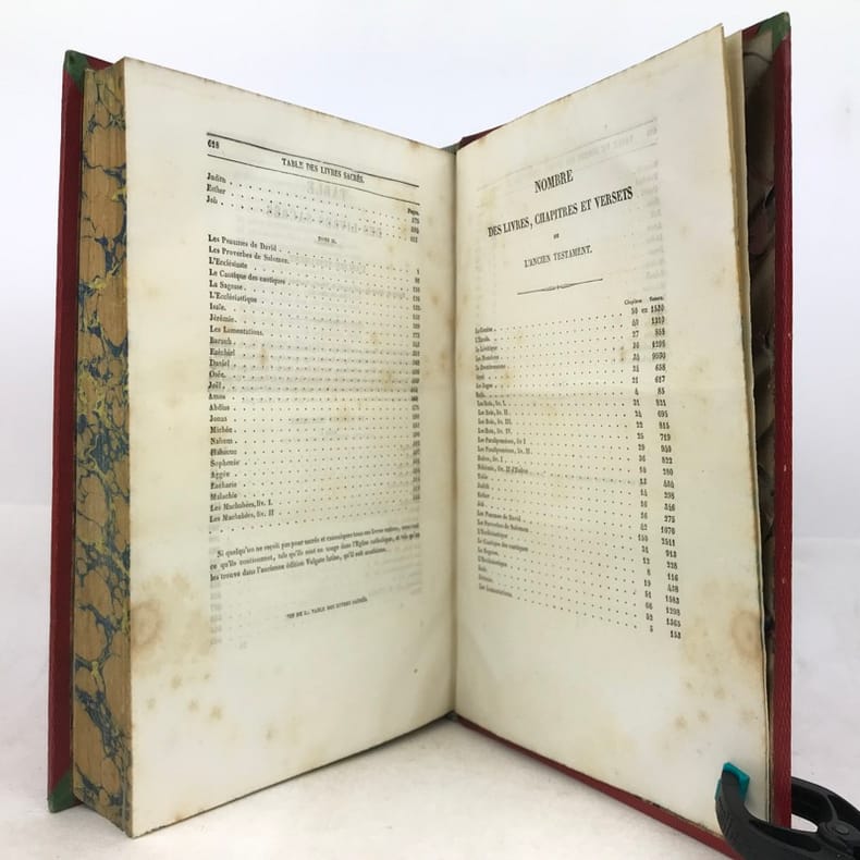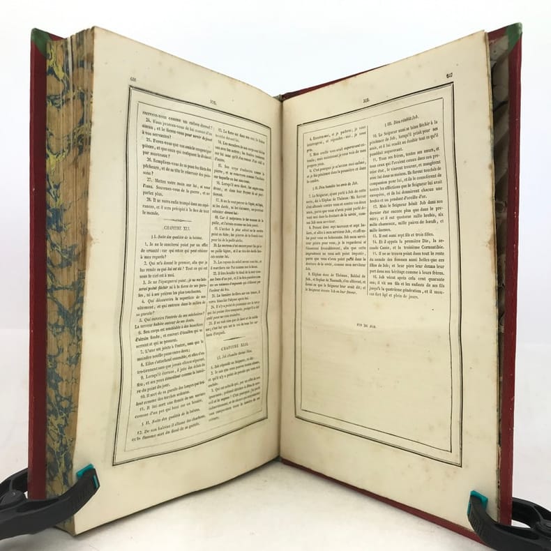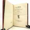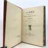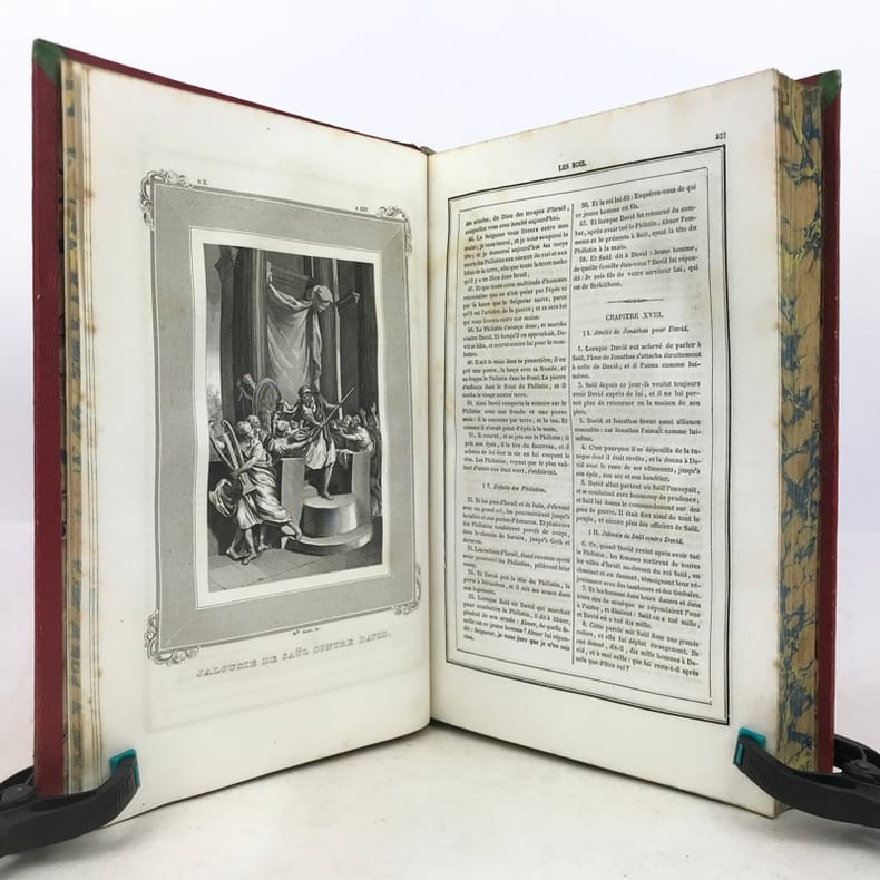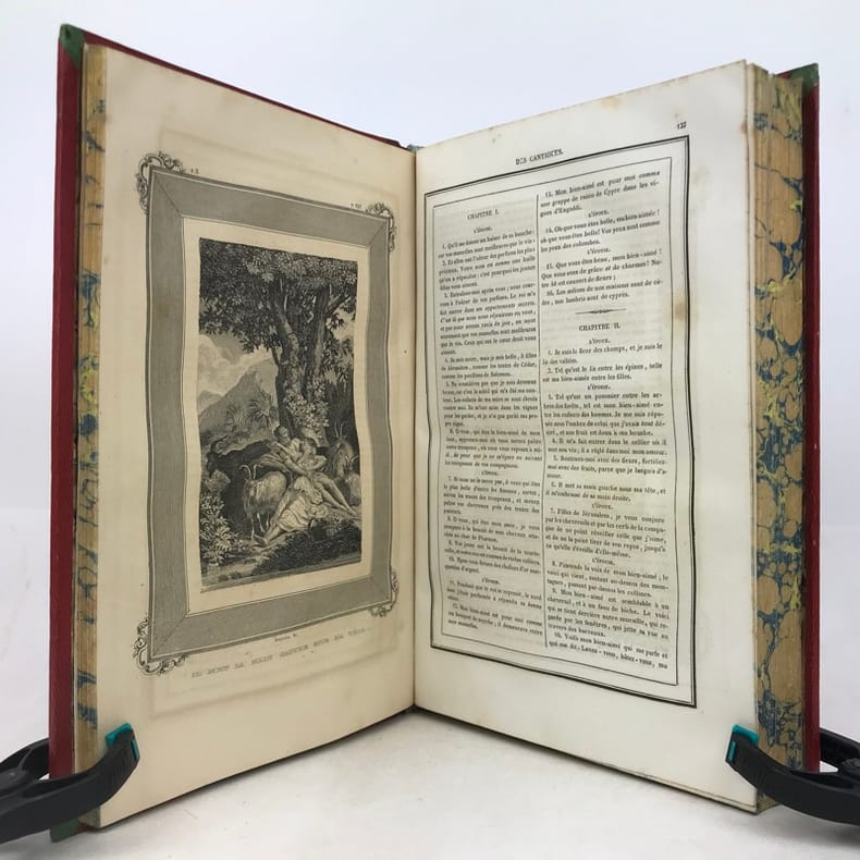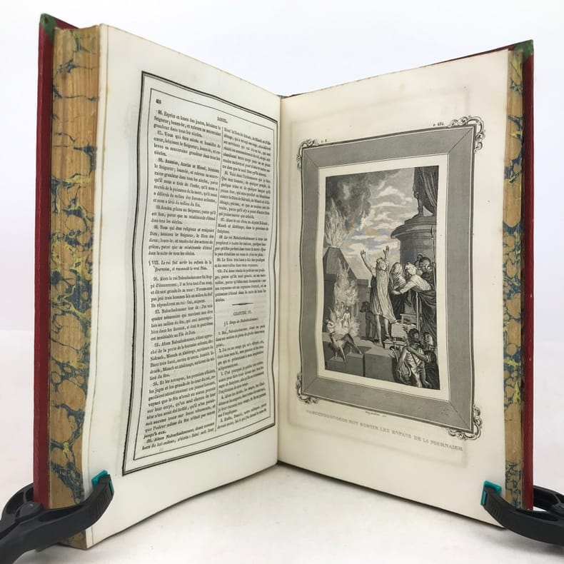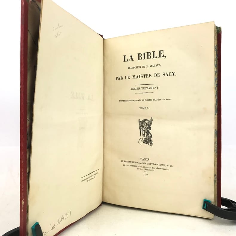 Paris, Bureau Central, rue Vivienne, 1837 Nouvelle édition, ornée de figures gravées sur acier complet en 3 vols in4, 280x200, demi cuir rouge,dos lisses ornés de fers romantiques en long,tranches marbrées,, frottements, bel état intérieur,304 pages pour le tome I, tome II paginé de 306 à 647,647 (pagination continue pour T1 et 2), 620 pp pour T3, ouvrages rares et recherchés ! Illustré de plus de 143 planches gravées sur acier par Péronard, Skelton, Domaine, etc.Texte encadré sur deux colonnes..Edition romantique en 3 volumes de la Bible dans la traduction du Maistre de Sacy, ornée de planches hors-texte gravées sur acier sous serpentes,texte élégamment encadré d'un triple filet noir gras et maigre,charnière fendillée fragile haut du t.3,sur 4cm; coiffe sup.un peu abimée au T.2.,sinon bon .Lemaistre de Sacy ,Isaac (1613-1684) ,Traducteur,Peronard ,Graveur,Lalaisse ,Graveur,Skelton ,Graveur.Les planches gravées sur acier, signées : Péronard, C. Lalaisse, Skelton, Dunaime, Canu, Monin, Rouargue, Colin, M.lle André, Mondain, Branche, Morinet, Desjardins, Lecerf, Butavand, L. Berlie, Euzet, Gossard, Pauquet, Emile Giroux, Château, Lejeune, Thiery, Villerey.