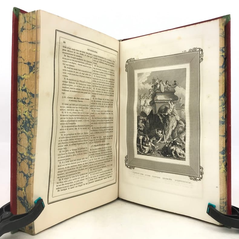 Three volumes comprising the whole of the Old Testament. Quarter leather with marbled boards. Leather is dark green, with black labels and gilt titles and decorations. A bit rubbed to the spines but still attractive. Vol 1 has been repaired to the base at the spine at some point. Internally in good order, with a little foxing throughout. 160 plates. Romantic edition in 3 volumes of the Bible in the translation of Maistre de Sacy, adorned with inset plates engraved on steel by Peronard, Lalaisse, Skelton, Desjardins, etc. Text elegantly framed in a bold and thin black triple rule. 304, 647, 620 pages. (complete). 275 by 190mm (10Ÿ by 7œ inches). .