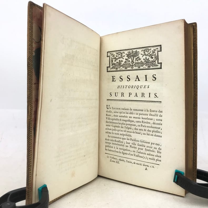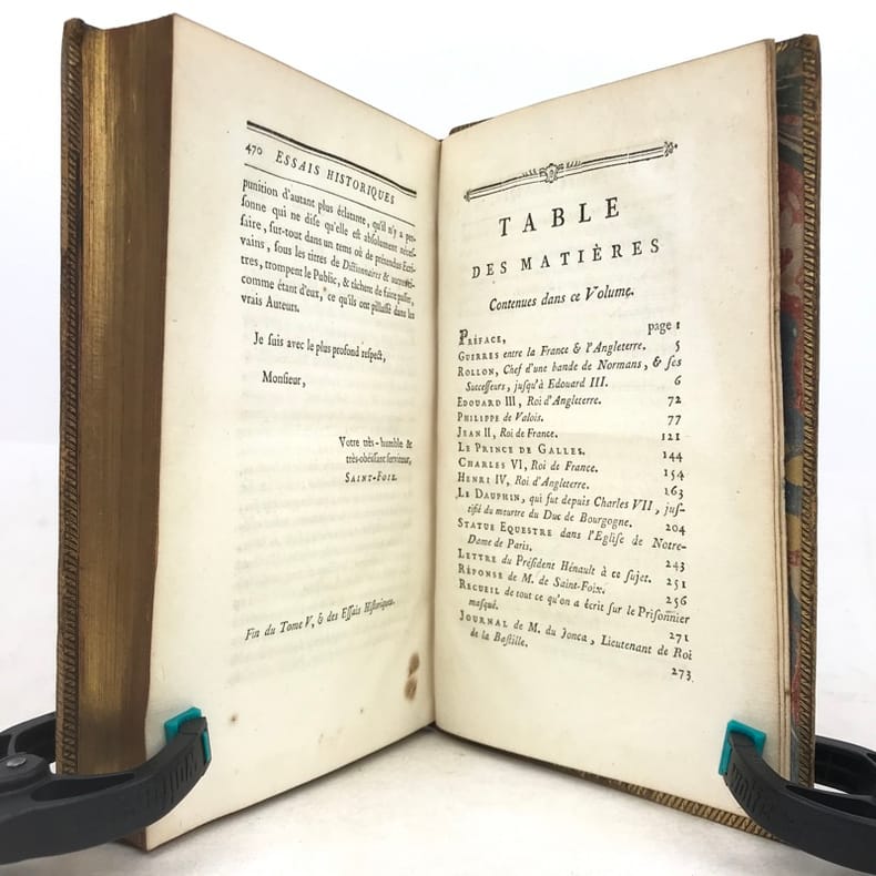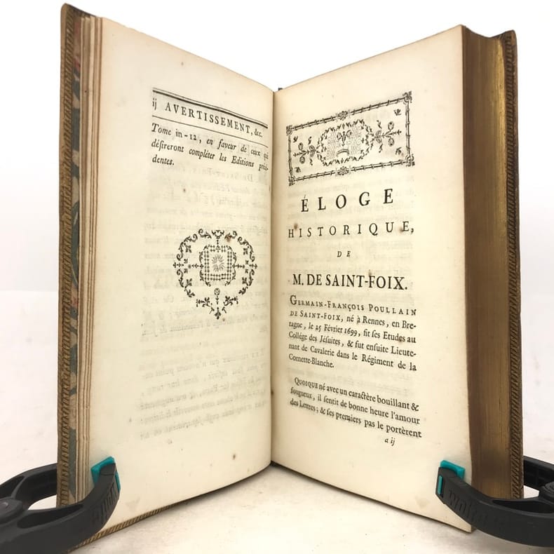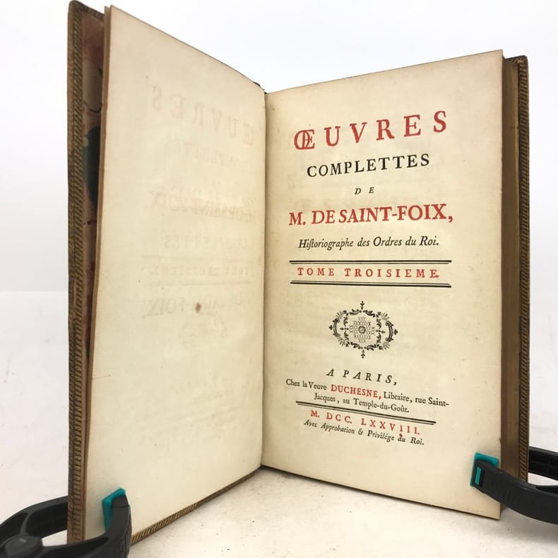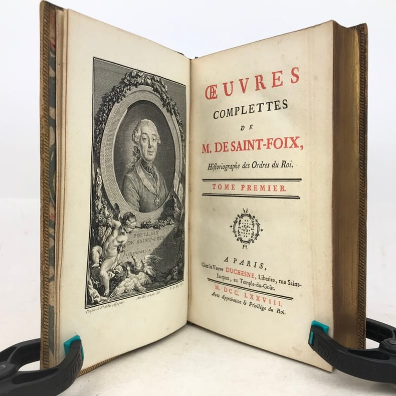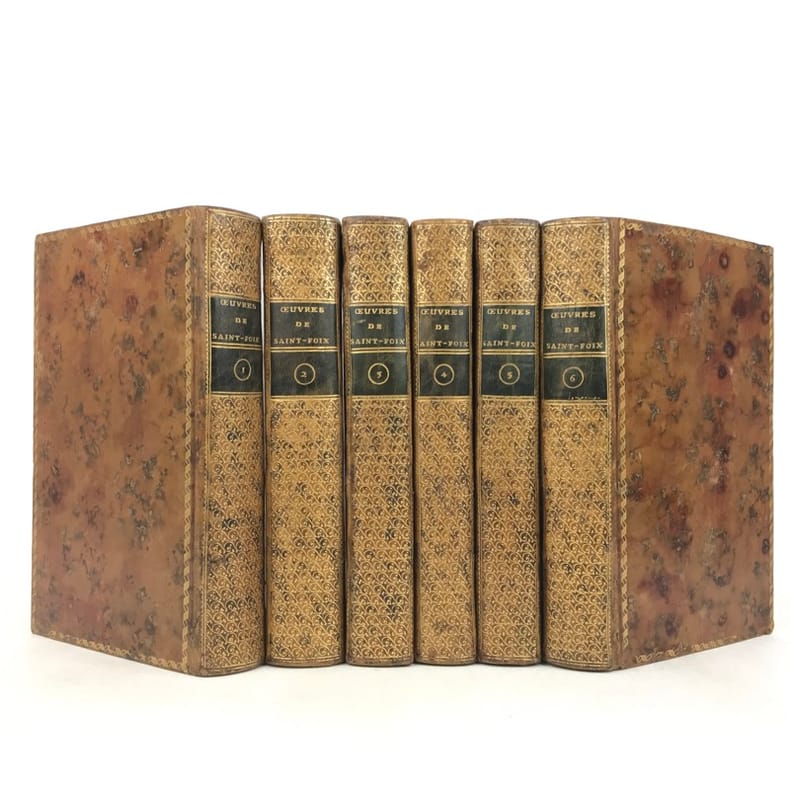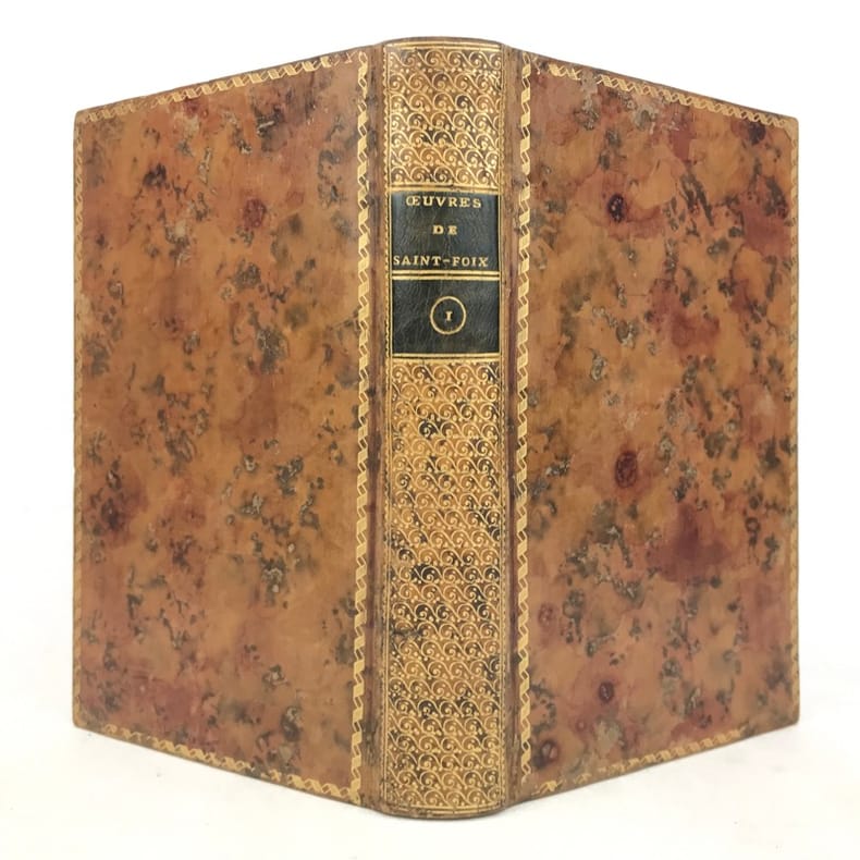6 volumes in-8 (20 cm x 12 cm), veau porphyre (reliure d’époque), dos lisse orné d'un décor doré à la grotesque, pièce de titre et de tomaison noires, roulette dorée en encadrement des plats, tranches dorées. [4]-xvi-594-[4] ; [4]-600 ; [4]-479-1 bl. ; [4]-462 ; [4]-472 ; [4]-524 pages (complet). Légers frottements à la reliure, épidermures, claires rousseurs. État très correct. Première édition collective illustrée d’un portrait de l’auteur en frontispice du tome I, ainsi que d’un frontispice et une planche hors-texte dans le tome II par Marilier. Poullain de Saint-Foix (1698-1776), d’esprit très querelleur, fut autant connu pour ses duels que pour ses productions littéraires ; il fut nommé en 1764 historiographe de l’ordre du Saint-Esprit. Cette collection recueillie après sa mort se compose ainsi : tome I et II, Théâtre et les Lettres turques ; tome III-V, Essais historiques sur Paris ; tome VI, Histoire de l’ordre du Saint-Esprit. En tête du premier volume, se trouve également un Éloge historique de l’auteur. Bel exemplaire.