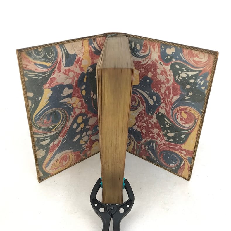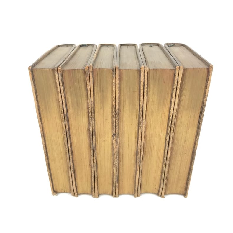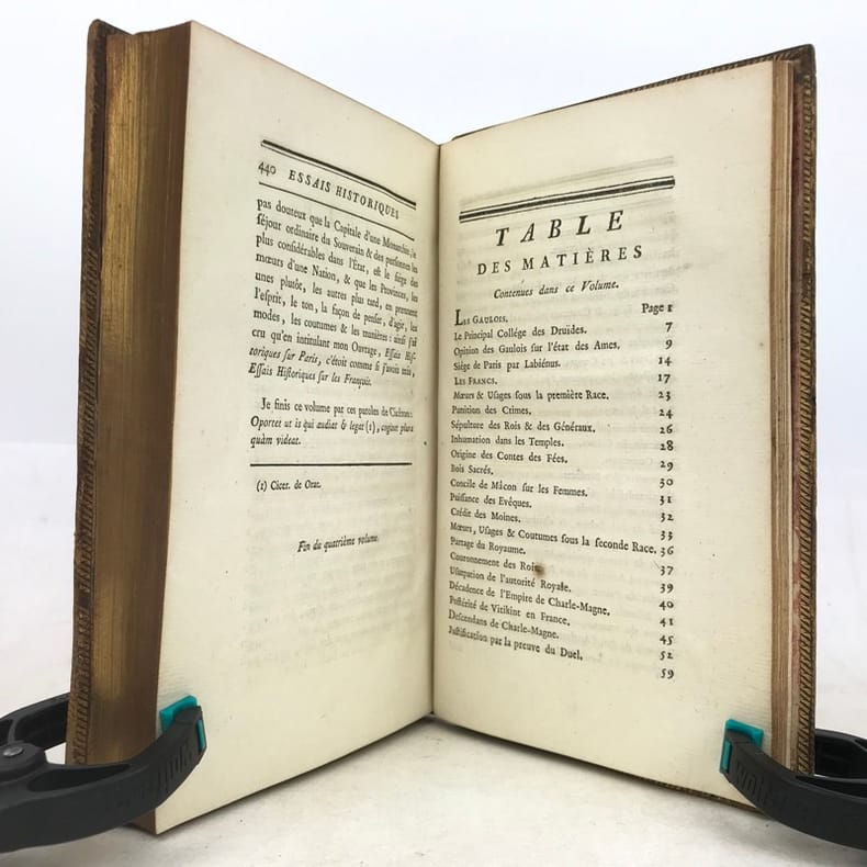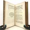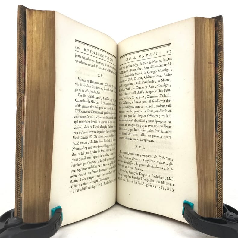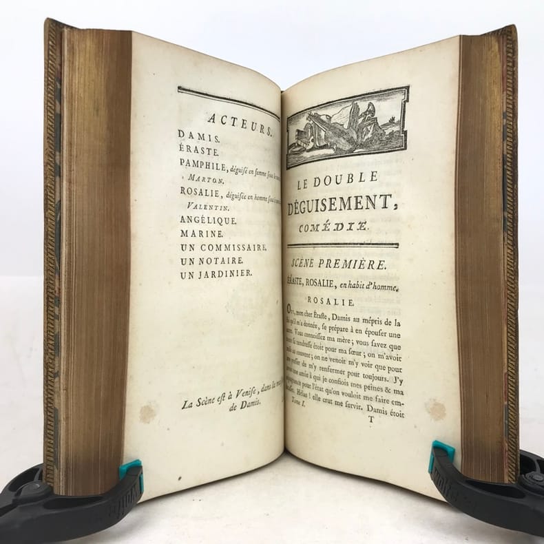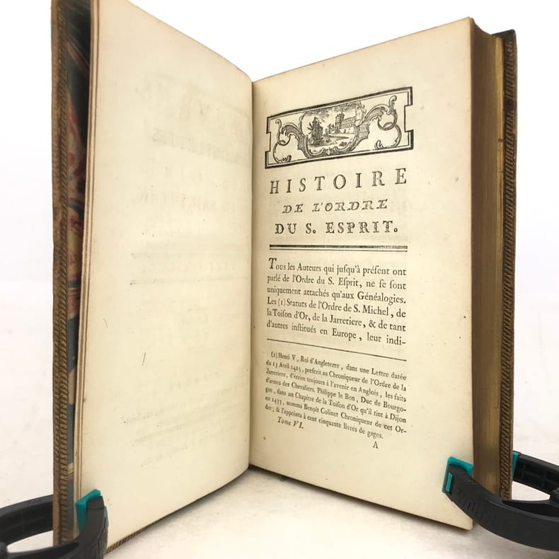 6 volumes in-8 (20 cm x 12 cm), veau porphyre (reliure d’époque), dos lisse orné d'un décor doré à la grotesque, pièce de titre et de tomaison noires, roulette dorée en encadrement des plats, tranches dorées. [4]-xvi-594-[4] ; [4]-600 ; [4]-479-1 bl. ; [4]-462 ; [4]-472 ; [4]-524 pages (complet). Légers frottements à la reliure, épidermures, claires rousseurs. État très correct. Première édition collective illustrée d’un portrait de l’auteur en frontispice du tome I, ainsi que d’un frontispice et une planche hors-texte dans le tome II par Marilier. Poullain de Saint-Foix (1698-1776), d’esprit très querelleur, fut autant connu pour ses duels que pour ses productions littéraires ; il fut nommé en 1764 historiographe de l’ordre du Saint-Esprit. Cette collection recueillie après sa mort se compose ainsi : tome I et II, Théâtre et les Lettres turques ; tome III-V, Essais historiques sur Paris ; tome VI, Histoire de l’ordre du Saint-Esprit. En tête du premier volume, se trouve également un Éloge historique de l’auteur. Bel exemplaire.