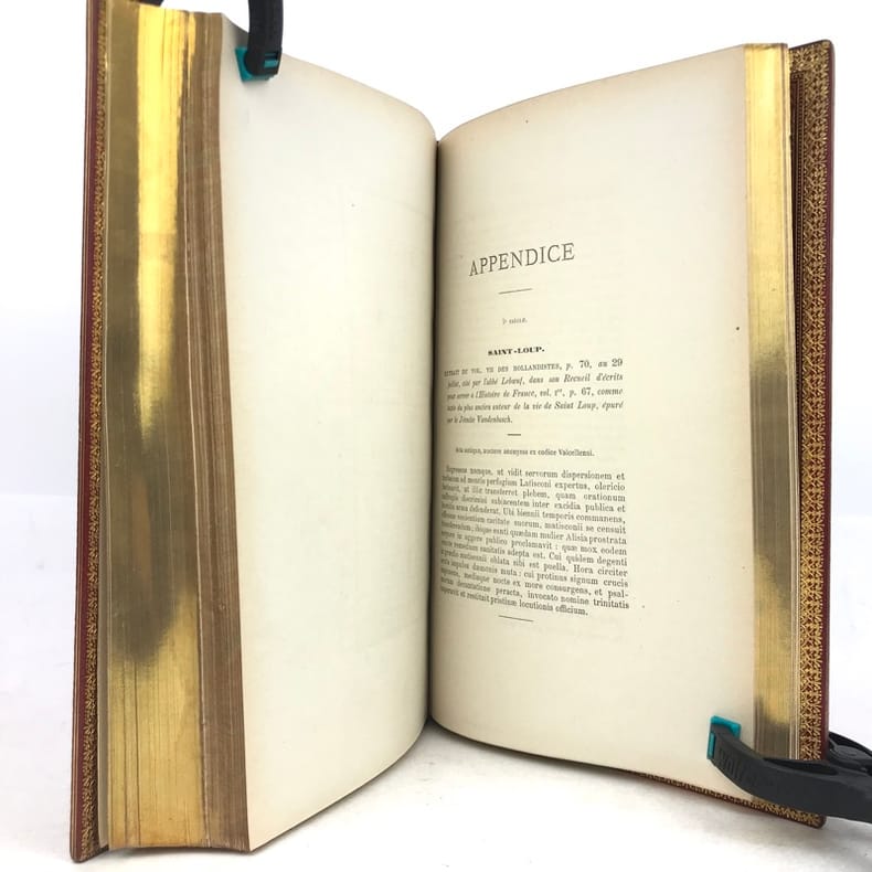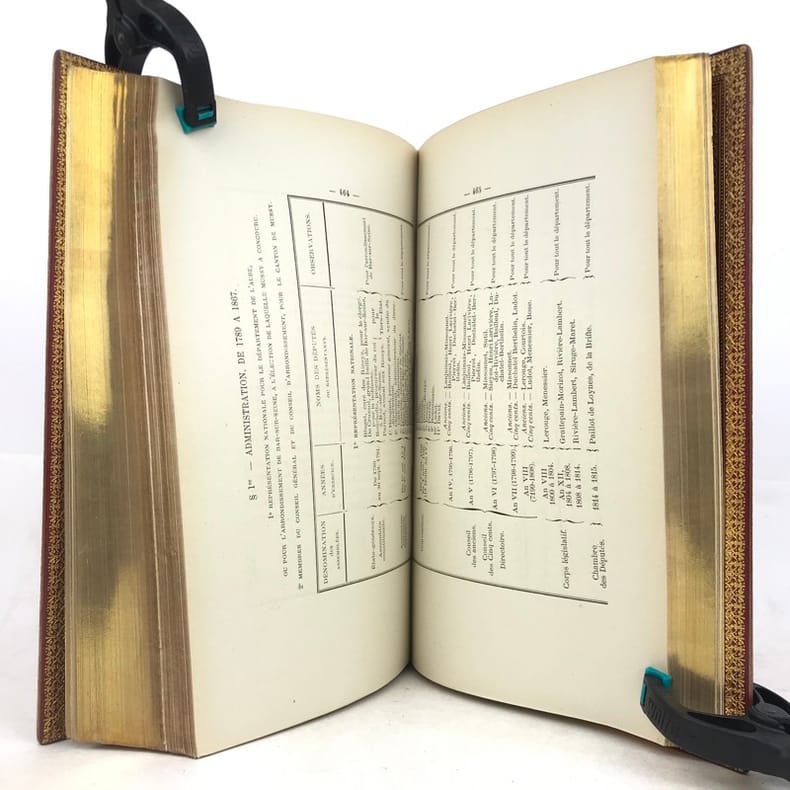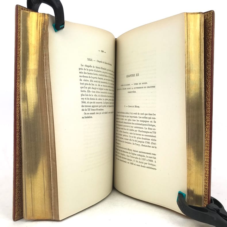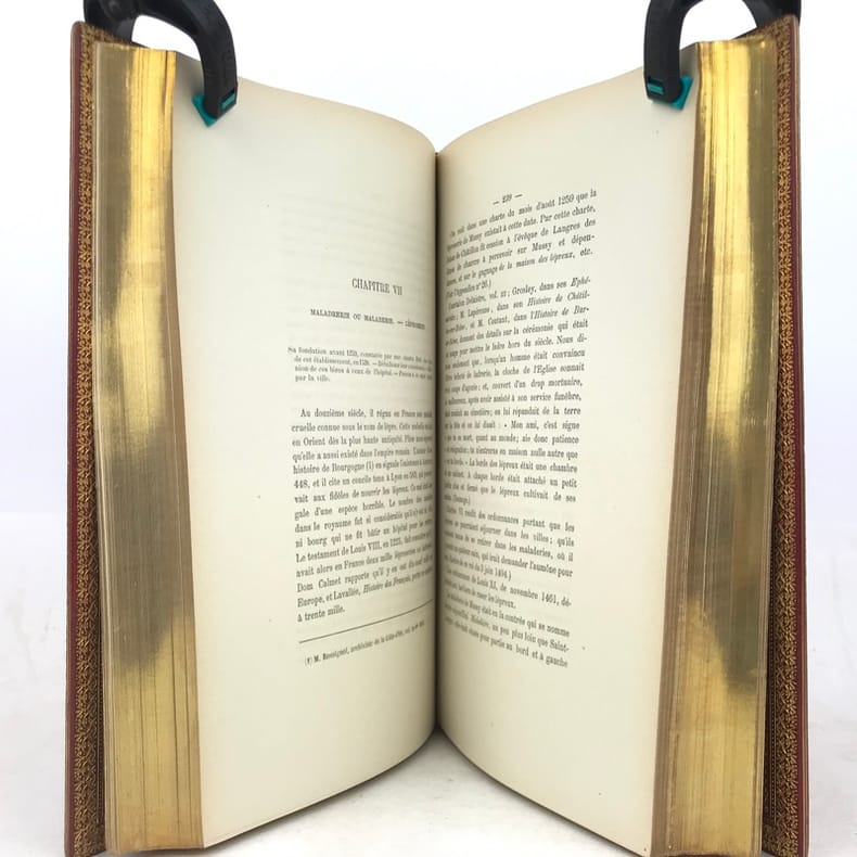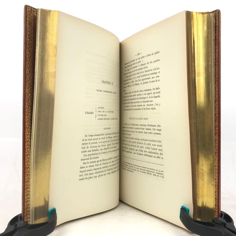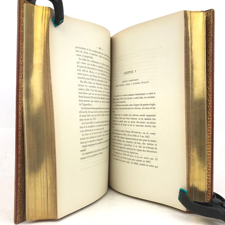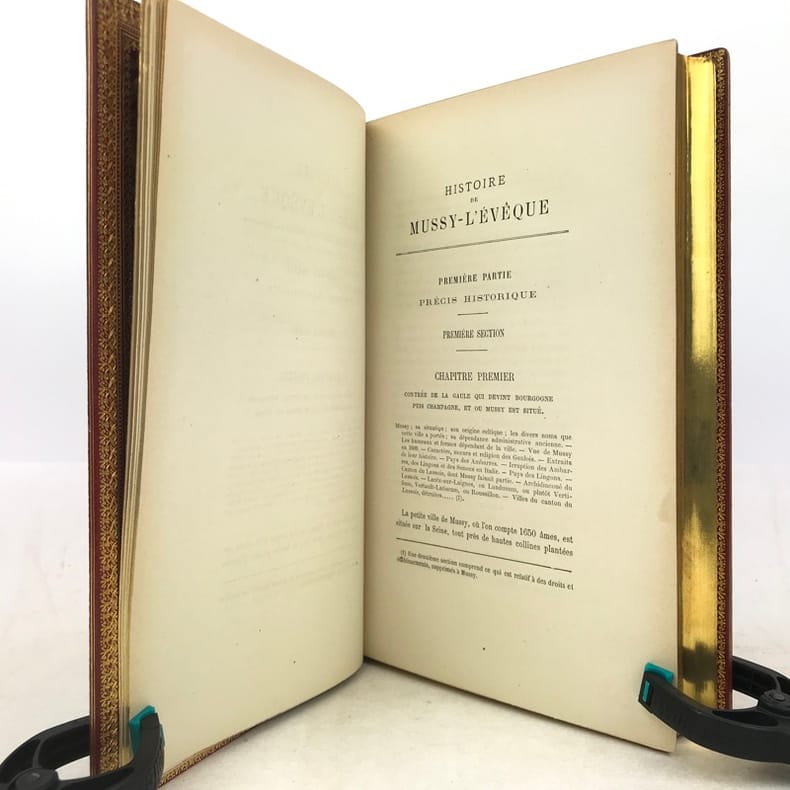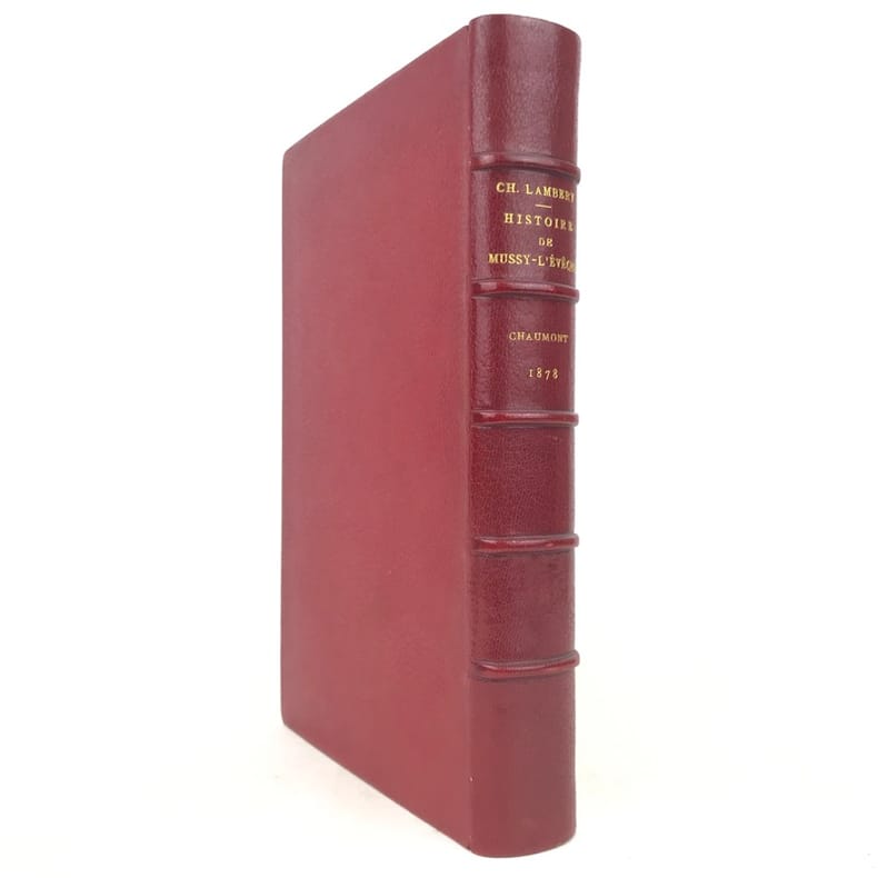 1 volume in-8 (24,5 x 16 cm), maroquin rouge (reliure de l’époque, signée David)), dos à nerfs, large dentelle intérieure dorée, tranches dorées. [4]-v-1bl.-637-1bl. pages (complet). Malgré un dos très légèrement bruni, l’ouvrage est en très bon état. ÉDITION ORIGINALE posthume de cet ouvrage sur Mussy-sur-Seine, actuellement à la frontière de l'Aube et de la Côte-d'Or, qui appartint d'abord à la Bourgogne, puis à la Champagne. Lambert, qui en est originaire, en présente l'histoire, les statistiques et les biographies locales. Charles-Auguste-Joseph Lambert (1786-1876), ancien chef de division à la direction générale de l’enregistrement et des domaines, chevalier de la légion d’honneur. Bel exemplaire dans une reliure bien établie par David.