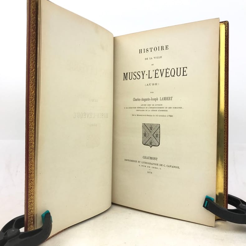 Unique édition, posthume. Une explication est nécessaire pour comprendre le toponyme utilisé : actuellement Mussy-l'Evêque est une commune du département de la Moselle, et la ville qui fait l'objet de notre monographie est en fait Mussy-sur-Seine, nom qu'elle porte depuis la Révolution. Mais elle se dénommait aussi Mussy-l'Evêque avant la Révolution (parce que dépendante de l'évêque de Langres). Le choix étrange d'une dénomination prêtant à la confusion s'explique mal de la part d'un auteur né sur place.En effet, Lambert, ancien "chef de division à la Direction générale de l'eneregistrement et des domaines", est-il expliqué sur la première couverture, est né à Mussy le 10 octobre 1786. Il mourut au demeurant à Paris le 23 mai 1876.Absent de Techener. Cf. AIGOIN (Louis) : Notice sur M. Ch. Lambert (Chaumont, 1887). - - VENTE PAR CORRESPONDANCE UNIQUEMENT
