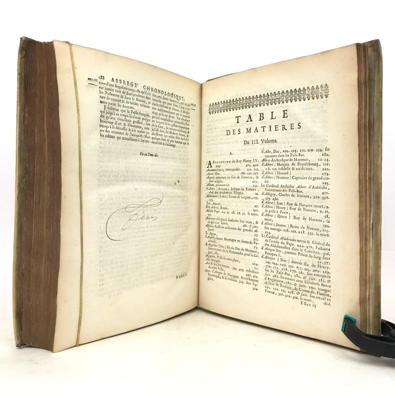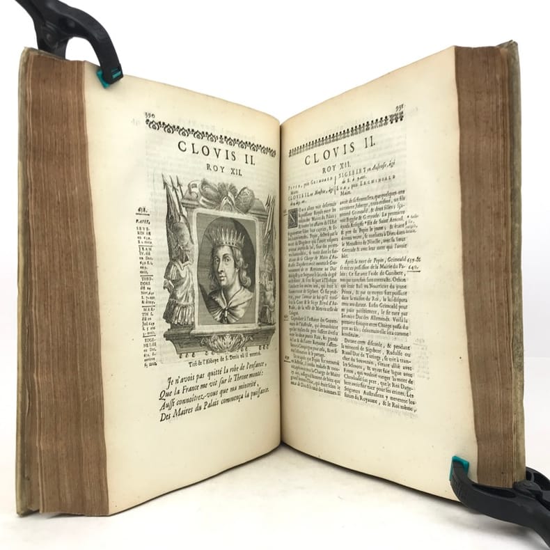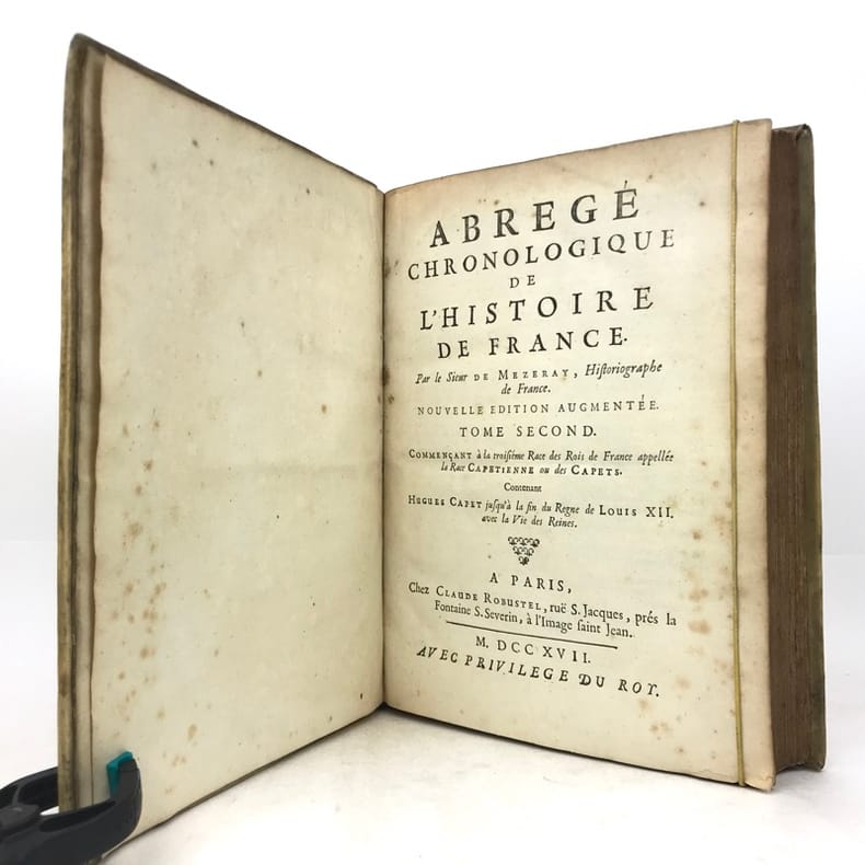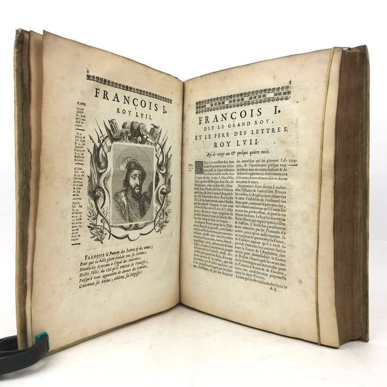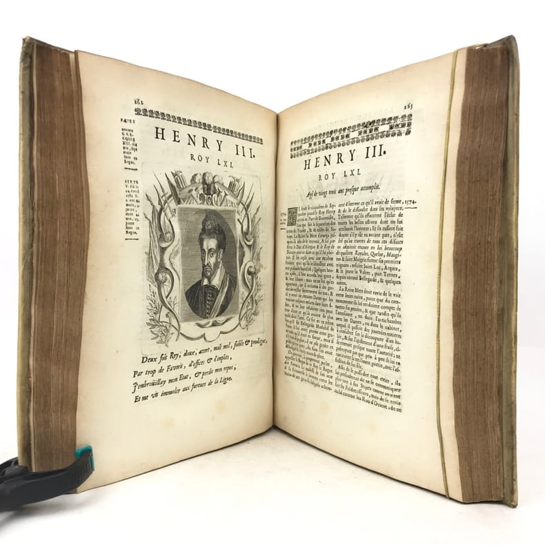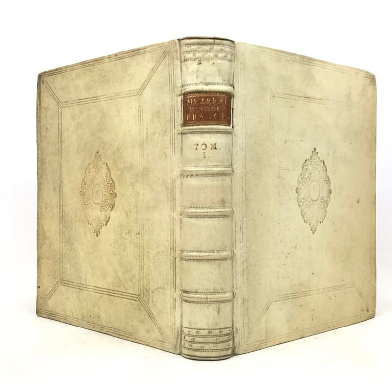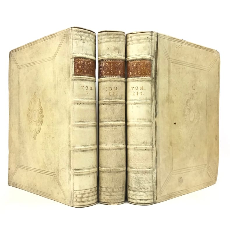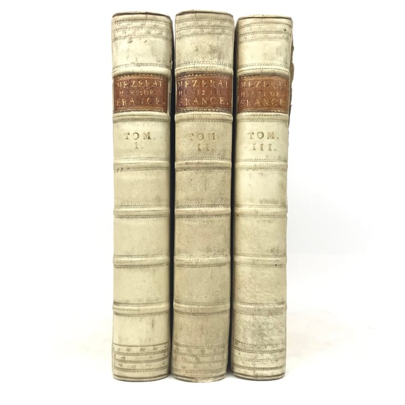 3 volumes in-4 (25 x 19,5 cm), vélin rigide (reliure de l’époque), dos à nerfs, pièce de titre en maroquin fauve, décor à froid sur les plats, tranches mouchetées, texte sur double colonne, [8]-612-[44] ; [4]-647-[51] ; [4]-588-[40] pages (complet). Mors supérieur du tome III frotté, quelques feuillets brunis, rousseurs. État correct. Nouvelle édition de cette version abrégée de l'Histoire de France, illustrée de 56 portraits in-texte, représentant les différents rois de France, jusqu’à Henri IV. François Eudes (1610-1683), sieur de Mézeray, est un historien et historiographe français, secrétaire perpétuel de l'Académie française. Cette nouvelle version de son ouvrage le plus célèbre, paru pour la première fois en 1648, faillit lui faire perdre sa pension royale. Atteignant presque 4000 milles annuels, elle fut d'abord diminuée, puis supprimée par Colbert, à cause de la liberté avec laquelle Mézeray avait parlé des finances, des impôts et des traitants. Bon exemplaire.