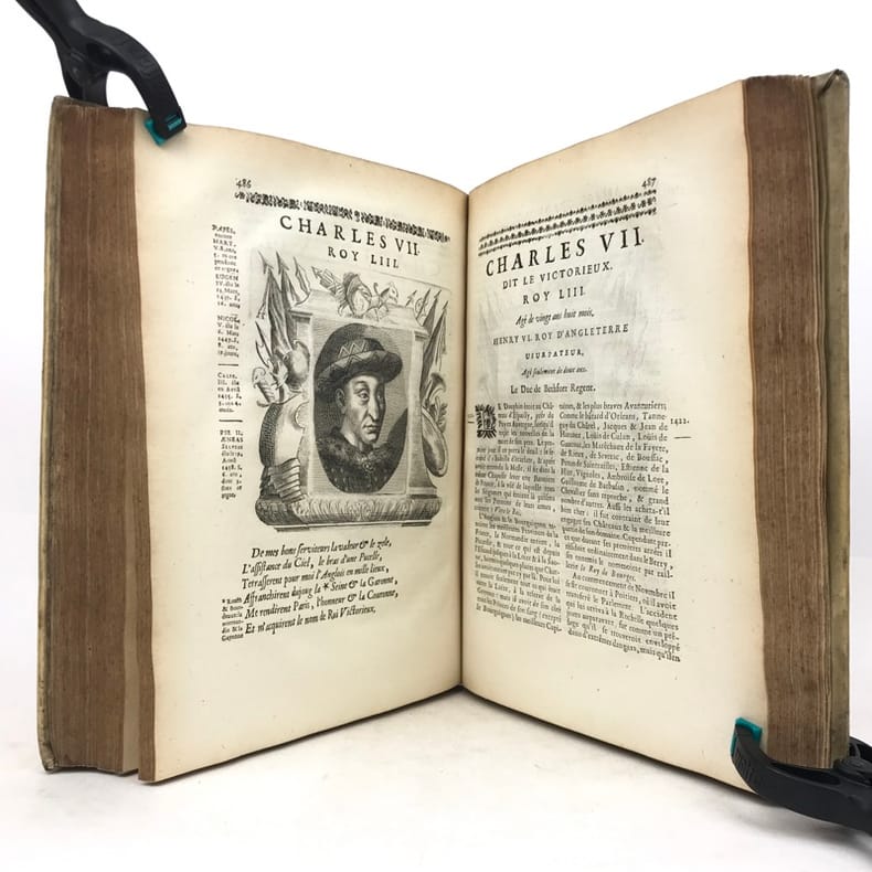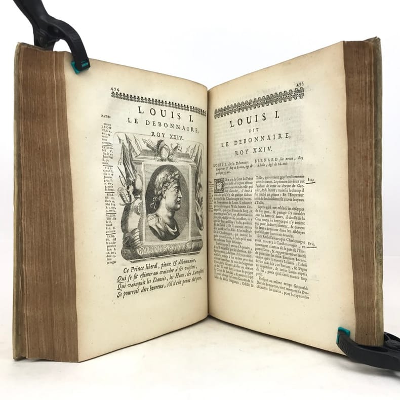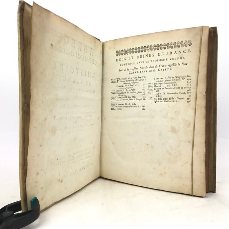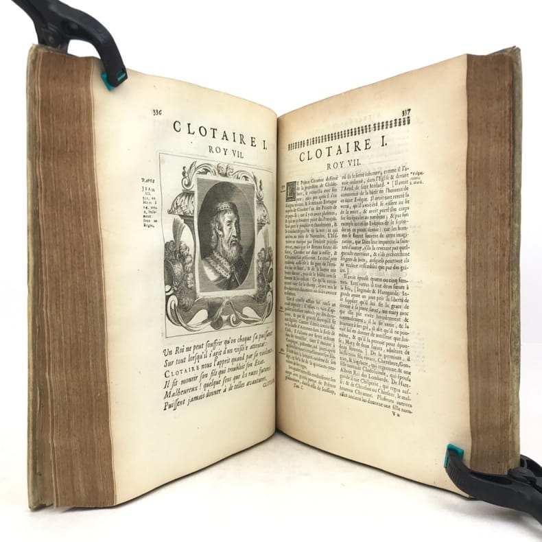"L'Abrégé de l'Histoire de France de François-Eudes de Mézeray, historiographe officiel, a été l'un des ouvrages les plus souvent réédités et les plus lus de l'Ancien Régime. Il fut publié pour la première fois en 1667-1668, en trois volumes in-4. Cette petite édition de 1698 a conservé les portraits gravés de la première édition (ils disparaîtront après celle de 1700). Tome 1 : Commençant à Faramond, & finiffant à la fin du Regne de Charlemagne. Tome 2: Commençant à Louis I. & finiffant à la fin du Regne de Philippe I. Tome 3: Commençant à Louis VI. & finiffant à la fin de Charles IV. Tome 4: Commençant à Philippe VI. & finiffant à la fin du Regne de Louis XI. Tome 5: Commençant à Charles VIII. & finiffant à la mort de Henry II. Tome 6: Commençant à François I I. & finiffant à la mort de Henry III. Tome 7: Contenant l'Histoire de Henry IV. Tome 8: Contenant la fuite de l'Histoire de Henry IV.