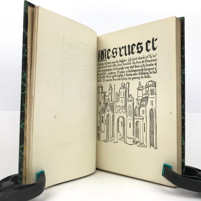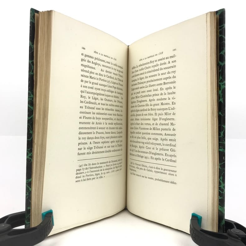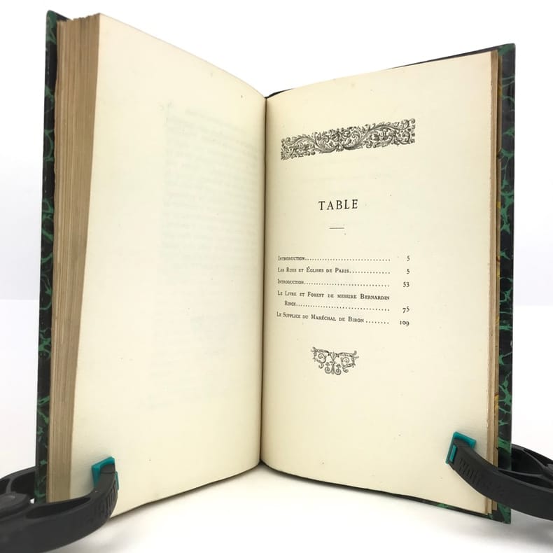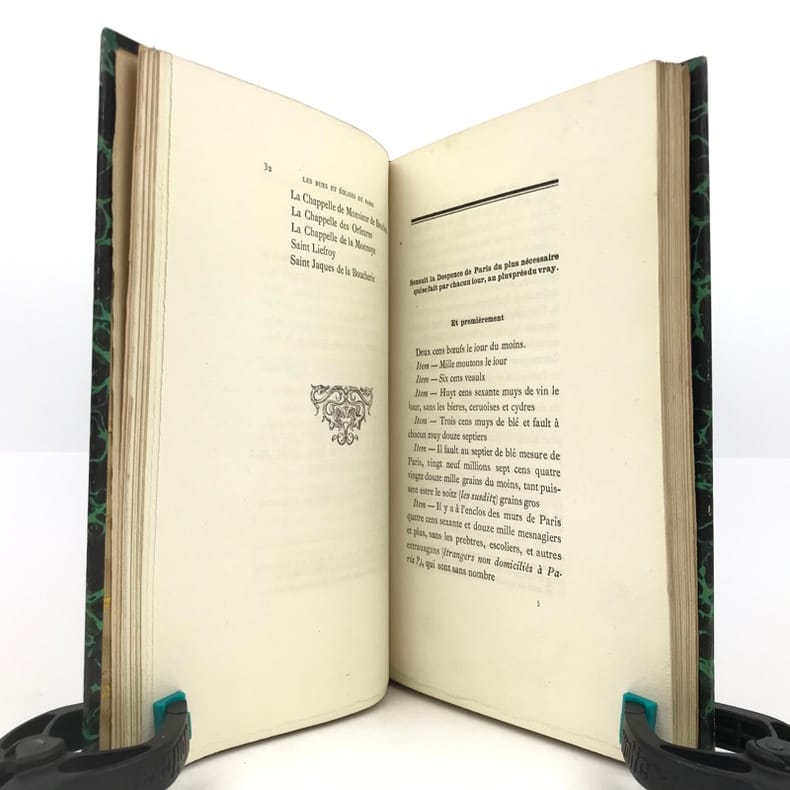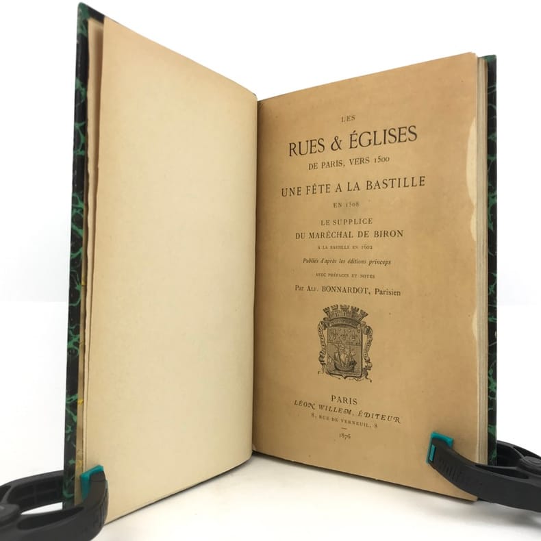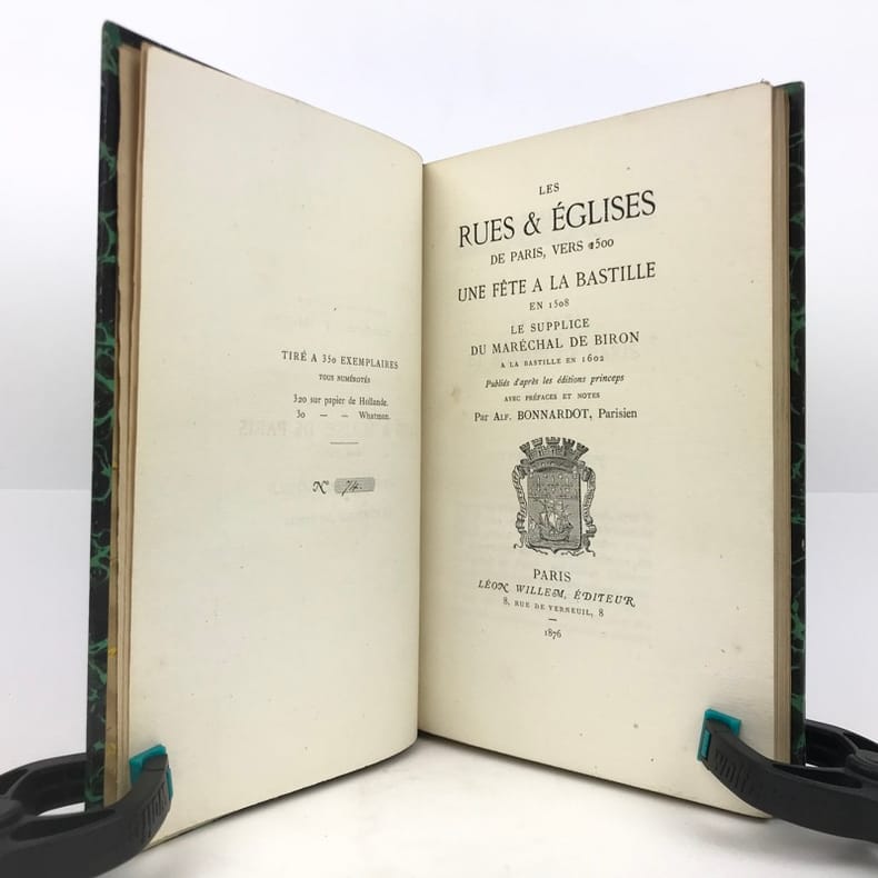 1 volume in-8 (20 x 13 cm), demi-maroquin vert à long grain (reliure de l’époque), dos à nerfs orné de filets et fleurons dorés, et monogramme C.C. doré en pied, tête mouchetée, couverture conservée. 139-[5] pages (complet). Petits frottements au dos de la reliure. Bon état. Recueil faisant partie de la collection "Des bibliophiles parisiens", orné de facs-similés à pleine page. Tirage à 350 exemplaires, celui-ci 1/320 sur papier de Hollande, (n°74). Alfred Bonnardot (1808-1884), historien de Paris, bibliophile, essayiste et dessinateur. Bon exemplaire.