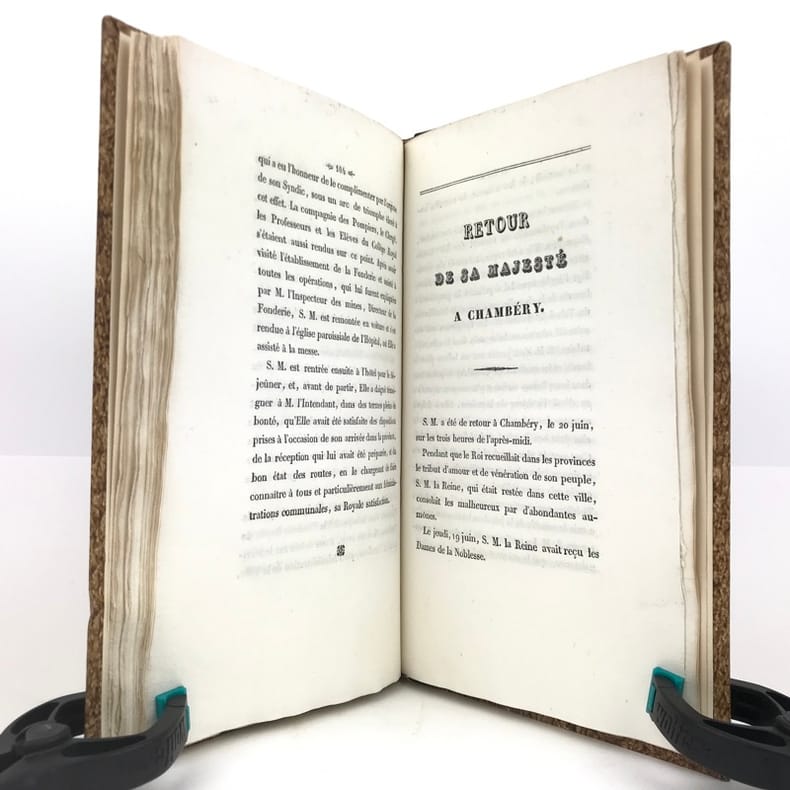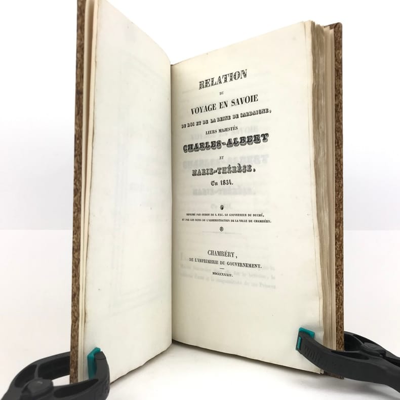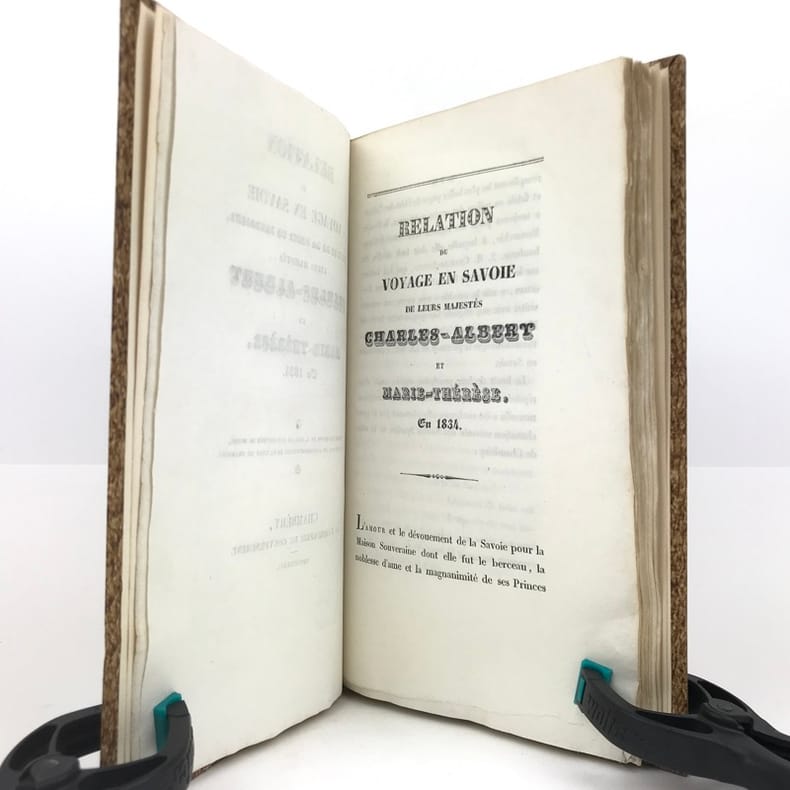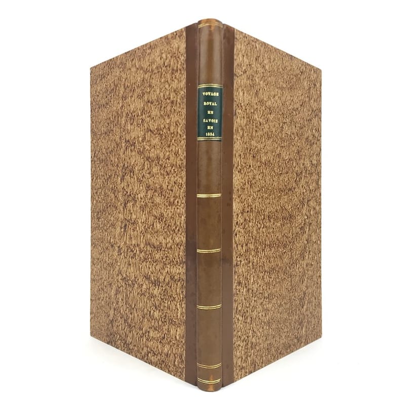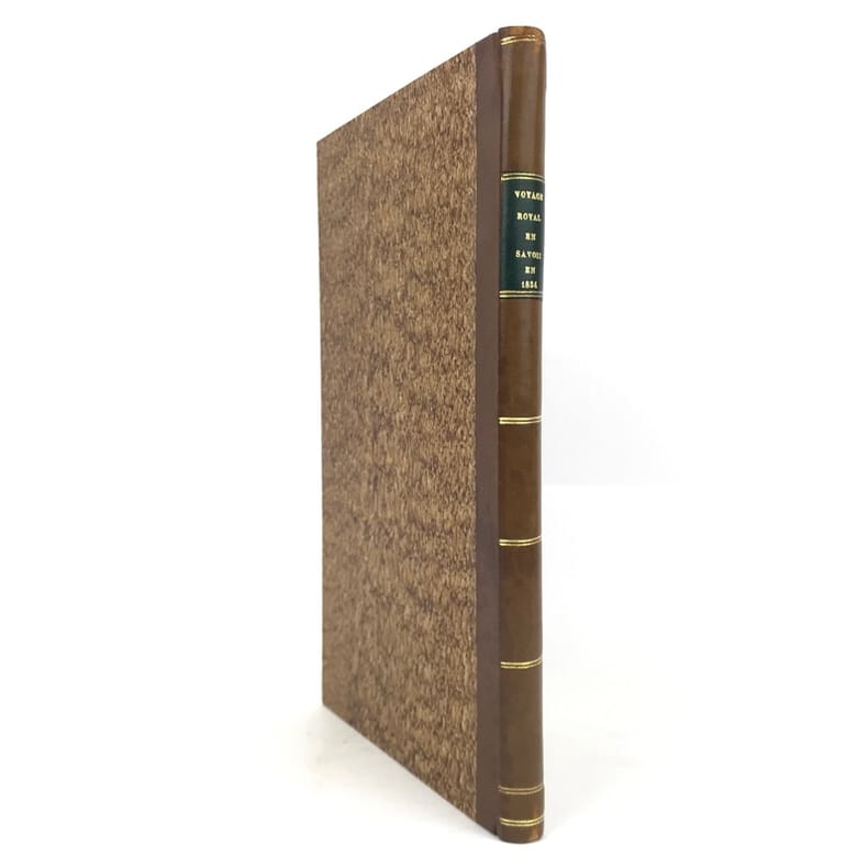 1 volume in-8 (22,7 x 13,5 cm), demi-basane fauve (reliure postérieure), dos lisse orné de filets dorés, pièce de titre brune, couverture et dos conservés. [4]-127-1bl. pages (complet). Dos un peu taché et frotté sur les coiffes. Première de couverture restaurée avec petits défauts, 2 feuillets mal reliés (pp. 77 à 80), placés entre les pp.68 et 69. État très correct.RARE ÉDITION ORIGINALE de ce récit du voyage en Savoie de Charles-Albert (roi de Sardaigne; 1798-1849) et de Marie-Thérèse de Habsbourg-Toscane (reine de Sardaigne; 1801-1855).“Cette relation raconte le voyage en Savoie du roi et de la reine de Sardaigne, en 1834, dans un style épique et cérémonieux. L'ouvrage dépeint les acclamations populaires, les hommages et la fidélité des habitants envers la monarchie, soulignant des thèmes comme l'honneur, l'amour et la bonté. Des détails tels que l'arc de triomphe et les pompiers évoquent la grandeur du cortège royal, tandis que les citations mettent en lumière les émotions partagées entre le souverain et son peuple. Publié sans auteur connu, il s'inscrit dans la tradition des récits officiels de voyages royaux, mêlant description des cérémonies et éloges envers le monarque” (Kwize).Bon exemplaire.
