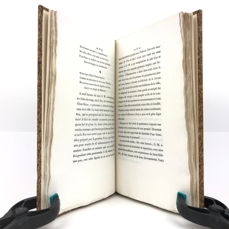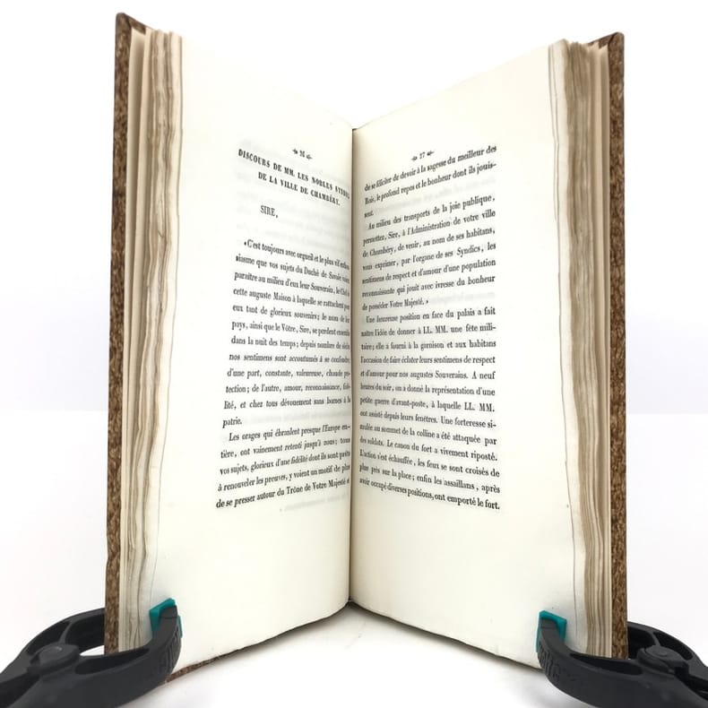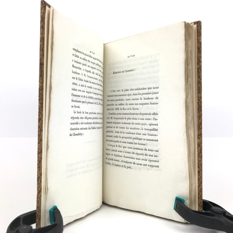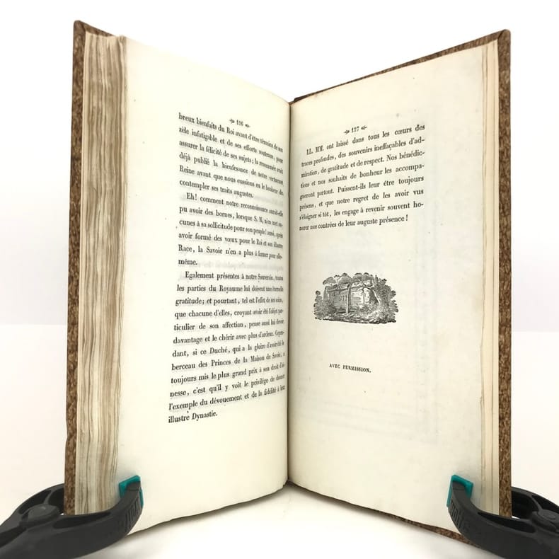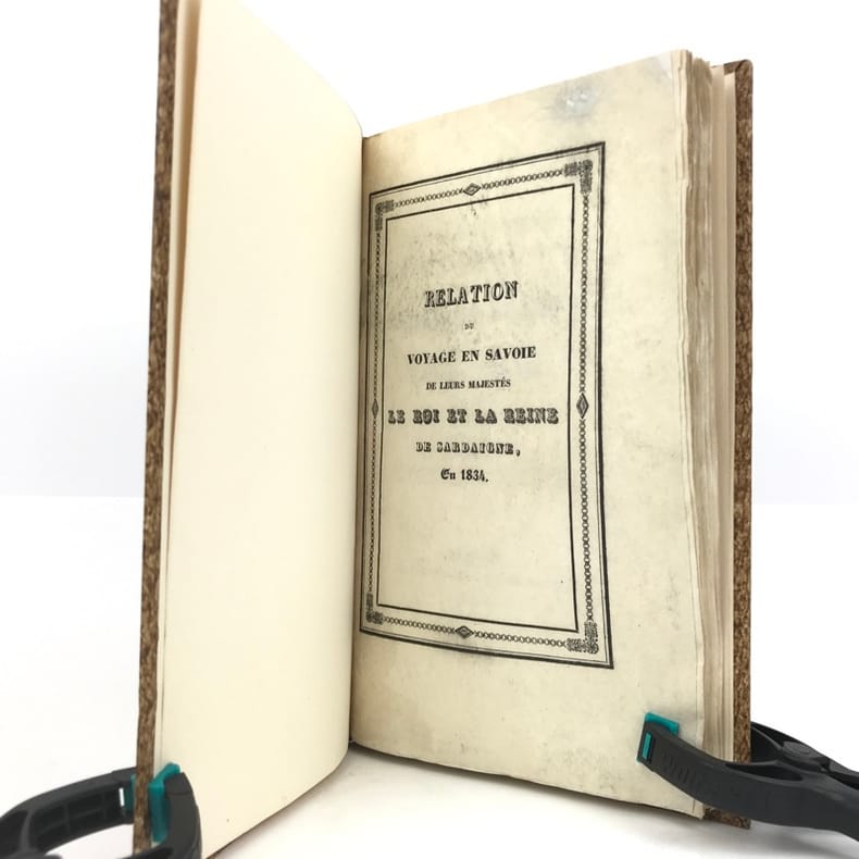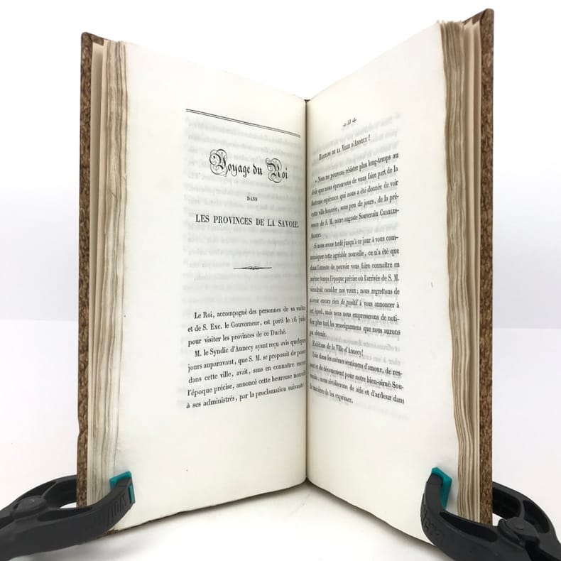 1 volume in-8 (22,7 x 13,5 cm), demi-basane fauve (reliure postérieure), dos lisse orné de filets dorés, pièce de titre brune, couverture et dos conservés. [4]-127-1bl. pages (complet). Dos un peu taché et frotté sur les coiffes. Première de couverture restaurée avec petits défauts, 2 feuillets mal reliés (pp. 77 à 80), placés entre les pp.68 et 69. État très correct.RARE ÉDITION ORIGINALE de ce récit du voyage en Savoie de Charles-Albert (roi de Sardaigne; 1798-1849) et de Marie-Thérèse de Habsbourg-Toscane (reine de Sardaigne; 1801-1855).“Cette relation raconte le voyage en Savoie du roi et de la reine de Sardaigne, en 1834, dans un style épique et cérémonieux. L'ouvrage dépeint les acclamations populaires, les hommages et la fidélité des habitants envers la monarchie, soulignant des thèmes comme l'honneur, l'amour et la bonté. Des détails tels que l'arc de triomphe et les pompiers évoquent la grandeur du cortège royal, tandis que les citations mettent en lumière les émotions partagées entre le souverain et son peuple. Publié sans auteur connu, il s'inscrit dans la tradition des récits officiels de voyages royaux, mêlant description des cérémonies et éloges envers le monarque” (Kwize).Bon exemplaire.
