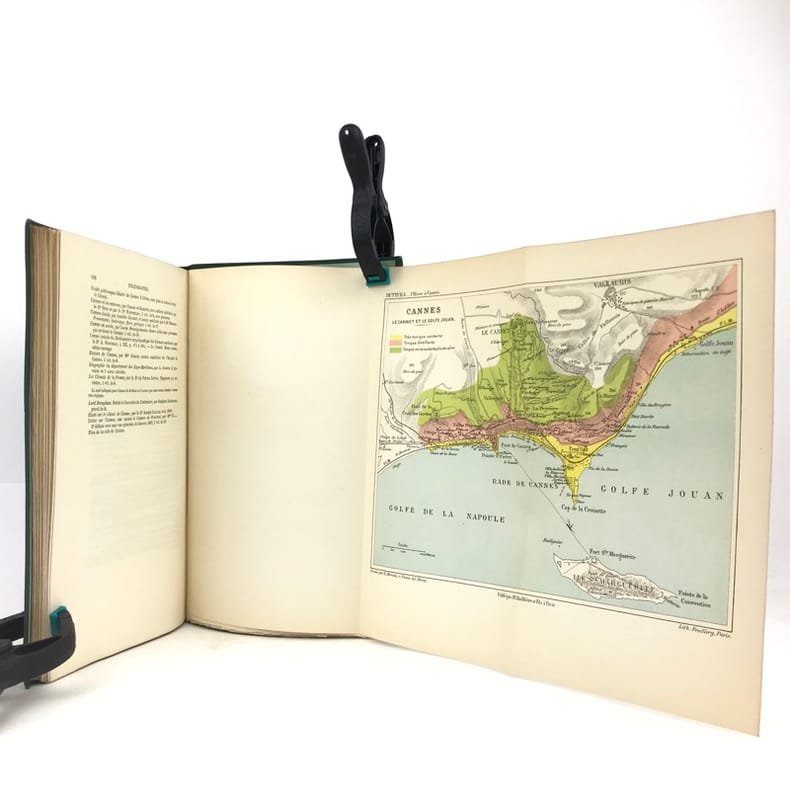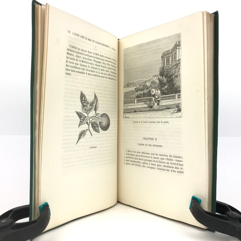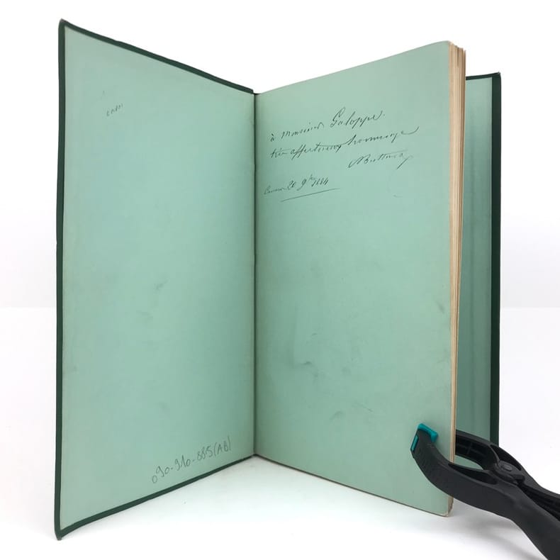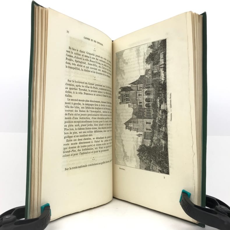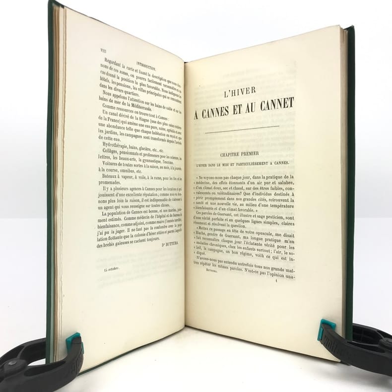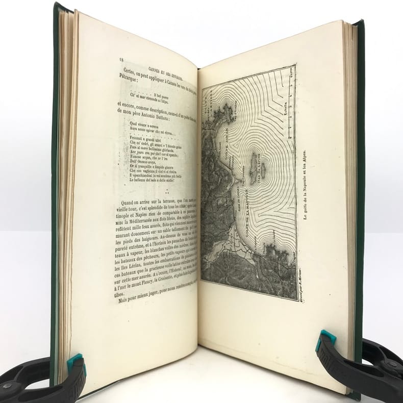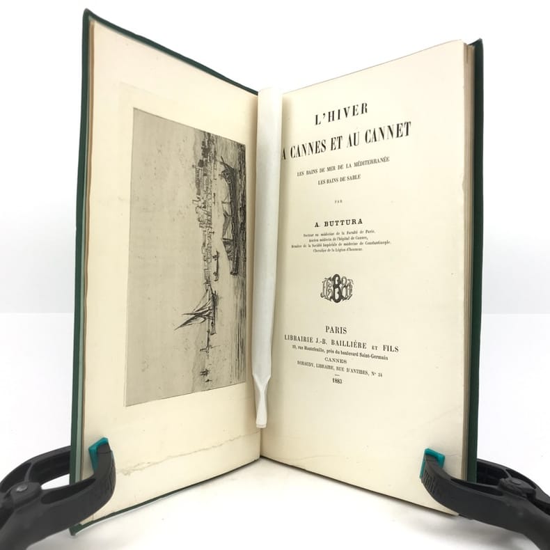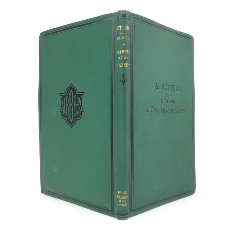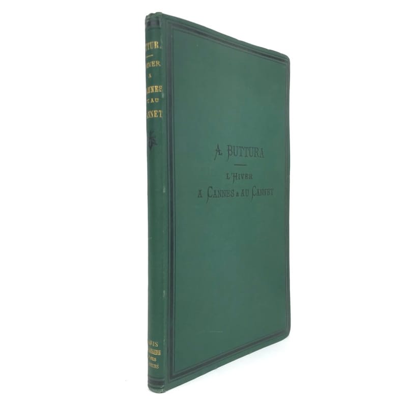 1 volume in-8, en partie non coupé (22 x 14 cm), bradel percaline verte (cartonnage de l’éditeur), dos lisse avec filets et fleuron à froid, auteur et titre dorés, filets à froid en encadrement sur les plats, avec auteur et titre à froid au centre du premier plat, médaillon à froid au centre du second plat, tête rouge, envoi autographe de l’auteur. viii-110-[2] pages (complet). Bon état. Nouvelle édition illustrée d’un frontispice et de 4 planches hors texte gravés sur cuivre, et d’une grande carte lithographiée en couleurs, titrée “Cannes, Le Cannet et le golfe Jouan”, et plusieurs vignettes in texte. La première fut publiée en 1867. Charles Antonin Buttura (1816-1894) docteur, établi comme médecin à l'hôpital de Cannes en 1860. Fils de Antonio Buttura (1770?-1832), littérateur italien; frère du peintre Eugène-Ferdinand Buttura (1812-1852), et père du peintre Ernest Buttura (1841-1920). Bon exemplaire portant un envoi autographe sur un feuillet de garde : À monsieur Galoppe / très affectueux hommage / Buttura / Cannes 20 9bre 1884.