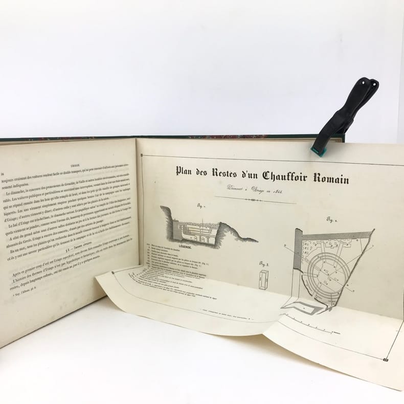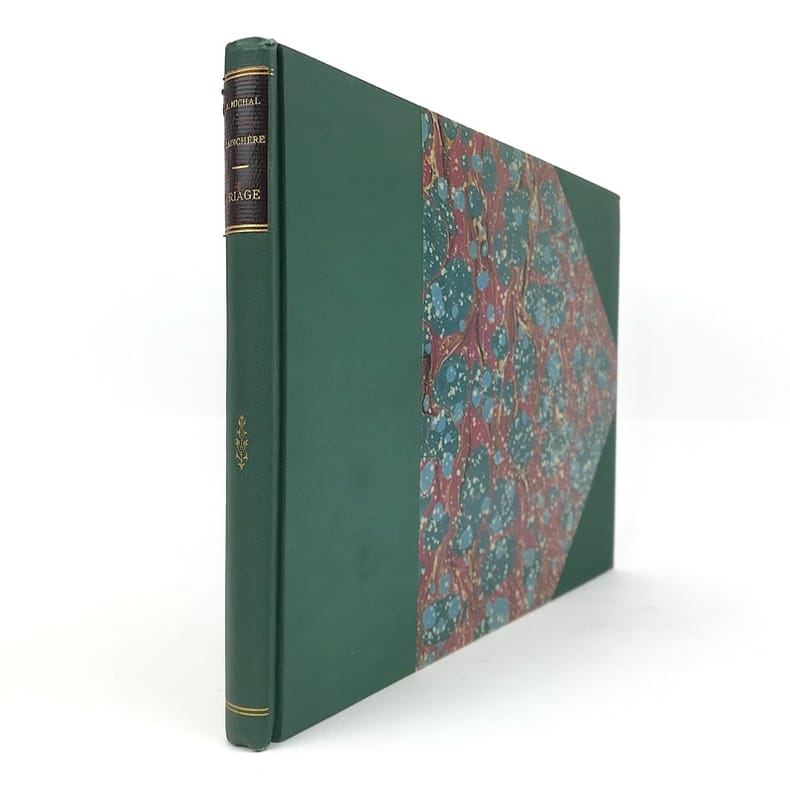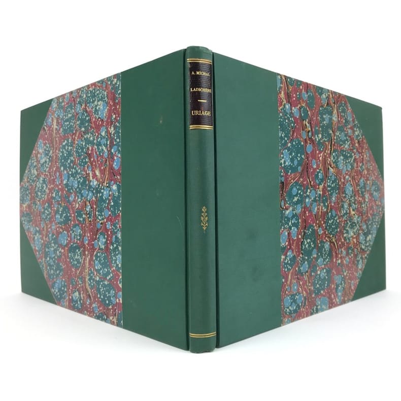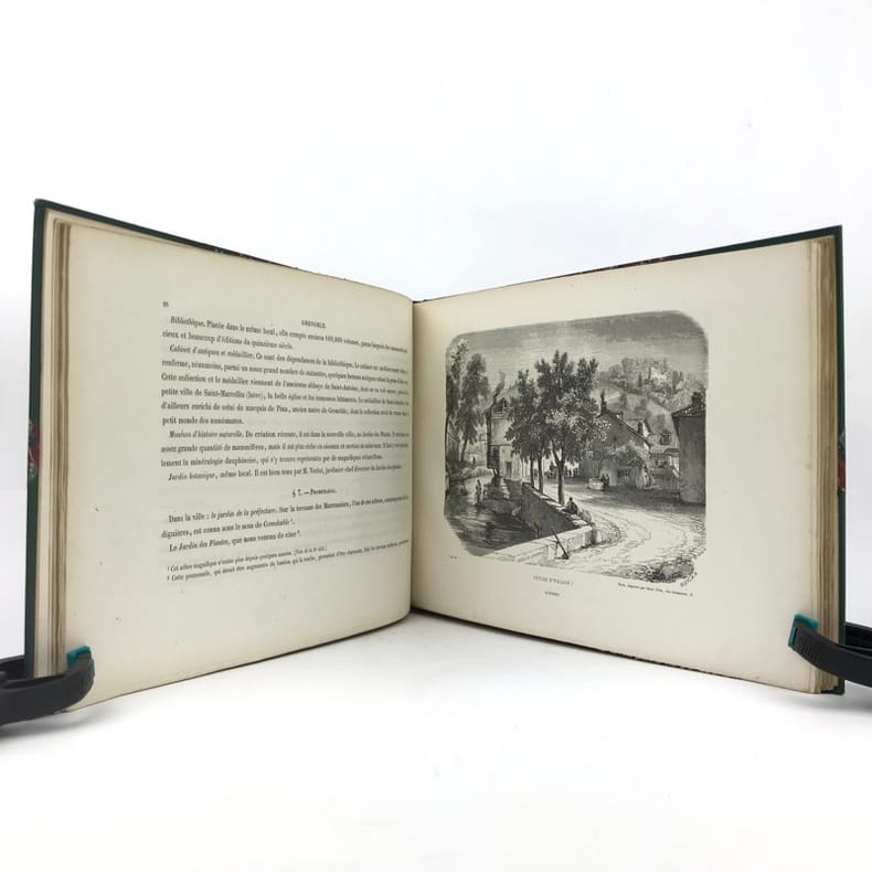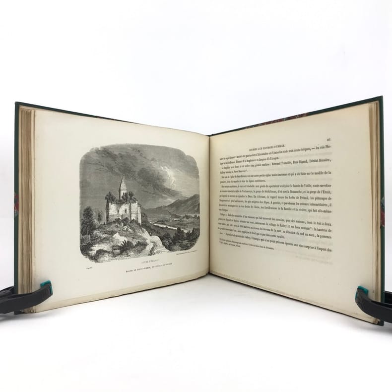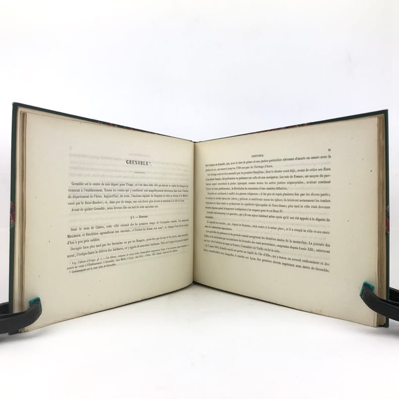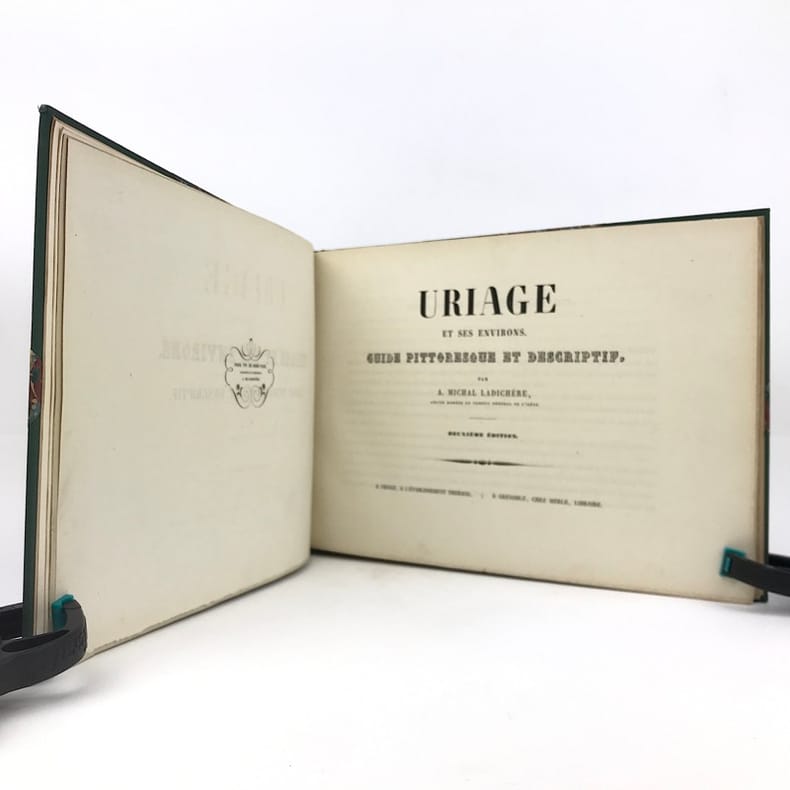 1 volume in-4 à l’italienne (19,5 x 28 cm), bradel demi-percaline verte à coins (cartonnage légèrement postérieure, signée Stroobants), dos lisse orné d’un fleuron et de filets dorés, pièce de titre brune, couverture illustrée et dos conservés. [4]-124 pages (complet). Petits frottements aux coiffes et aux coins. Bon état.Seconde édition avec l’introduction signée A.M.L., datée du 10 janvier 1859, à Grenoble; illustrée de 14 planches hors texte, avec des vues et des monuments d’Uriage et de ses environs, et d’un plan dépliant représentant les restes d’un chauffoir romain.François-Alexandre Michal-Ladichère (1807-1884), homme politique. Il fait son droit à la Faculté de Grenoble, prend place, en 1830, au barreau de la même ville, et acquiert bientôt, par ses capacités, une position influente. Partisan éclairé des idées républicaines, il devient l'un des chefs du parti démocratique, collabore aux journaux républicains le Dauphinois et le Patriote.Bon exemplaire.