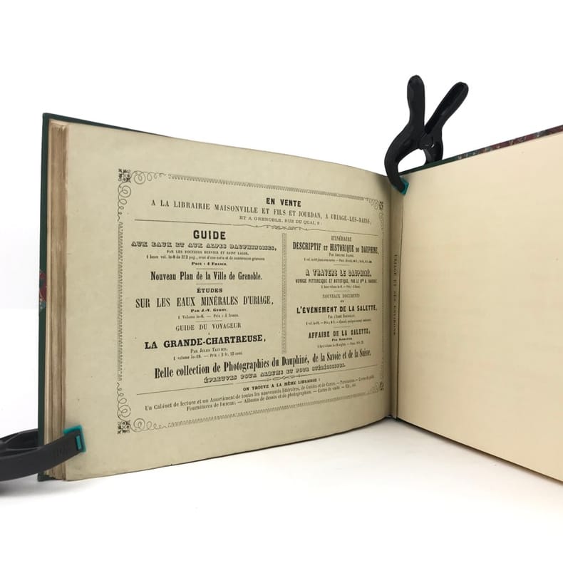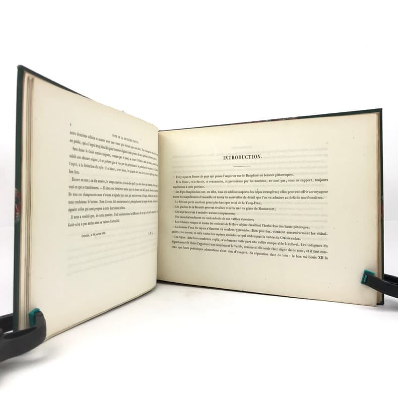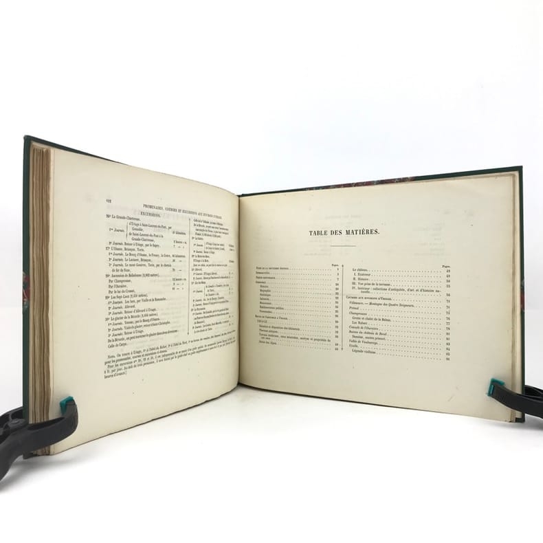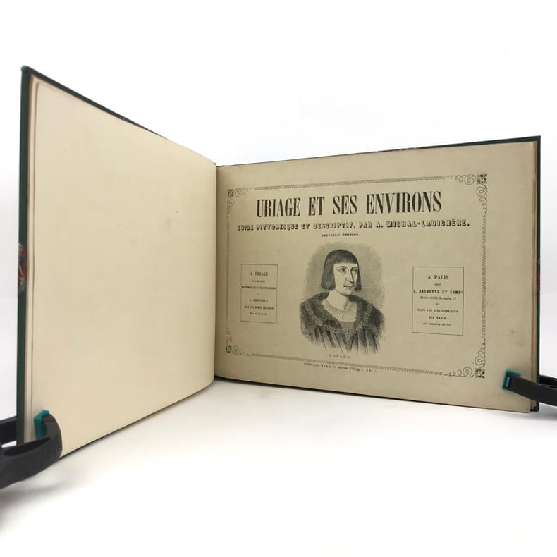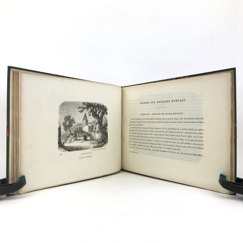 1859 1859 mentionné nouvelle édition sur la couverture. deuxième édition. ( 1859 ). se trouve à Uriage, à l'établissement thermal et à Grenoble, chez Merle libraire. Un volume in 8 oblong à l'italienne. couvertures illustrées beige de l'éditeur remontées sur cartonnage moderne. 124 pages. Un plan replié des restes du chauffoir romain, et 14 illustration hors texte protégées par des serpentes, comprenant l'église de St Firmin au-dessus de Vizille; le village de Lafrey; les ruines du chateau du Roi à Vizille; l'établissement d'Uriage, vu de la statue des Alpes; les ruines du chateau de Revel; une chaumière sur le chemin de la cascade; la vallée de La Romanche, vue de la croix de Séchilienne; Grenoble, vue des quatre Seigneurs; église de Villeneuve; chateau d'Uriage; le géant des Alpes; vue générale de l'établissement; buanderie d'Uriage; Gières; nota: la carte en couleurs des environs d'Uriage manque comme souvent. Bon exemplaire . intérieur parfait.