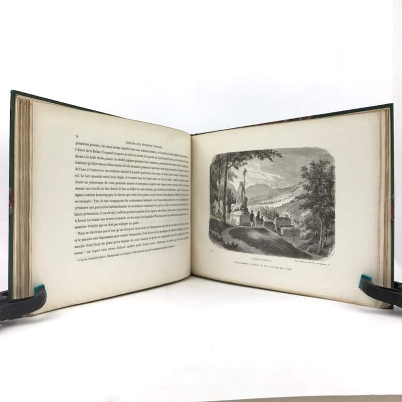 A Uriage, A l'établissement Thermal. A Grenoble, chez Vellot. A Paris, chez Gihault. A Lyon, chez Savy. Édition originale sans date (1850) - 446 pages.14 gravures sur 14 planches hors texte, un plan dépliant hors texte, couverture illustrée d'une gravure.Reliure demi-basane brune de l'époque. Dos à nerfs avec titre et auteur dorés. Coiffes et nerfs légèrement frottés. Mention "bibliothèque géographique" en pied du dos et cachet gratté sur le titre. Bon état. Format in-4°(19x27) Oblong.
