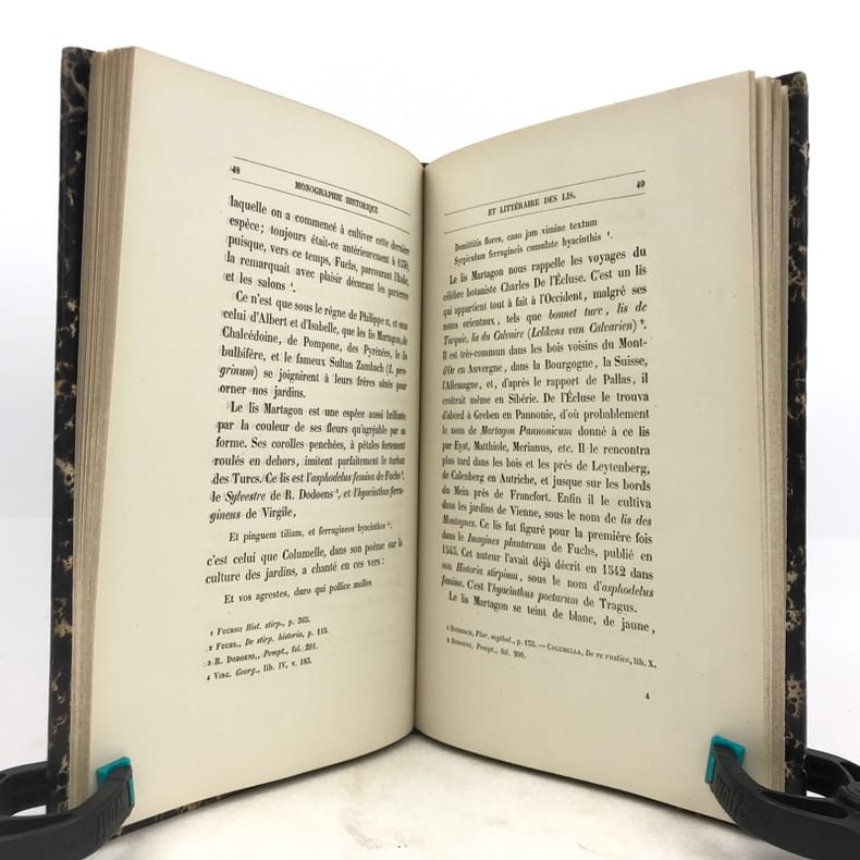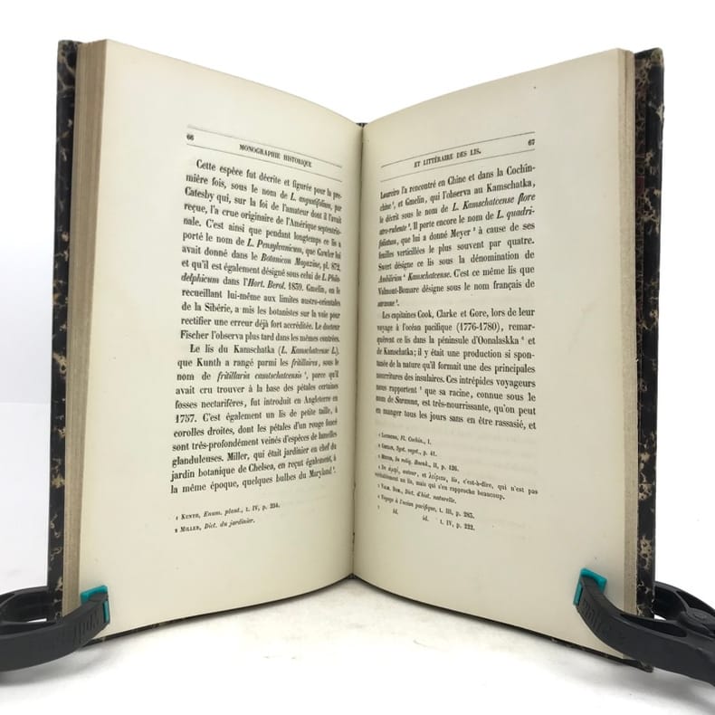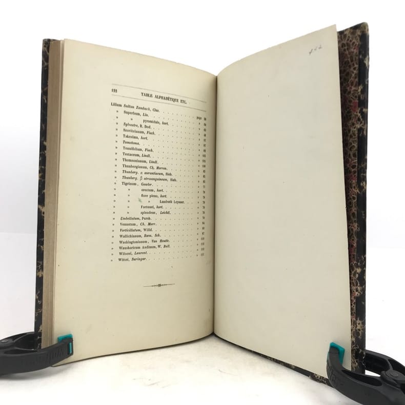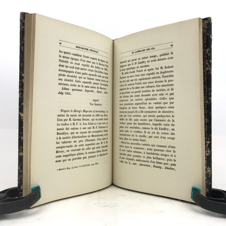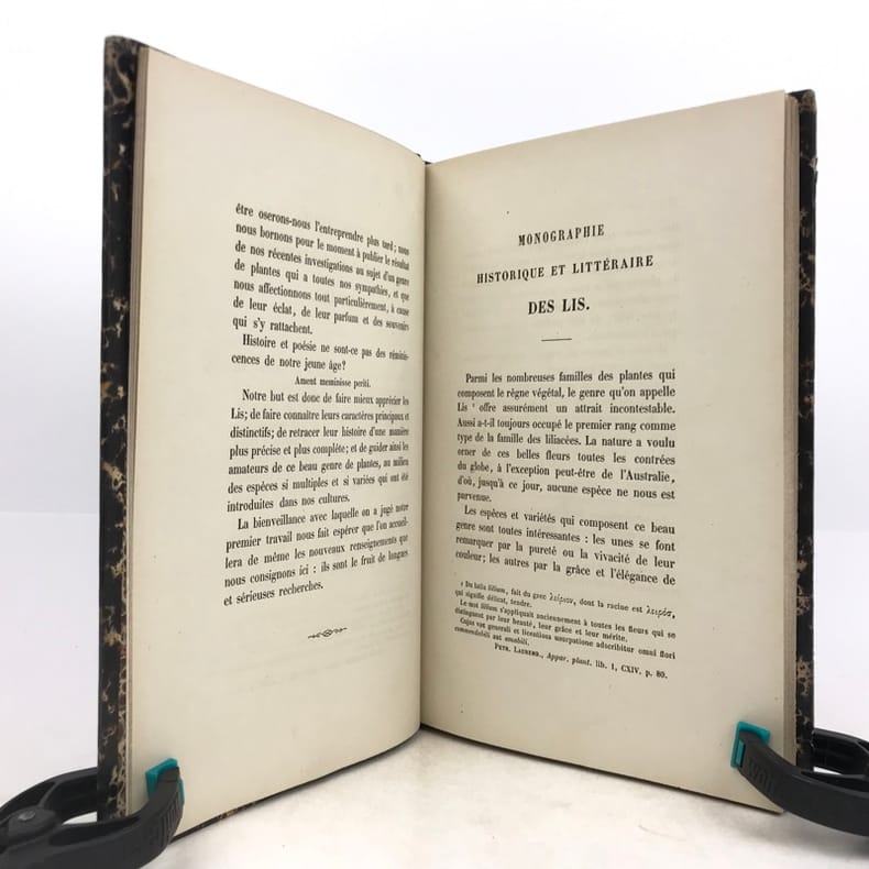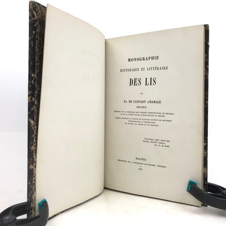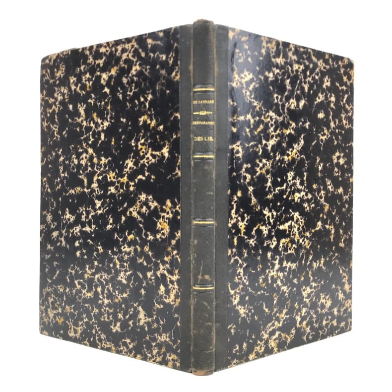 1 volume in-8 (22 x 14 cm), demi chagrin noir (reliure de l’époque), dos à nerfs orné, tranches mouchetées, 122 pages (complet). Mors frottés avec légère fente en tête du mors supérieur (2 cm). État correct. ÉDITION ORIGINALE. François de Cannart d'Hamale (1803-1888) est un diplomate et homme politique belge. Son seul ouvrage est cette curieuse monographie botanique portant sur les lys, leur culture et les différentes espèces existantes. Exemplaire portant un ENVOI AUTOGRAPHE de l’auteur à Jules de Hemptinne (1825-1922), industriel et homme politique belge. Bon exemplaire.