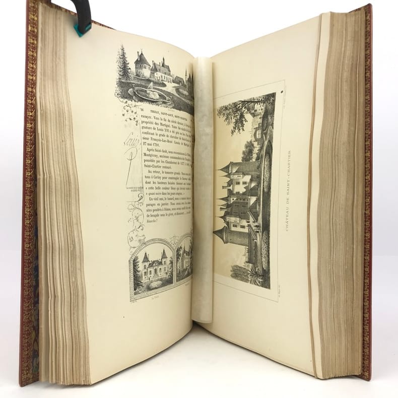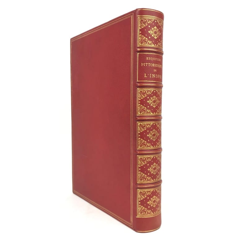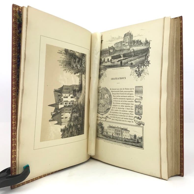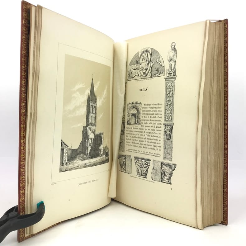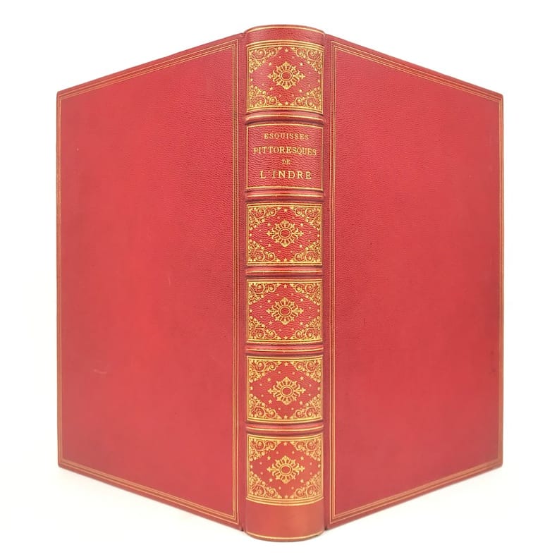 Châteauroux, Aupetit, 1882 in-4, IX-428 pp., texte encadré avec des illustrations, planches, index, demi-chagrin rouge, dos à nerfs orné, plats richement ornés, tête dorée (reliure de l'éditeur). Importantes taches d'humidité sur les plats, coupes et coins usés. Erreur de pagination pour les chiffres romains. Ex-libris portant le monogramme D.J.C.