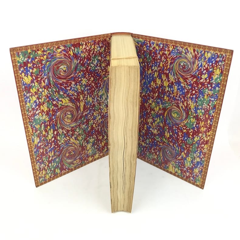 1 volume in-4 (29,5 x 21 cm), chagrin rouge (reliure de l’époque), dos à nerfs joliment orné aux petits fers dorés, triple filet doré en encadrement, dentelle dorée intérieure, tête dorée, ix-1bl.-428 pages (complet). Très bon état. Seconde édition illustrée d’un frontispice et de 40 planches lithographiées en 2 tons, et d’une carte à double page hors texte; texte dans des encadrements ornés de nombreuses vignettes, le tout d’après les dessins d’Isidore Meyer. La première fut publiée en 1854, chez Migné. Bel exemplaire.