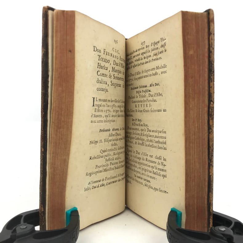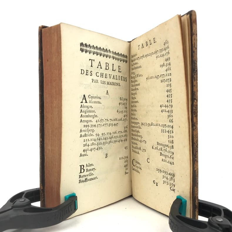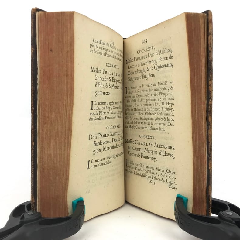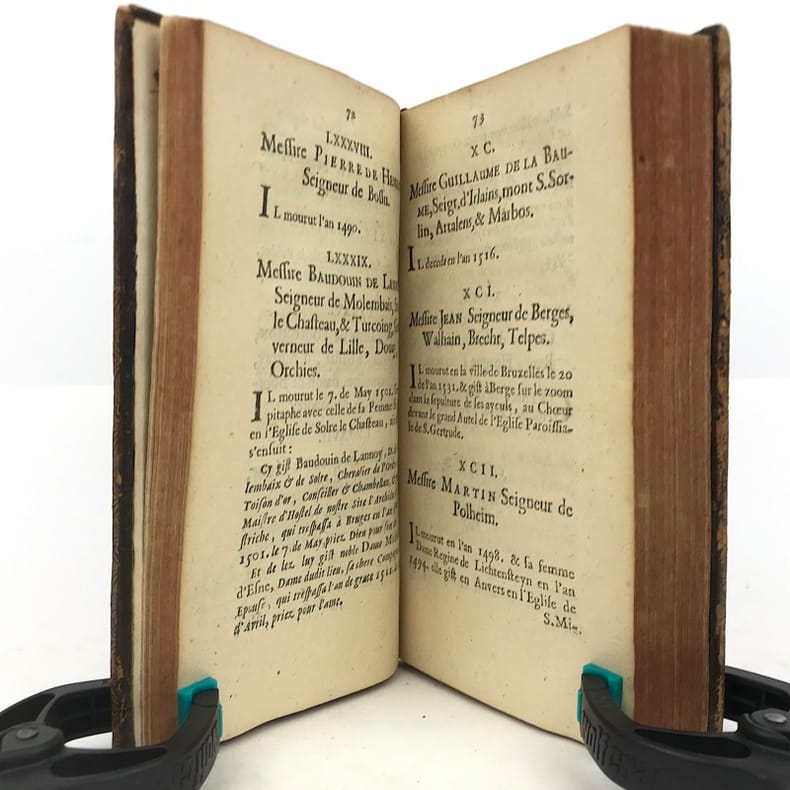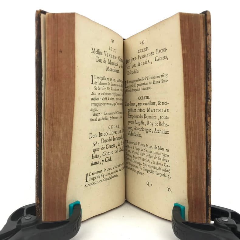 Amsterdam - Bruxellles Henri Desbordes - Gille Serstevens 1689 in 12 (16,5x10) 1 volume relié plein veau fauve, dos à nerfs orné de caissons dorés avec fleuron central, faux-titre, titre, 463 pages et 4 faux- feuillets de table non chiffrée. Contenant leur éloges, inscriptions, épitaphes, alliances, symboles, emblémes, médailles, devises, épithétes, et cris de guerre. La pièce de titre manque au dos, sinon bon exemplaire