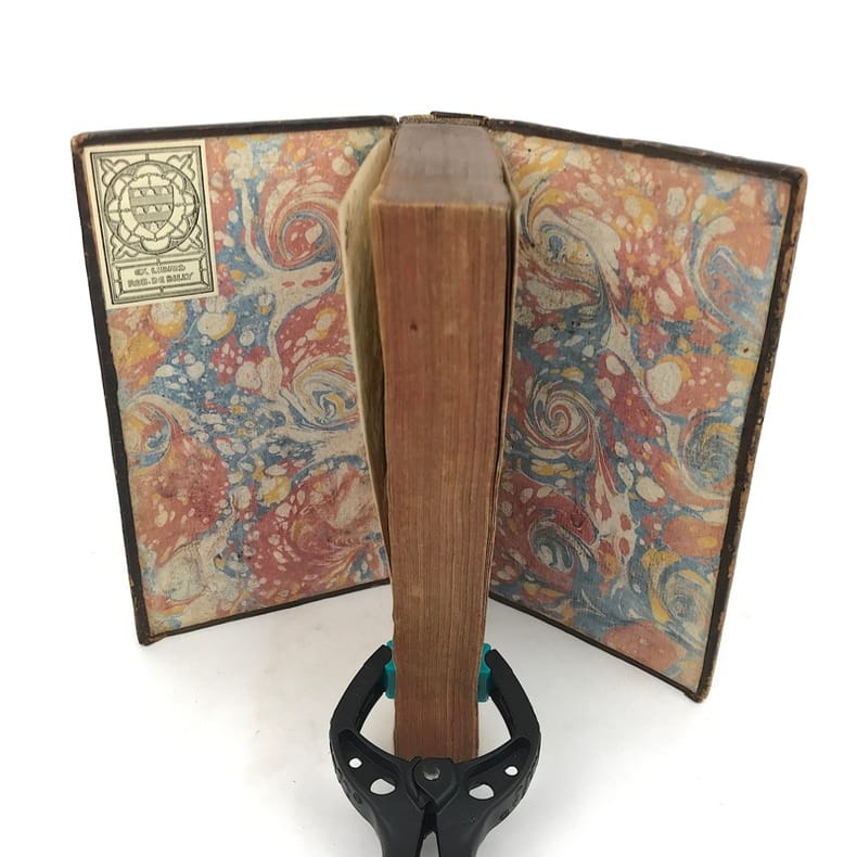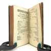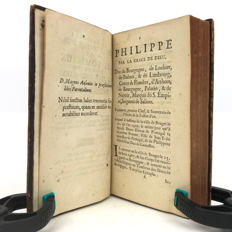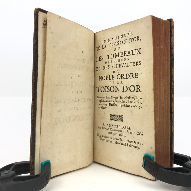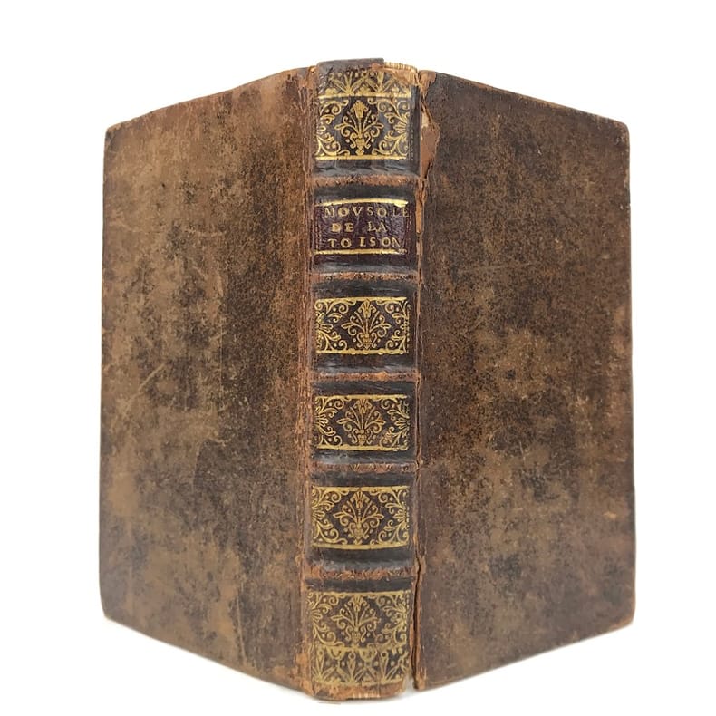 1 volume in-16 (16 x 9,5 cm), veau brun moucheté (reliure de l’époque), dos à nerfs orné, pièce de titre en maroquin grenat, roulette dorée sur les coupes, tranches rouges mouchetées, ex-libris de Rob. de Billy, [4]-463-[9] pages (complet). Reliure émoussée, mors supérieur fendu, coiffes découvertes, dorure du dos et pièce de titre restaurées, feuillets brunis et rousseurs. État correct tout de même. Curieux ouvrage anonyme, présentant la liste des chevaliers de la Toison d’Or, ordre de chevalerie fondé par le duc de Bourgogne Philippe le Bon en 1430. Il présente l’histoire de l’ordre, et détaille les tombeaux et sépultures de ses membres, notamment au sein de leur chapelle à Bruges, en Belgique. Rare exemplaire.