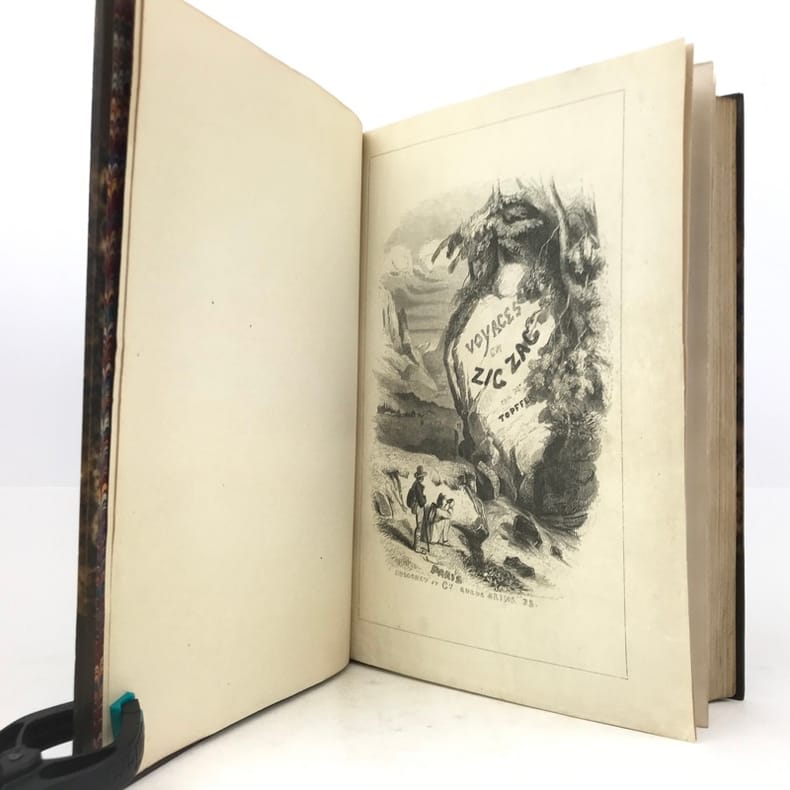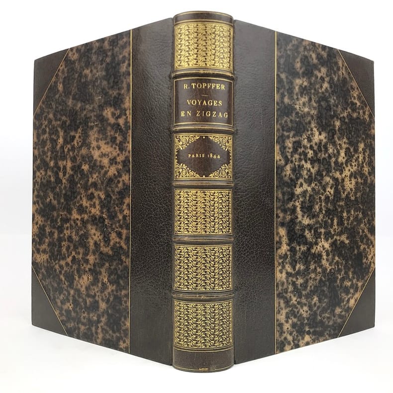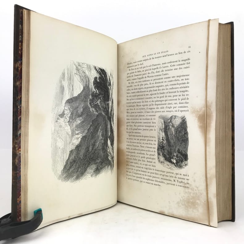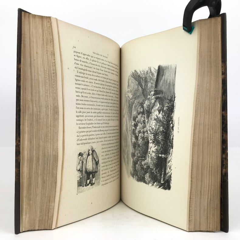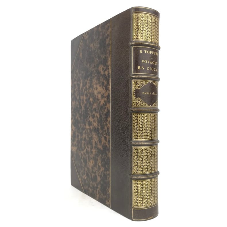 1 volume in-4 (26 x 18 cm), demi-maroquin chocolat à coins (reliure de l’époque, signée L. Brand), dos à nerfs orné de filets, de pointillés, et d'un décor doré à la grotesque, tête dorée, première de couverture illustrée conservée. viii-542-[2] pages (complet). Fortes rousseurs marginales avec atteinte au texte sans gêne de lecture, parfois avec atteinte à quelques planches. État correct tout de même. Première édition illustrée d’un titre gravé en frontispice, de 53 planches hors texte et gravés sur bois, d’après les dessins de Topffer et Calame, et de nombreuses vignettes in texte d’après Français, Karl Girardet, Daubigny, etc., d’après les dessins de Töpffer. Rare et bel exemplaire.