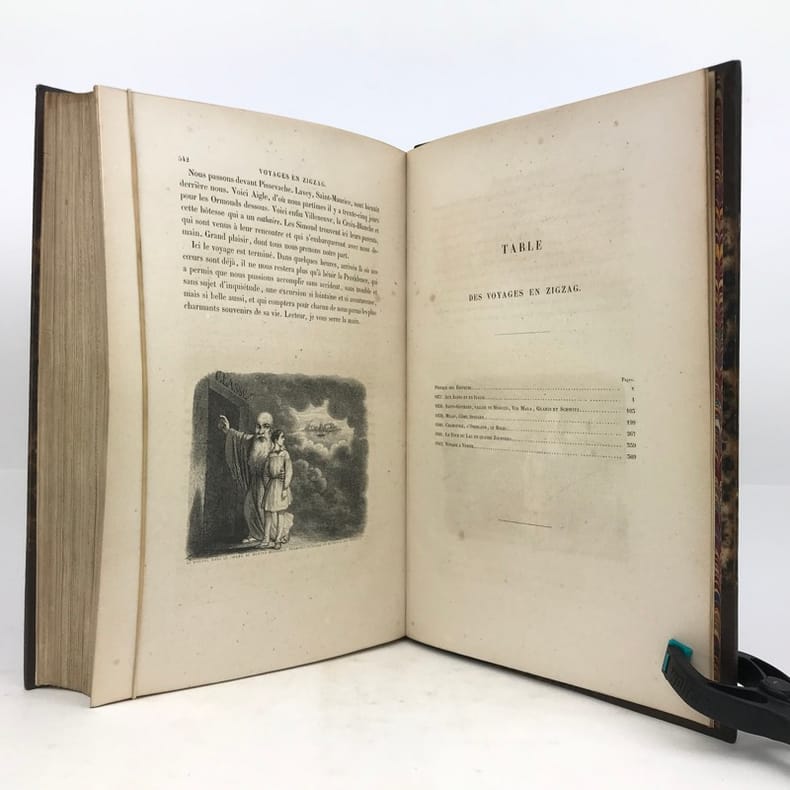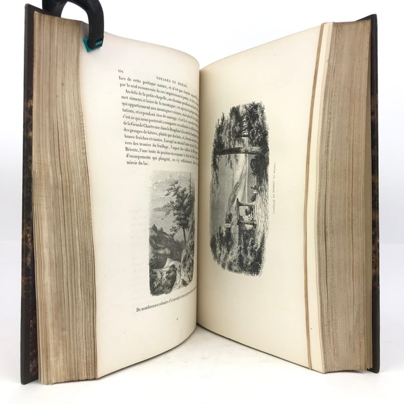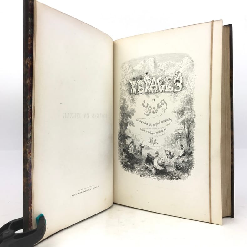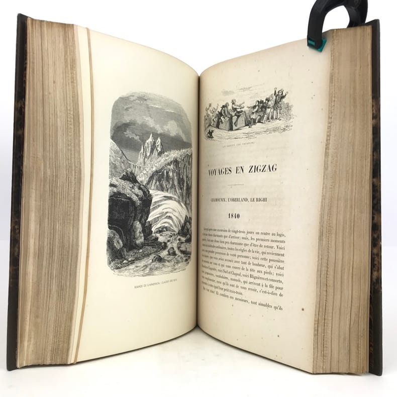 Agréable exemplaire de bonne fraîcheur (rares rouss. et lég. frott. en dos) réunissant les "Premiers voyages" et les "Nouveaux Voyages"... Complet des planches. On ne présente plus le récit pittoresque de Töpffer, si vivant, plein d'entrain et d'esprit. les premiers voyages illustrés de merveilleuse manière nous font souvent dépasser les frontières de la Suisse pour nous conduire de Chamounix (Chamonix) ou Milan, jusqu'à Vérone et Venise. Le second volume nous offre quatre merveilleux itinéraires sous la conduite du plus charmant et du plus spirituel des guides. Le quatrième voyage, à Gênes, nous conduit par Annecy, Saint-Jean de Maurienne, Modane, Suse, Rivoli et Turin, pour s'en revenir par La Corniche, Monaco, Nice, Nice, Antibes, Grasse, Sisteron, Gap et Grenoble.