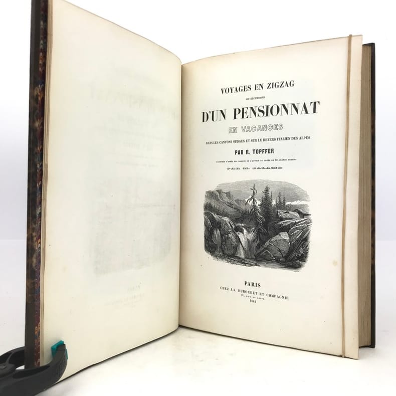 Collation conforme à la table des gravures (qui comprend le titre-frontispice dans les 54 planches).La première édition de cette collective, vraiment rare, parut en 1844, soit deux ans seulement avant la mort de l'illustrateur et pédagogue génial que fut Töppfer. Elle fut suivie, avant la nôtre, des éditions de 1846, 1850, 1855, 1859 et 1860. L'ouvrage regroupe le récit abondamment illustré de six voyages effectués avec son pensionnat de 1837 à 1842, et qui fit chacun l'objet d'une publication autographiée indépendante parue à l'adresse de Genève : 1. Voyage aux Alpes et en Italie (1837). - 2. Second voyage en zigzag (1839). - 3. Voyage de 1839. Milan. Côme. Splügen (1840). - 4. Voyage de 1840 (1841). - 5. Le Tour du Lac (1841). - 6. Voyage à Venise (1841). Perret, 4296. Longchamp, 3019-3025 (pour l'originale et les reprises jusqu'en 1903). Cf. Vicaire VII, 859-866 (assez confus).Bel exemplaire. - - VENTE PAR CORRESPONDANCE UNIQUEMENT