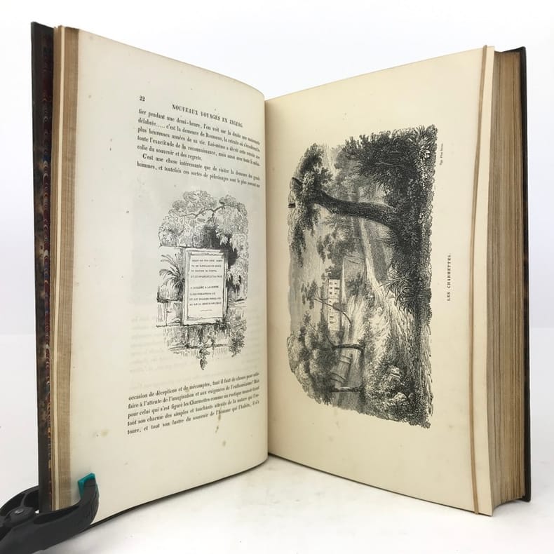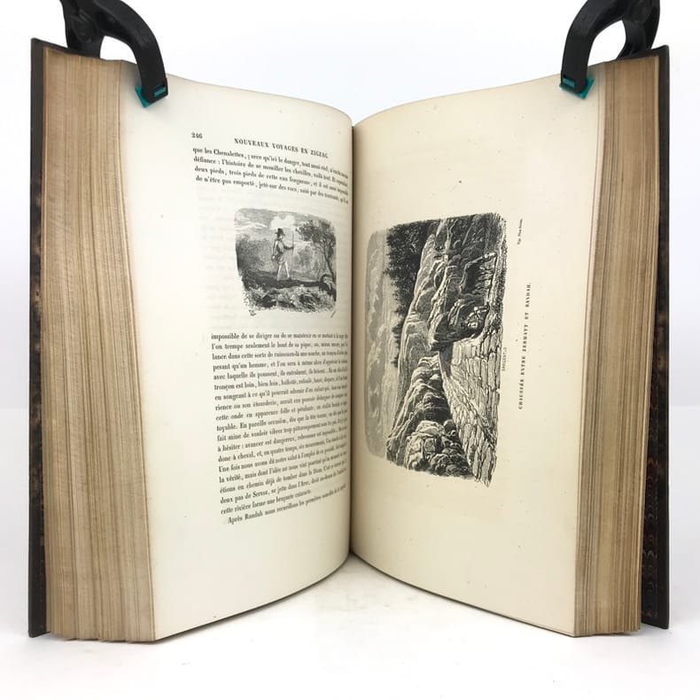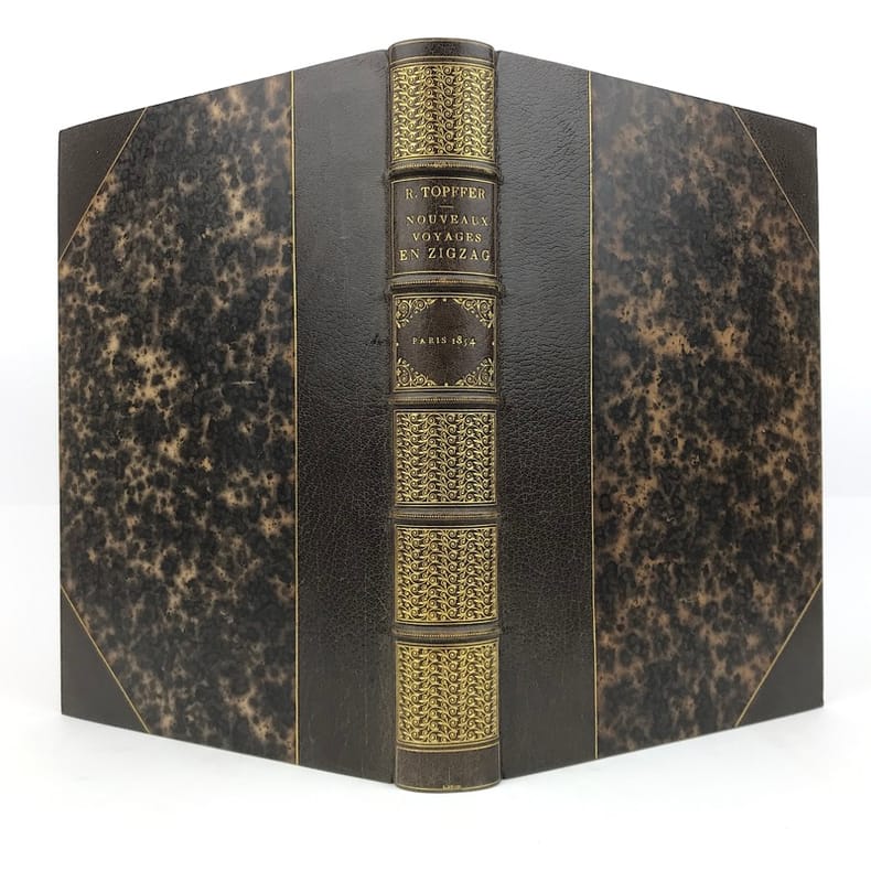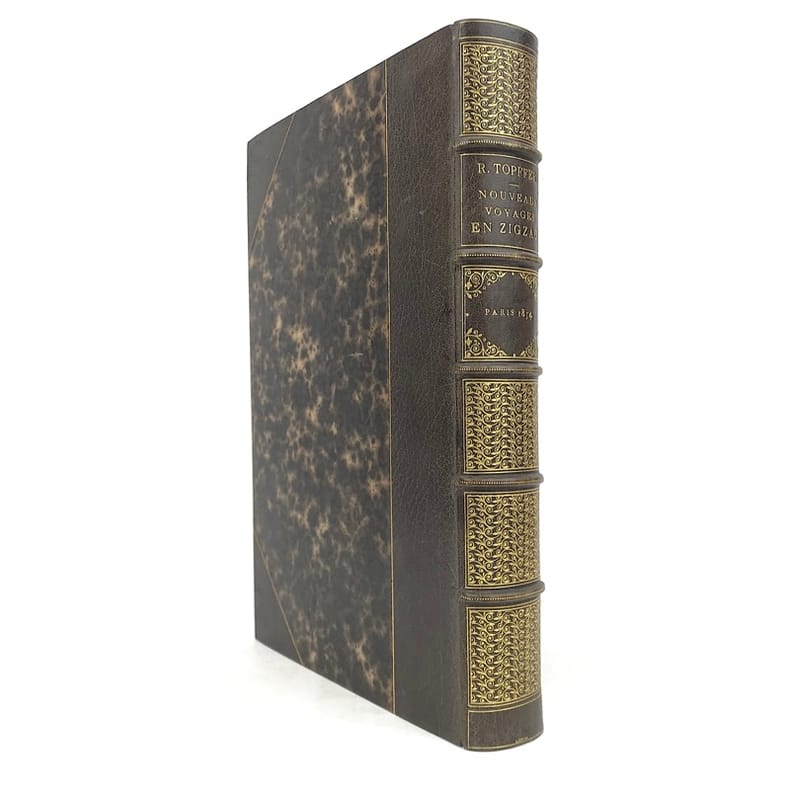 1 volume in-4 (26 x 18 cm), demi-maroquin chocolat à coins (reliure de l’époque, signée L. Brand), dos à nerfs orné de filets , de pointillés et d'un décor doré à la grotesque, tête dorée, couverture illustrée conservée. [4]-xvii-1bl.-454 pages (complet). Quelques rousseurs éparses sans gêne de lecture, parfois avec atteinte à quelques planches. Bon état. Première édition illustrée d’un titre gravé en frontispice, de 47 planches hors texte et de nombreuses vignettes in texte d’après les dessins de Töpffer gravés sur bois par Calame, Français, Girardet, etc. Rare et bel exemplaire.