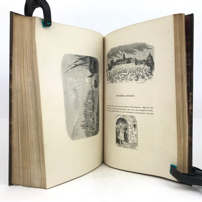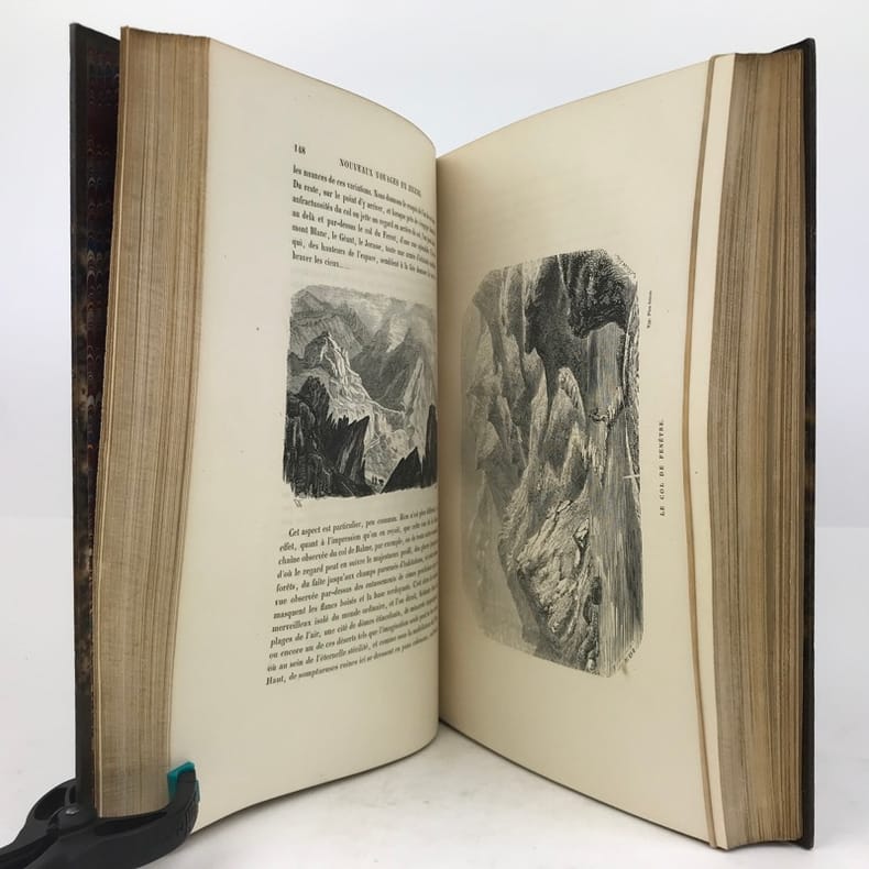 Paris J. J. Dubochet et Ci 1844-1854 2 volumes in-4, demi-maroquin bordeaux à coins, plats de papier marbré, dos ornés de filets dorés; doublures et gardes de papier marbré, têtes dorées, non rognés, couvertures illustrées (Mercier succ. de Cuzin).2 frontispices, 100 hors-texte et de très nombreuses vignettes gravés sur bois. Premier tirage. Beaux exemplaires à très grandes marges.