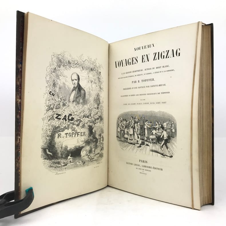 Durant la seconde moitié du XIXe siècle, les récits par Rodolphe Töpffer des excursions scolaires réalisées à travers les Alpes en compagnie de ses pensionnaires, ont rencontré un très large écho parmi les milieux cultivés européens. Une première version intitulée “Voyage en zigzag ou excursion d'un pensionnat en vacances dans les cantons de Suisse et sur le revers italien des Alpes” fut publiée à Paris en 1841. Elle fut suivie, en 1854, par l'édition des “Nouveaux Voyages en zigzag à la Grande Chartreuse, autour du Mont-Blanc”. Par la suite, ces ouvrages connurent de nombreuses rééditions, certaines luxueusement illustrées par des lithographies d’après les originaux de l’auteur. Car, en plus de ses talents d'écrivains, Rodolphe Töpffer cultivait également des dons évidents pour le dessin et la caricature. Ce dernier trait lui vaut d’ailleurs aujourd'hui, de figurer parmi les pères fondateurs de la bande dessinée, dans toutes les anthologies consacrées à l’histoire de cette forme d'expression artistique.