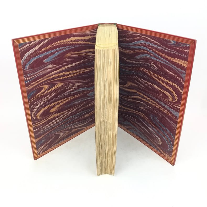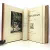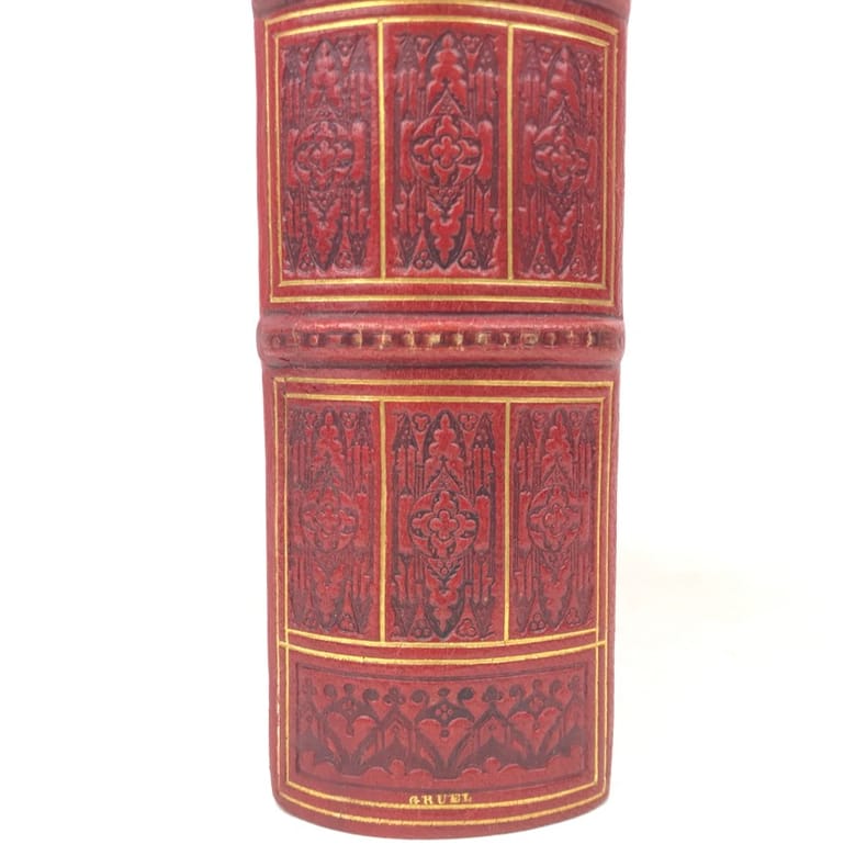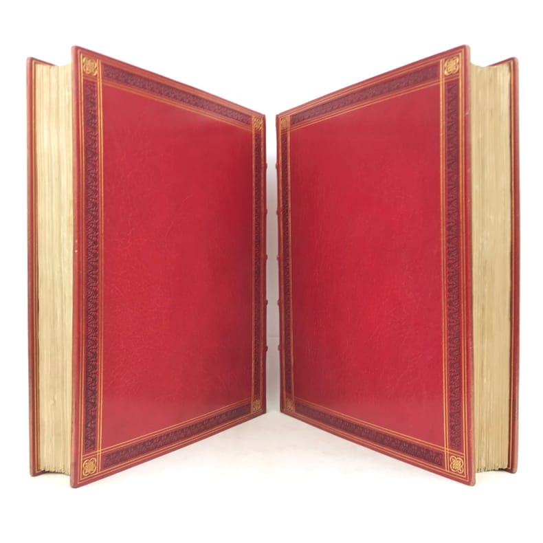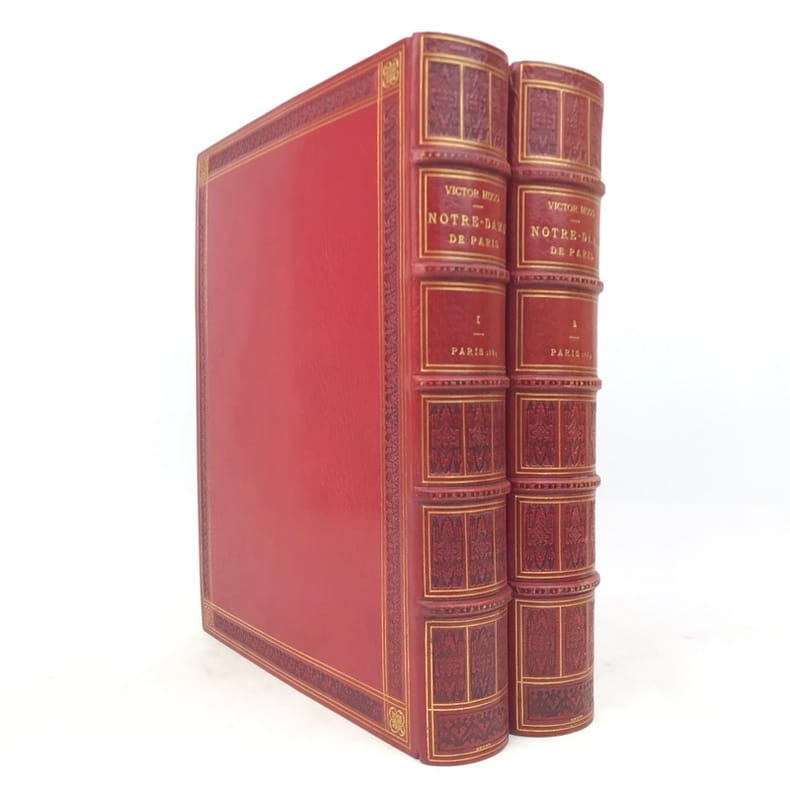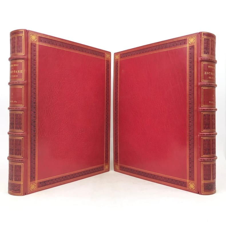 2 volumes in-4 (276 x 219 mm), maroquin rouge (reliure de l’époque signée Léon Gruel), dos à nerfs estampé à froid dans le style romantique, avec texte doré, roulette à froid et filets dorés encadrant les plats, avec fleurs dorées en écoinçons, double filet doré sur les coupes, quadruple filet doré sur les chasses, tranche de tête dorée, ex-libris de Charles Contour, titre en rouge et noir, grand de marges, [4]-371-[1] ; [4]-428-[4] pages (complet). Infimes frottis aux coins. Très bon état. Il a été tiré de cet ouvrage 200 exemplaires numérotés de 51 à 250 sur papier du Japon, avec une double suite des gravures hors texte. Le présent exemplaire porte le numéro 55. Riche illustration, avec sa suite, composée d’un frontispice, représentant Quasimodo, de 61 vignettes et 11 gravures hors-texte, dessinées par Luc-Olivier Merson (1846-1920) et gravées par Adolphe-Alphonse Géry-Bichard (1841-1926). Nouvelle édition, dite «nationale», du célèbre roman de Victor Hugo (1802-1885), Notre-Dame de Paris. Éditée en 1831 pour la première fois, cette œuvre n’a pas pour seule ambition un survol historique et médiéval de la ville de Paris, mais souhaite avant tout éveiller au sein du lecteur contemporain une réflexion politique, face au gouvernement du roi Charles X. Bel exemplaire. Vendu 02/10/2025