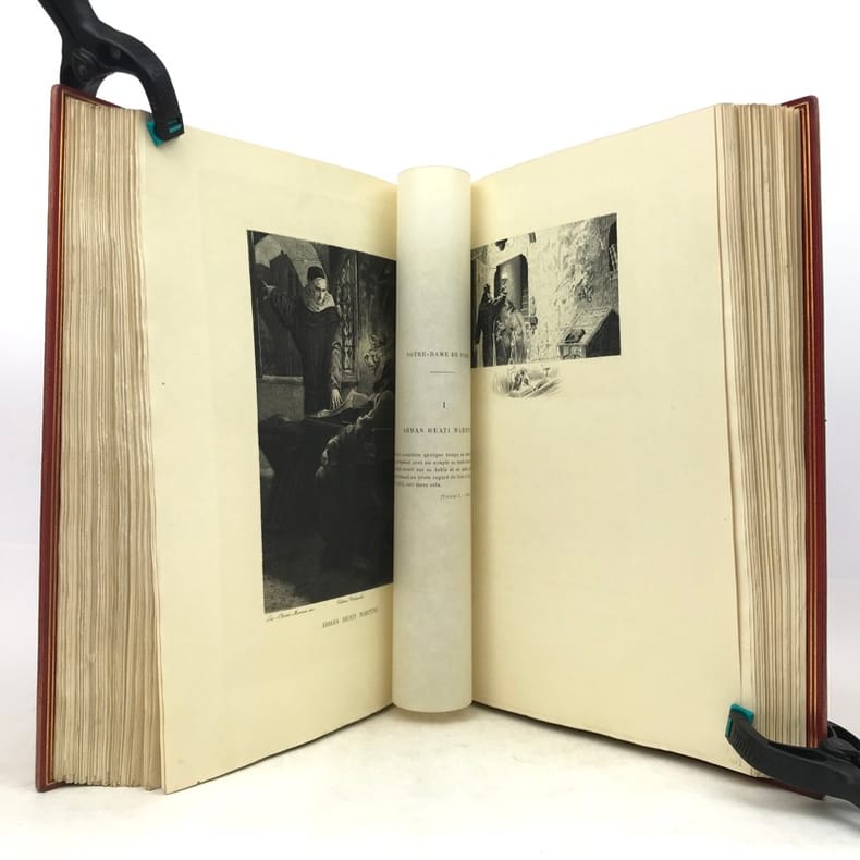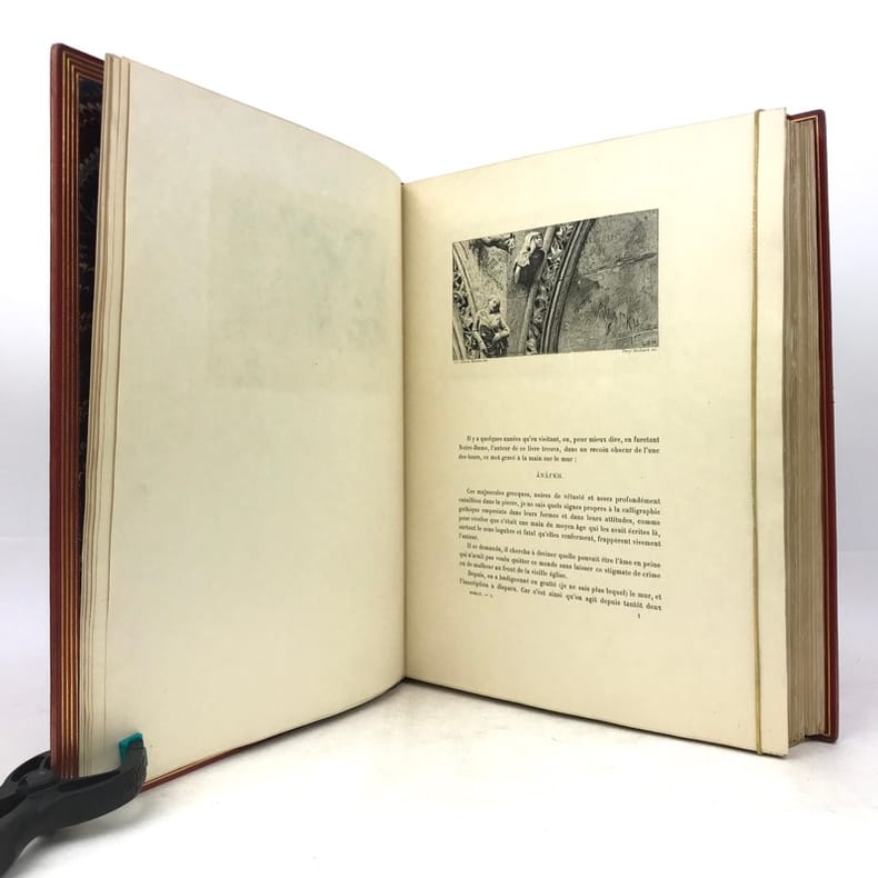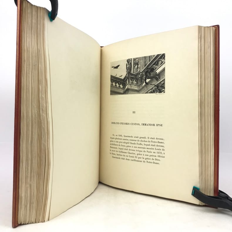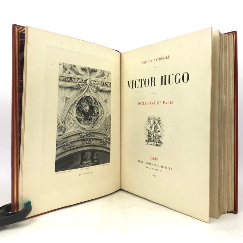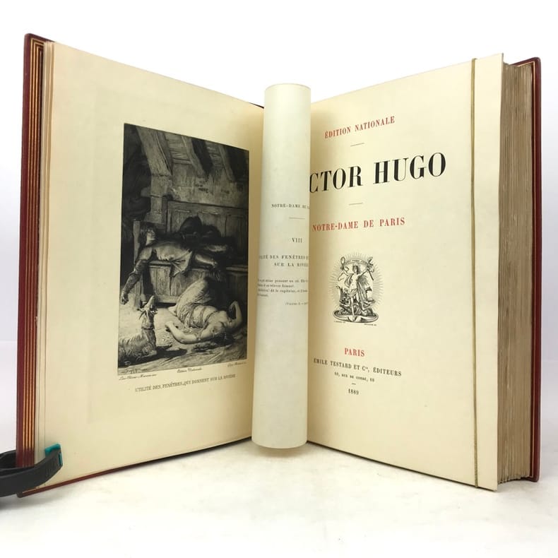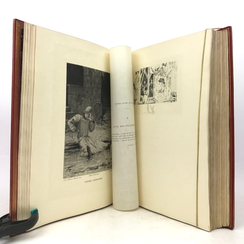 Petit In-4. Sans date. Demi-Chagrin grenat avec le dos orné de motifs dorés. Edition illustrée de gravures en noir. Notre-Dame de Paris