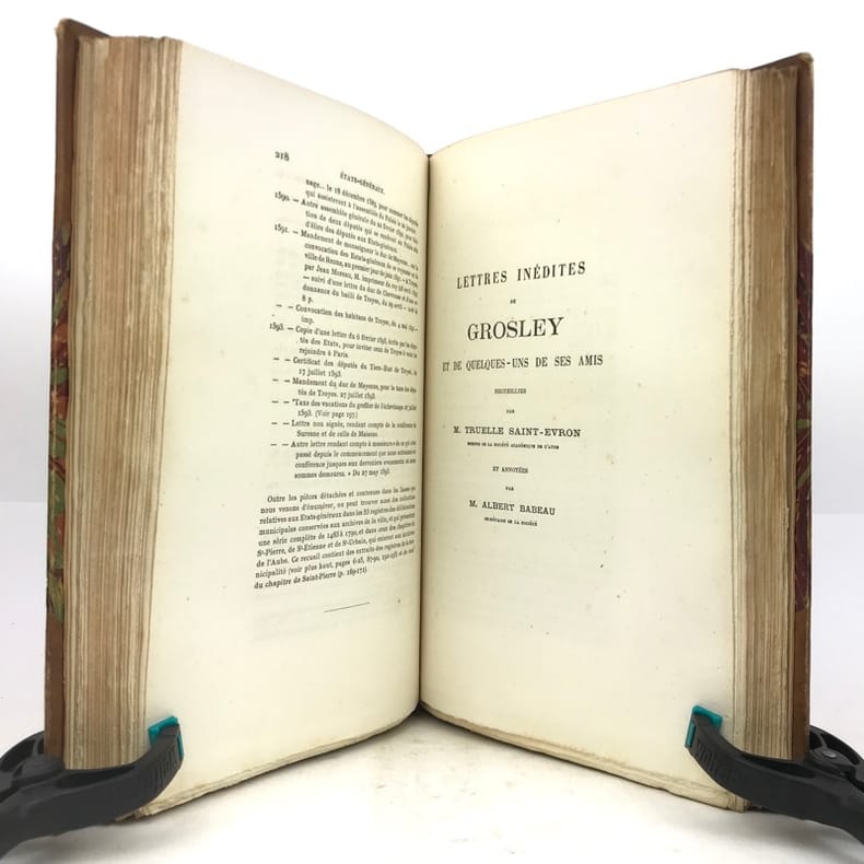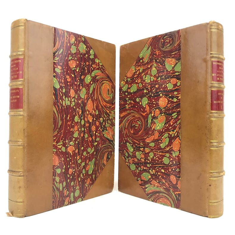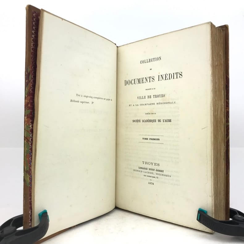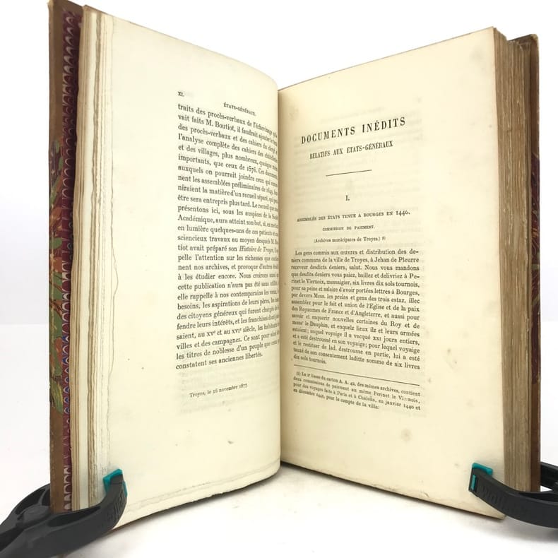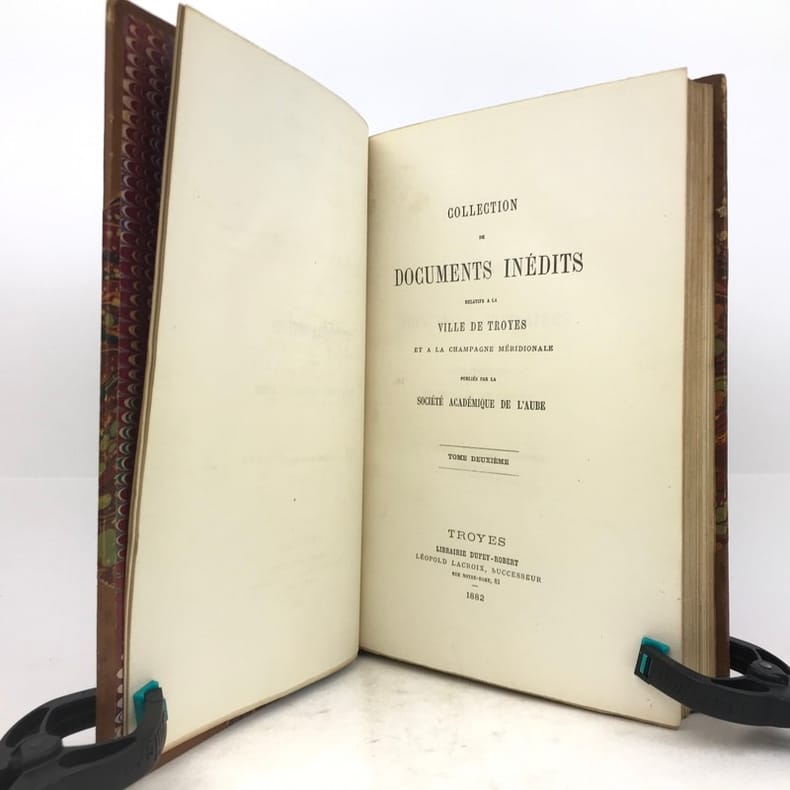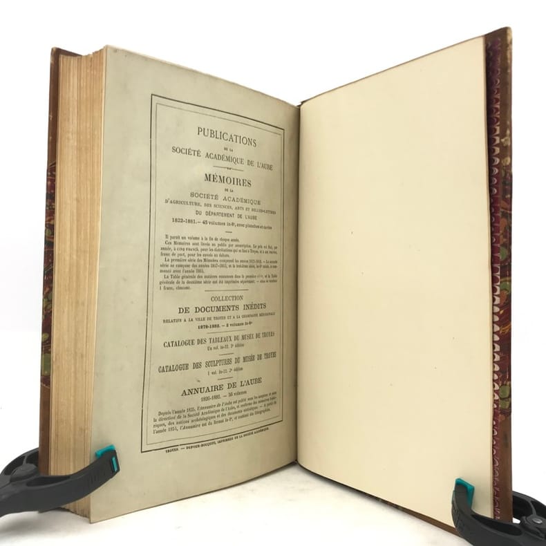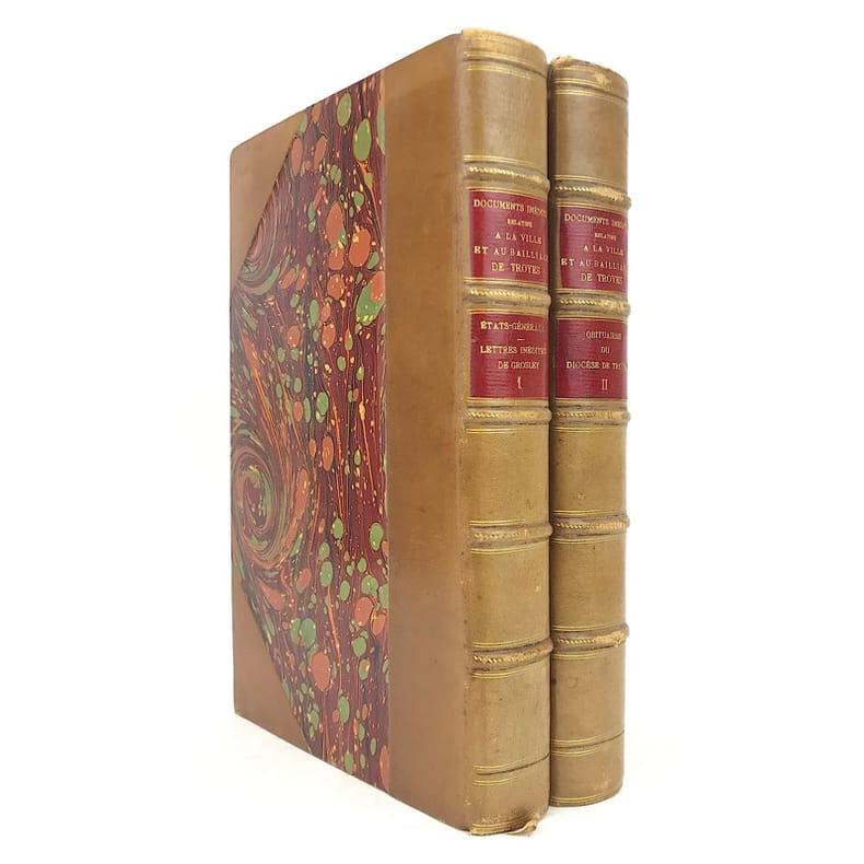 2 volumes (sur 5) in-8 (24 x 16 cm), demi-basane miel à coins (reliure de l’époque), dos à nerfs ornés de filets et roulettes dorés, pièces de titre et de tomaison rouge, couvertures conservées. xl-433-[3] ; 523-[1] pages (complet). Manque 3 volumes. Menus défauts d’usage aux reliures avec quelques traces d’humidité dans la partie supérieures des plats, des frottements aux coiffes, aux nerfs, aux charnières, sur les chants et sur les coins. Rousseurs claires sur les feuillets liminaires. État très correct. ÉDITION ORIGINALE des 2 premiers volumes de cette collection qui fut publiée en 5 volumes de 1878 à 1893. Les 2 premiers que nous présentons sont titrés : Les États généraux au XVIe, par Théophile Boutiot et Lettres inédites de Grosley, par Truelle Saint-Evron, 1878; - et, Collection des principaux obituaires du Diocèse de Troyes, par Charles Lalore, 1892. Les 3 suivants sont titrés : Inventaires des principales églises de Troyes par Charles Lalore, 1893, en 2 volumes; - et, Mémoires et livre de famille de Nicolas Dare, par Maurice Bailly et le vicomte René de Saint-Maurice. Le plus ancien registre des délibérations du Conseil de Ville de Troyes (1429-1433), par Alphonse Roserot, 1886. Bon exemplaire sur papier vergé. Vendu 02/10/2025