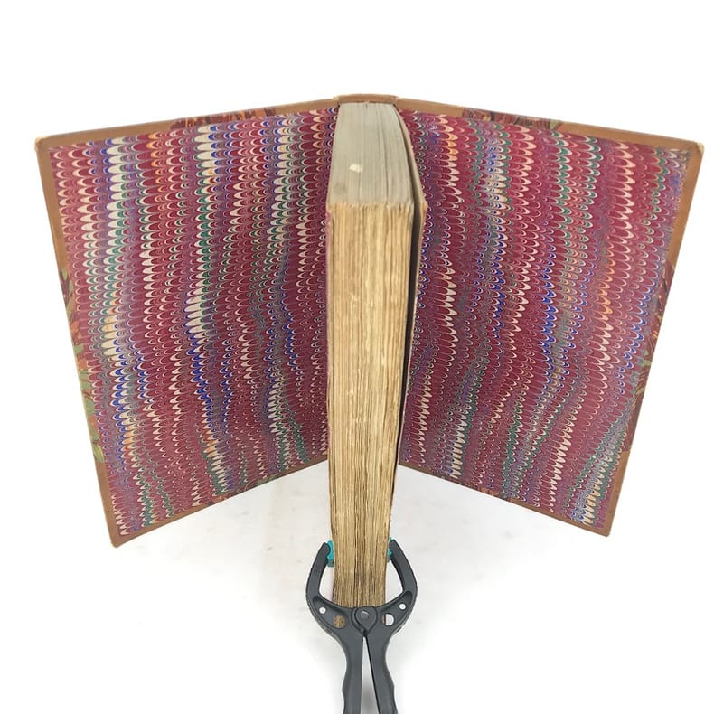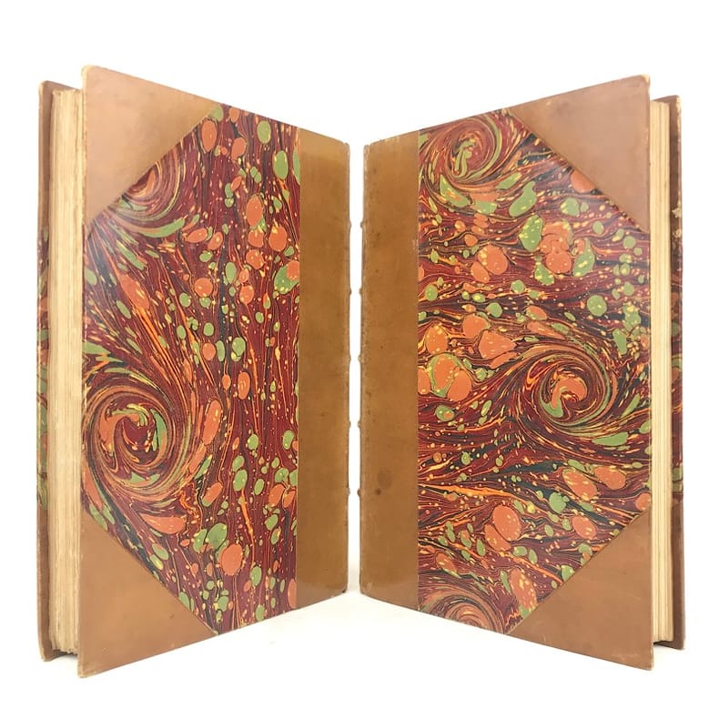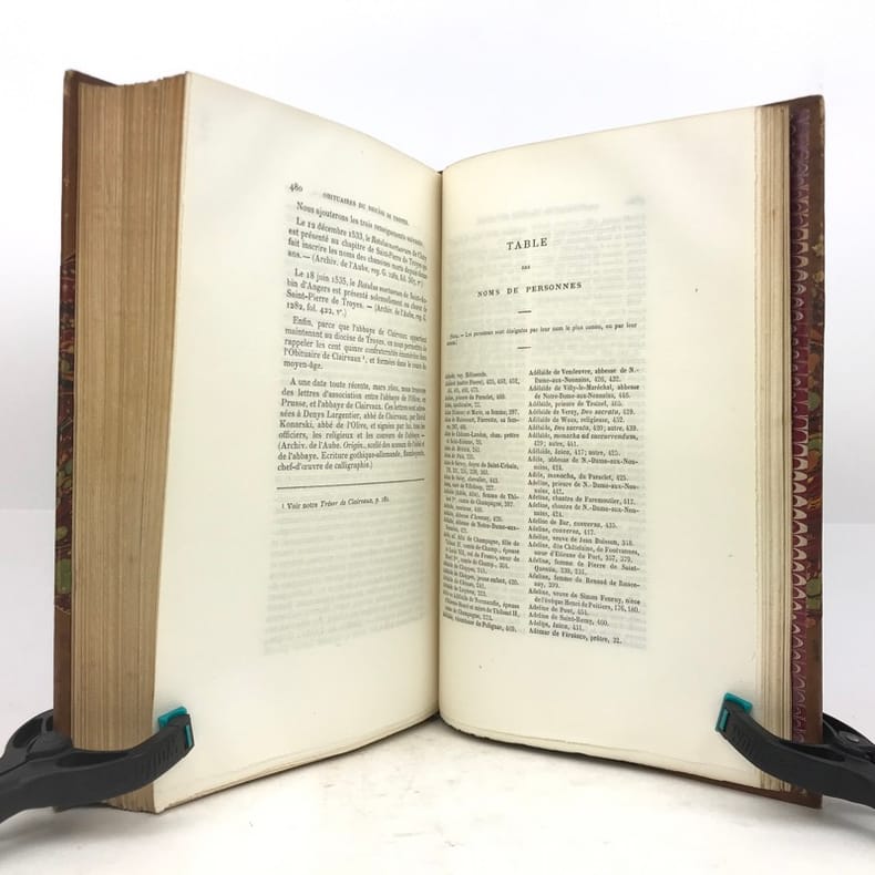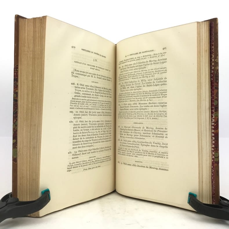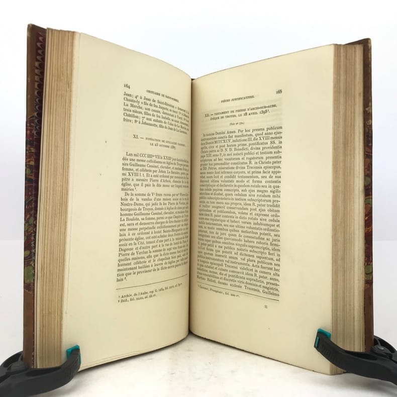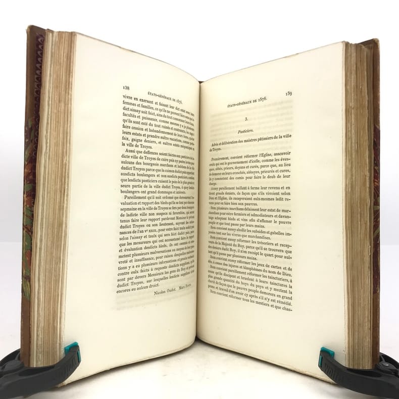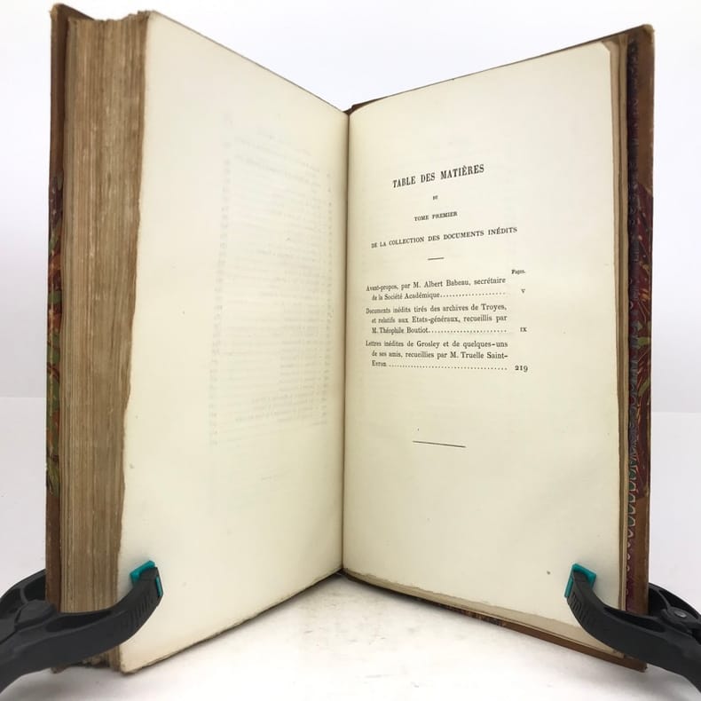 2 volumes (sur 5) in-8 (24 x 16 cm), demi-basane miel à coins (reliure de l’époque), dos à nerfs ornés de filets et roulettes dorés, pièces de titre et de tomaison rouge, couvertures conservées. xl-433-[3] ; 523-[1] pages (complet). Manque 3 volumes. Menus défauts d’usage aux reliures avec quelques traces d’humidité dans la partie supérieures des plats, des frottements aux coiffes, aux nerfs, aux charnières, sur les chants et sur les coins. Rousseurs claires sur les feuillets liminaires. État très correct. ÉDITION ORIGINALE des 2 premiers volumes de cette collection qui fut publiée en 5 volumes de 1878 à 1893. Les 2 premiers que nous présentons sont titrés : Les États généraux au XVIe, par Théophile Boutiot et Lettres inédites de Grosley, par Truelle Saint-Evron, 1878; - et, Collection des principaux obituaires du Diocèse de Troyes, par Charles Lalore, 1892. Les 3 suivants sont titrés : Inventaires des principales églises de Troyes par Charles Lalore, 1893, en 2 volumes; - et, Mémoires et livre de famille de Nicolas Dare, par Maurice Bailly et le vicomte René de Saint-Maurice. Le plus ancien registre des délibérations du Conseil de Ville de Troyes (1429-1433), par Alphonse Roserot, 1886. Bon exemplaire sur papier vergé. Vendu 02/10/2025