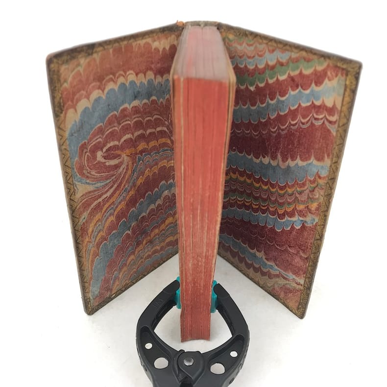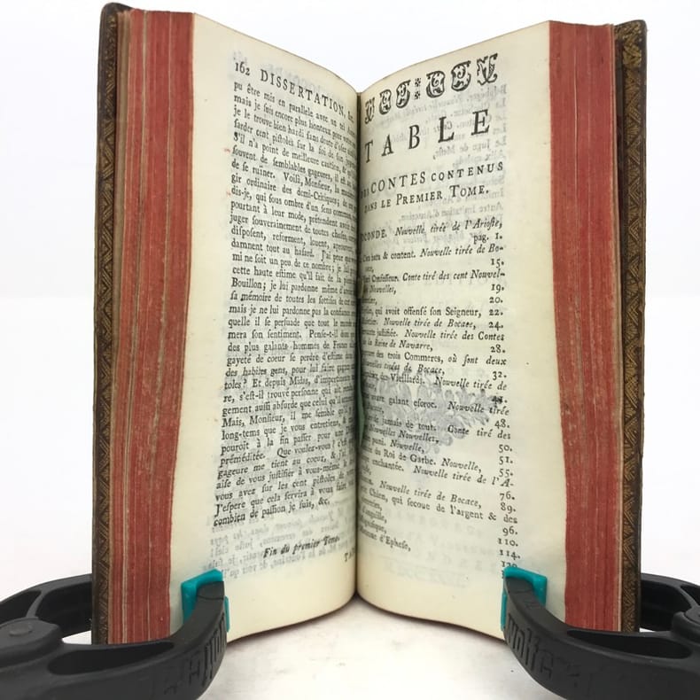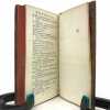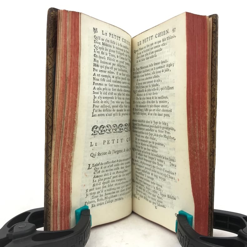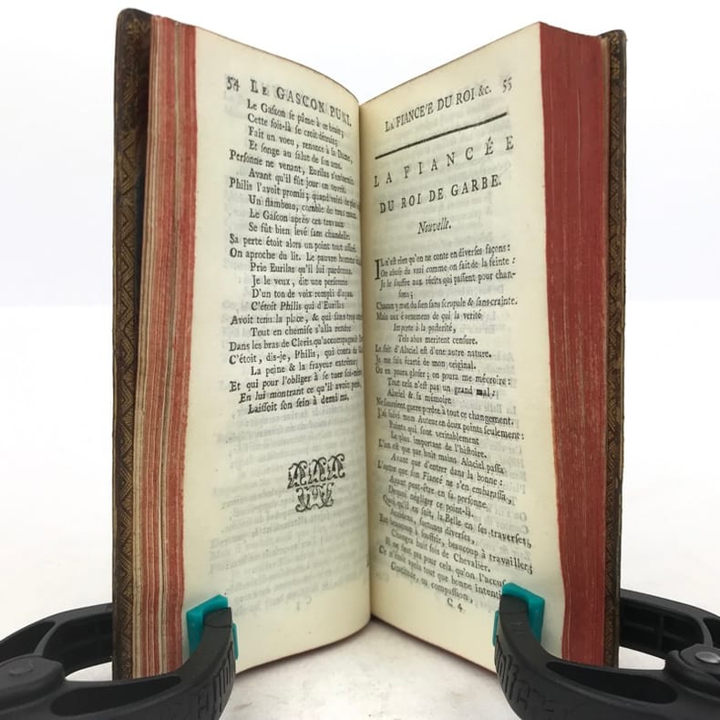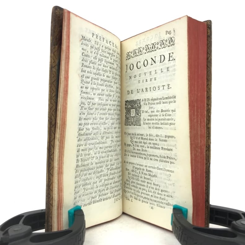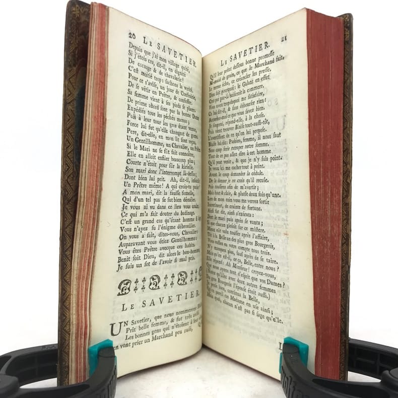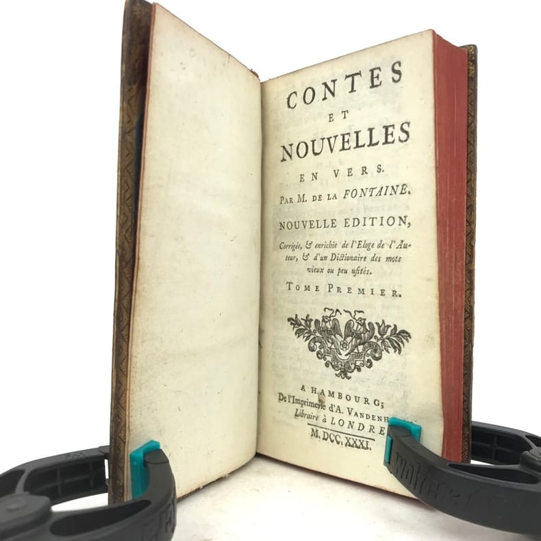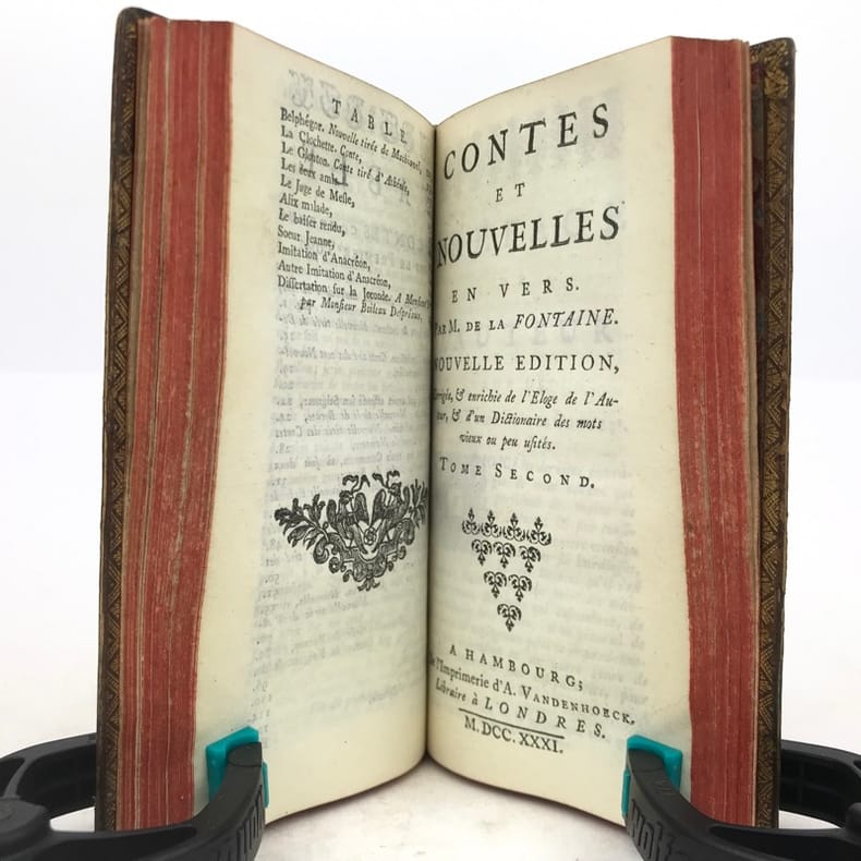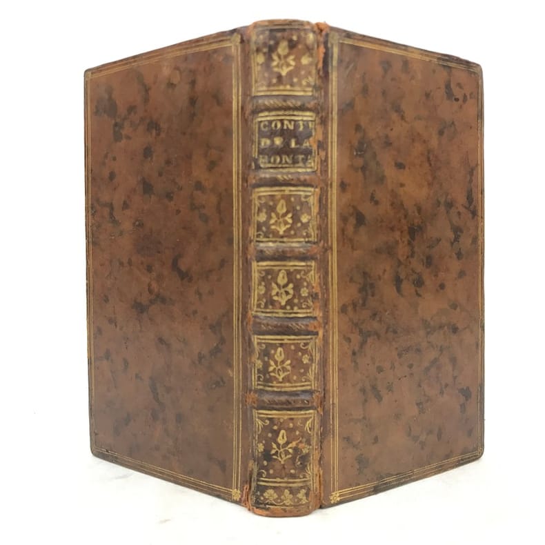 2 tomes en 1 volume in-24 (13,5 x 7,5 cm), veau fauve marbré (reliure de l’époque), dos à nerfs orné, triple filet doré encadrant les plats, filet doré sur les coupes, roulette dorée sur les coupes, tranches rouges, [4]-xvi-[4]-162-[4]-v-[1]-172-[8] pages (complet). Frottements aux mors, coiffe de tête découverte, feuillet I2 du second tome très légèrement déchiré en bordure sans manque, rares rousseurs. État très correct tout de même. Nouvelle édition des Contes et nouvelles, contenant, outre les 63 contes de l’édition de 1695, Le Contract et le Qui pro quo. Ils sont connus pour leur contenu grivois et libertin, et grâce auxquels l’auteur connaît véritablement ses premières années de succès, quelques années avant la parution des Fables. Agréable exemplaire. Vendu 02/10/2025
