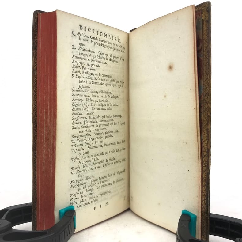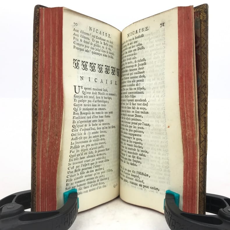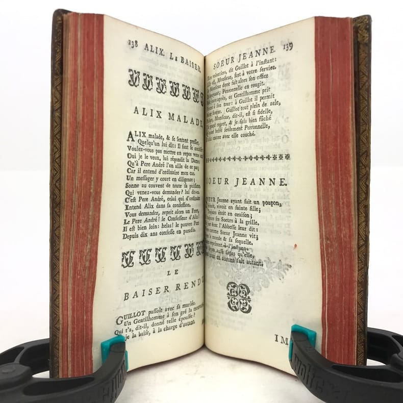 Charmant exemplaire bien relié de ce recueil de petits conteurs de la fin du XVIIème et du XVIIIème siècles. (Vicaire II, 950-951). Jacques Vergier (1655-1720), poète et conteur, fréquenta les milieux littéraires après une carrière dans l'administration de la Marine. Ses oeuvres ne furent publiées qu'après sa mort tragique (il fut assassiné par la bande de Cartouche, rue du Bout-du-Monde.) Antoine Bauderon de Sénecé (1643-1737) fut le premier valet de chambre de la reine Marie-Thérèse. Il publia entre autres ouvrages une Lettre de Clément Marot touchant l'arrivée de Lully aux Champs-Elysées (1688), Epigrammes et satyres (1695) et une paraphrase des psaumes de David (1722). François-Auguston Paradis de Moncrif (1687-1770) fut poète, musicien et acteur. Académicien depuis 1733 (outre ses fonctions successives de secrétaire, lecteur, censeur royal et secrétaire général des postes), il est l'auteur de comédies et de ballets, de poésies et de chansons. Jean-Antoine du Cerceau (1670-1730) fut père jésuite et le précepteur du prince de Conti. Il mourut aussi briquement, tué accidentellement au fusil de chasse par un de ses élèves.Jean-Baptiste Willart de Grécourt (1683-1743) se fit connaitre par la vivacité de ses sermons, puis par les contes et les vers licencieux qu'il faisait circuler sous le manteau ou lisait dans des cercles choisis. Jean-François, marquis de Saint-Lambert (1716-1803) est aussi oublié aujourd'hui qu'il fut célèbre en son temps. Militaire, il parut à la cour du roi Stanislas à Lunéville. Il fut l'amant de Madame du Châtelet - elle mourut en couche de ses oeuvres. Outre ses oeuvres de littérature poétique (Epitre à Chloé, Fêtes de l'amour et de l'hymen), il est l'auteur d'un Essai sur le luxe pour l'Encyclopédie, d'un Discours sur la Poésie et d'un pesant ouvrage de morale laïque inspiré de d'Holbach et d'Helvétius, Principes des moeurs chez toutes les nations ou Catéchisme universel. "Sec, spirituel, bien tourné, il avait du trait, quelque imagination, de l'élégance, de la raideur" Sainte-Beuve.Sébastien Roch Nicolas, dit Chamfort (1740-1794) est bien connu pour son esprit étincelant, capable de passion malgré une lucidité cynique. Auteur de pièces à succès, il est élu à l'Académie en 1781 et devient administrateur de la Bibliothèque nationale. Ses écrits polémiques lui valent d'être arrêté et il meurt des suites d'une tentative de suicide. Les Maximes qui lui assurent l'essentiel de sa postérité sont publiées après sa mort. Ses contes en vers furent publiés pour la première fois en 1788 par Cazin.Alexis Piron (1689-1773), esprit brillant, caustique, désintéressé, follement gai, composa de nombreuses pièces de tous les genres et fut au centre de nombreuses polémiques littéraires - il est l'auteur de centaines d'épigrammes griffant les poètes de son temps. "Le plus turbulent des poètes" (Jules Janin), "le sel et la gaité même" (Sainte-Beuve).Claude-Joseph Dorat (1734-1780) fut un auteur fécond de pièces et de poésies, toujours en quête du succès, frivole et sans illusion sur sa postérité ("tout ce qui plait n'est pas durable"). Il reste dans les mémoires comme un auteur charmant et léger, habiles aux "riens élégants". Libraire membre du S.L.A.M. (Syndicat national de la Librairie Ancienne et Moderne) et de la L.I.L.A. (Ligue Internationale de la Librairie Ancienne). N'hésitez pas à prendre contact par mail pour des photographies et des détails supplémentaires, pour des recherches ou des estimations de livres anciens et rares.
