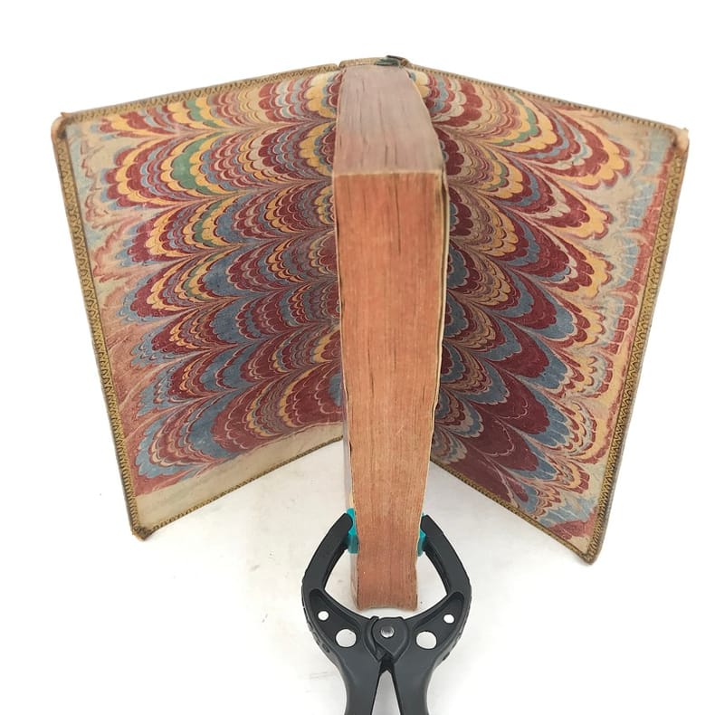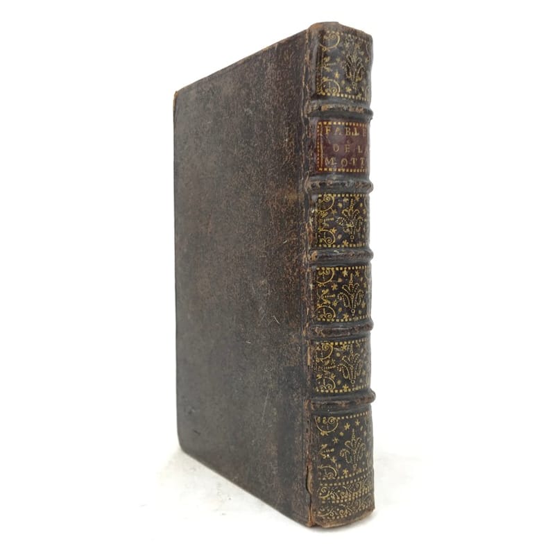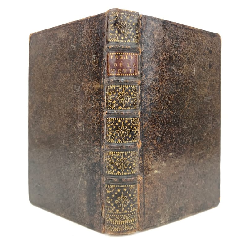 1 volume in-12 (16 x 10 cm), basane mouchetée (reliure de l’époque), dos à nerfs orné, pièce de titre en maroquin grenat, filet à froid encadrant les plats, roulette dorée sur les coupes et sur les chasses, tranches rouges, lviii-364-[4] pages (complet). Coins et mors frottés, coiffes découvertes, rousseurs éparses. État correct. Édition parue la même année que l’originale au format in-4, mais ici au format in-12, et sans gravure. Antoine Houdar de La Motte (1672-1731) est un écrivain et dramaturge français, célèbre en son temps par ses écrits et conceptions. Il publie ici un recueil de fables fortement inspirés des auteurs antiques, mais aussi de celles de Jean de La Fontaine, parues une trentaine d’années plus tôt. Bon exemplaire.