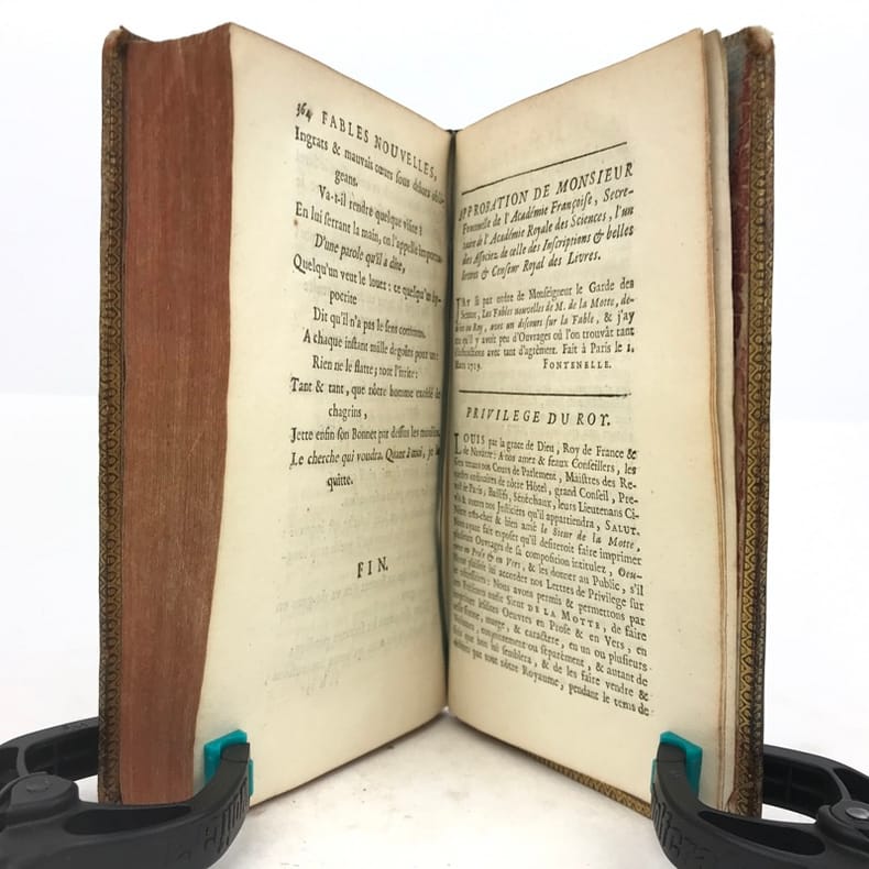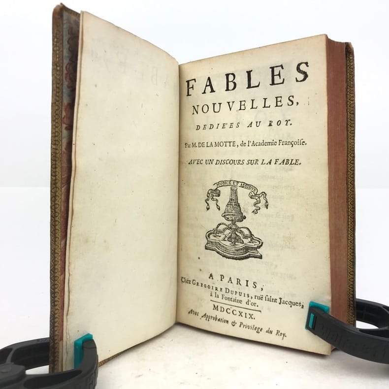 Paris Chez Grégoire Dupuis 1719 in 12 (16,5x10,5) 1 volume reliure plein veau fauve de l'époque, dos à nerfs orné de caissons dorés, pièce de titre de maroquin rouge, LVIII et 364 pages, et 4 feuillets non chiffrés (privilège, fautes à corriger, table des fables). Antoine Houdar de La Motte, 1672-1731. Bel exemplaire ( Photographies sur demande / We can send pictures of this book on simple request )