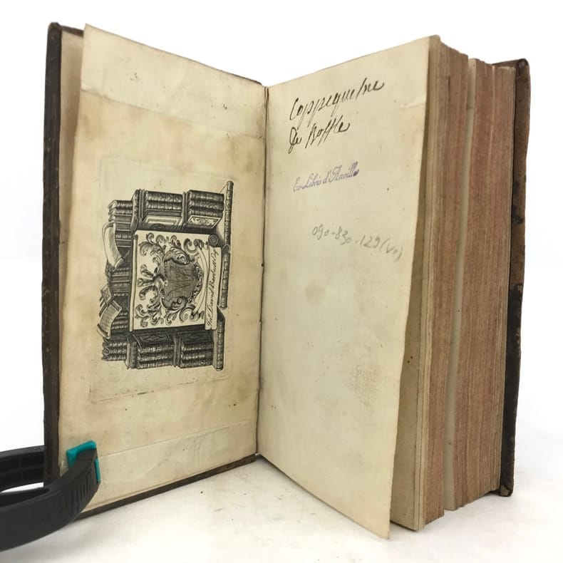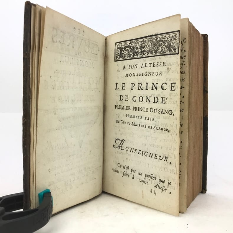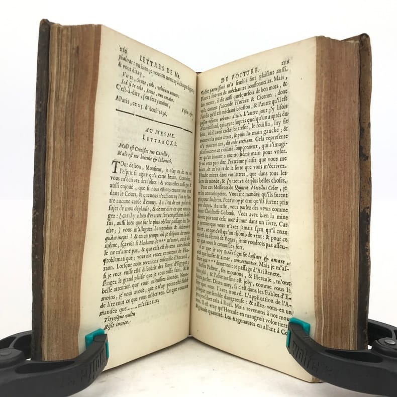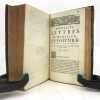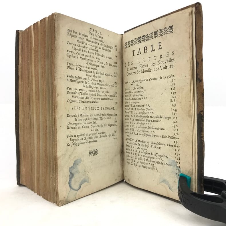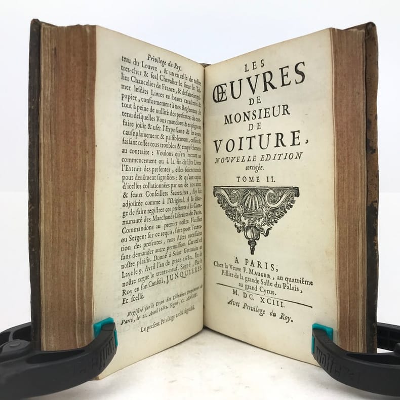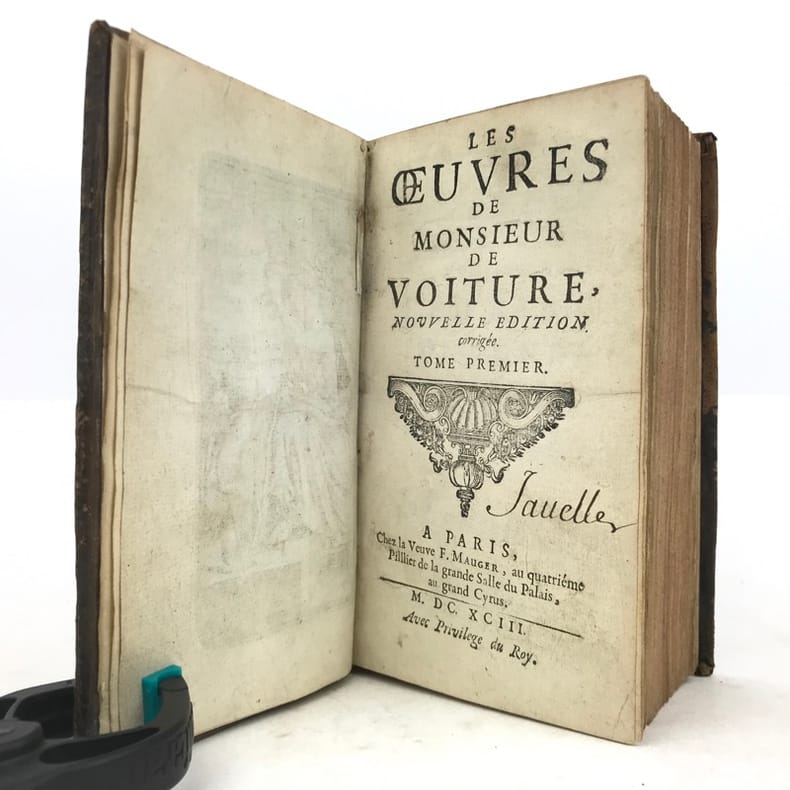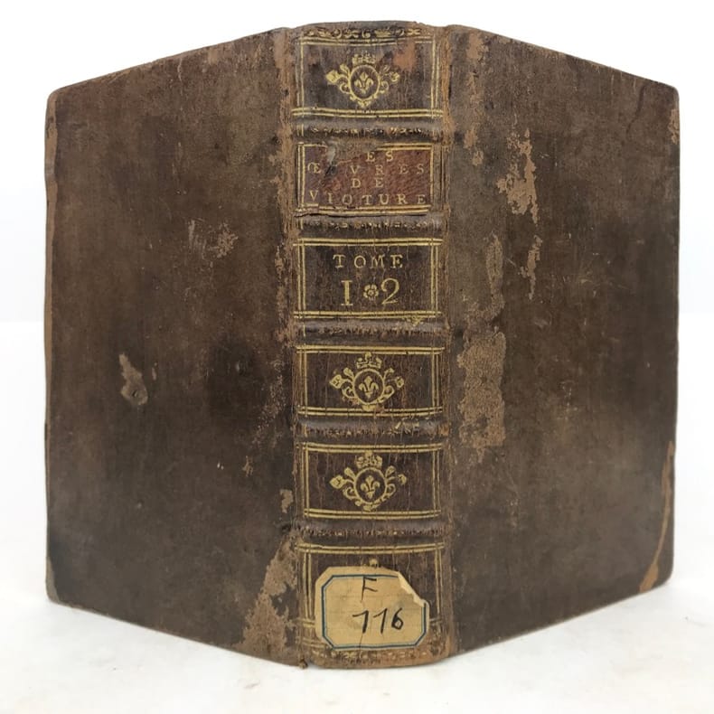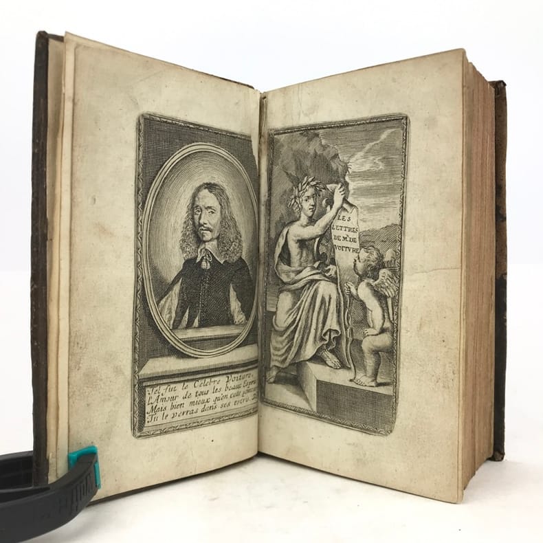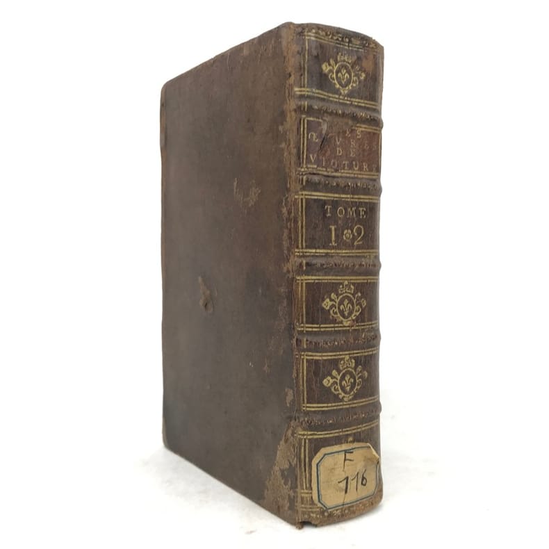 2 tomes en 1 volume in-12 (15 x 9 cm), veau brun (reliure de l’époque), dos à nerfs orné avec fleurs de lys, pièce de titre en veau fauve, étiquette bibliothéconomique en pied, tranches rouges mouchetées, nombreux ex-libris : David Barbutt (étiquette), Coppequesne de Boffle (manuscrit), Anville (tampon) et Javelle (manuscrit), [28]-406-[10]-76-144-[2]-127 à 254-[10] pages (complet). Reliure frottée, feuillet A1 déchiré sans manque, deux derniers feuillets moisis, rousseurs. État correct tout de même. Nouvelle édition, similaire aux précédentes, illustrée du portrait de l’auteur en frontispice et d’un titre gravé. L’épître est, de même, toujours dédiée au prince de Condé. Vincent Voiture (1597-1648) est un poète et prosateur français. Protégé de Gaston d’Orléans, puis de Richelieu, il s’apparente durant toute sa carrière au mouvement de la préciosité : toutes ses œuvres ne seront d’ailleurs publiées qu’après sa mort. Bon exemplaire.
