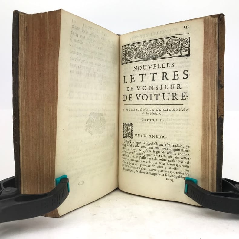Paris, Chez Thomas Iolly, au Palais dans la petite Salle des Merciers, M. DC. LXV., 1665, in-8vo, frontispice portrait gravé du ‘Celèbre Voiture’ + 1 titre gravé (avec titre: Les lettres de M. de Voiture) + 14 ff. (titre avec vignette gravée - envoi à son altesse Mons. le Prince de Condé / epistre - au lecteur - à Mons. le Prince Sonnet) + 484 p. + 6 ff. (table - privilége + 1 f.. blanche) + 144 p. + 130 p. (dont le titre avec vigette. et ‘Aux Lecteurs’) + 5 ff., reliure en pleine basane, coiffes tirées, dos à cinq nerfs, tranches rouges.