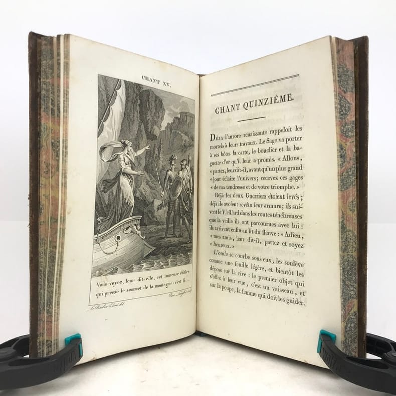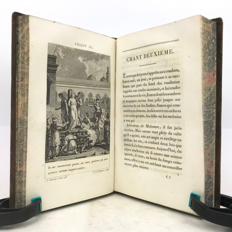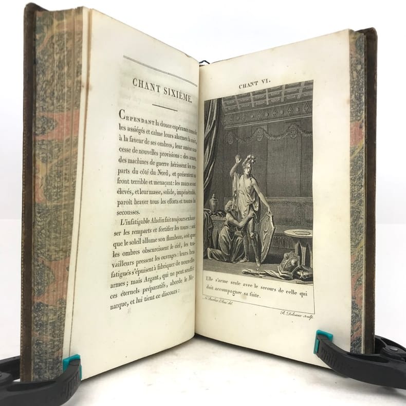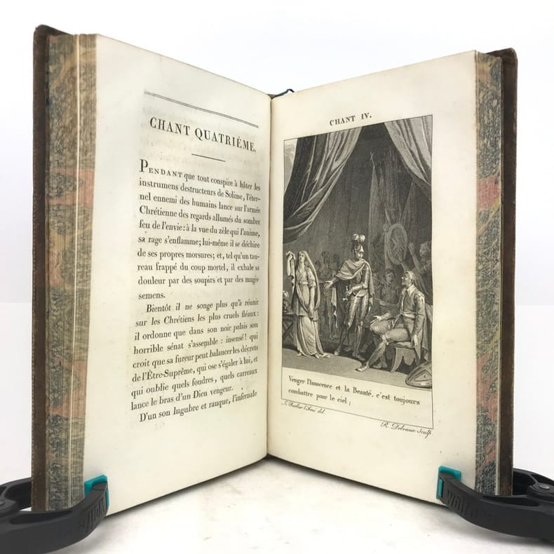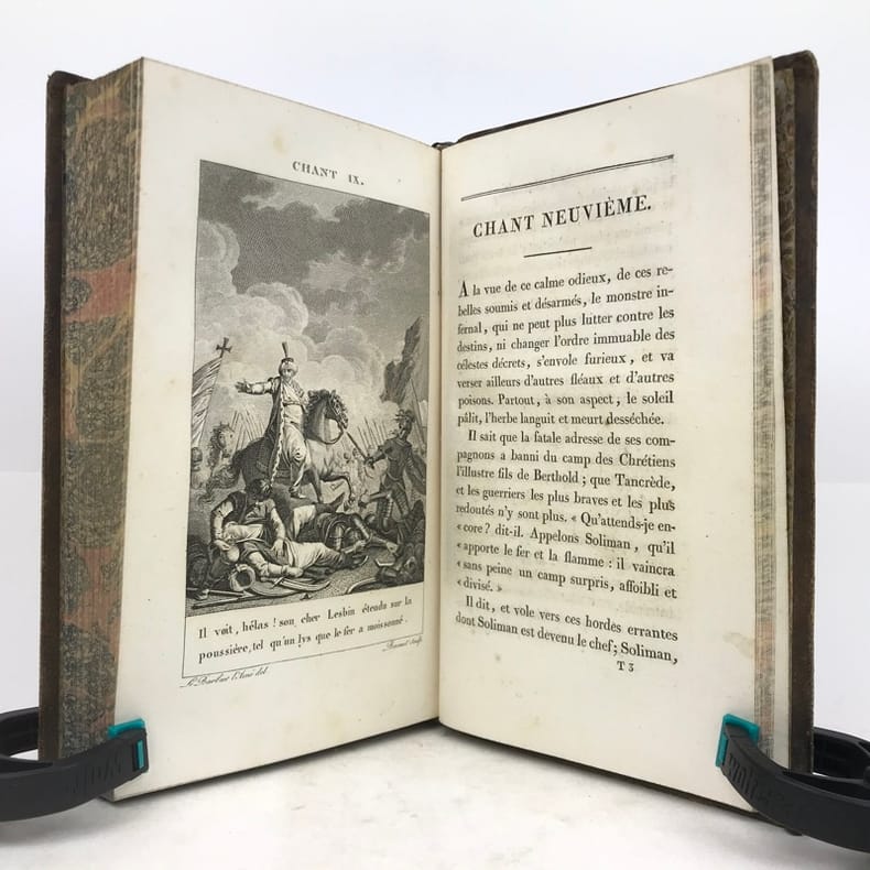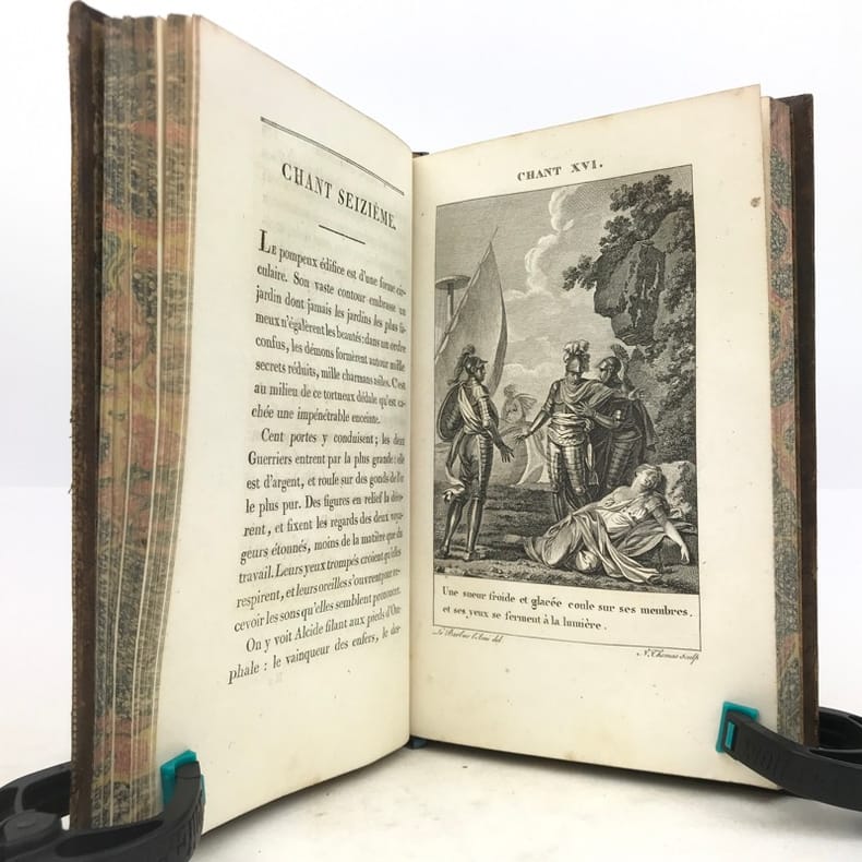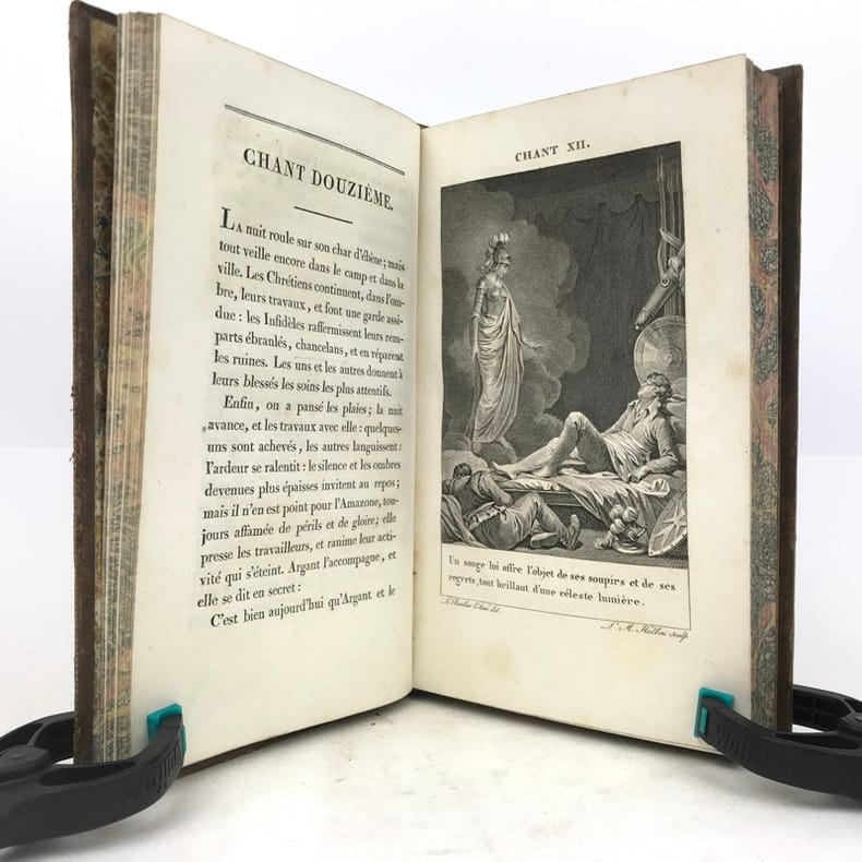 Paris Chez Bossange , Masson et Besson an XI 1803 2 vol. in-8 ( 22,5 x 14,5 cm ) ( poids = 1,7 kg ) Fx. t. , frontispice , t. , LXXXVI , 353 pp. + fx. t. , t. , 354 , (1) pp. . Frontispice dessiné par Chasselas d' après le tableau original et gravé par R. Delvaux . 20 gravures avant la lettre HT et HP , une au début de chaque chant : ces figures d'après Le Barbier l' Aîné ont été gravées par N. Thomas , J. L. Delignon , R. Delvaux , Dupréel , Ph. Frière , Bovinet , E. de Ghendt , A. Romanet , L. M. Halbou , Villerey , Vinc. Langlois , N. Courbe , Dambrun ; serpentes en papier de soie légendées . Avec : Préface de l' édition de 1774 ; Notice sur la vie et le caractère du Tasse ; Jugement sur L' Arioste et Le Tasse traduit d' une lettre de P. Metastasio à Don D. Diodati ; Appendice . Plein veau glacé marron foncé . Dos lisse orné doré , titre et tomaison . Roulettes et doubles filets dorés sur les plats , roulettes sur les coupes , roulettes à motif de grecque sur les chasses . Toutes tranches dorées . Gardes marbrées . Ex-libris contrecollé au contreplat du vol. I : Bibliothèque de Mr Beaupré , conseiller à la Cour de Nancy . Ex-libris au contreplat du vol. 2 représentant un phénix avec l' inscription I.N.R.I. . Coins émoussés . Des rousseurs acceptables , notamment en marge des gravures . Vol. 1 : mors sup. partiellement fendu , mors inf. frotté ; les pp. LXXXI à LXXXVI et un feuillet ( Notice sur le portrait ) sont intercalés entre les pp. LXIV et LXV . Vol. 2 : mors sup. fendu , mors inf. partiellement fendillé .