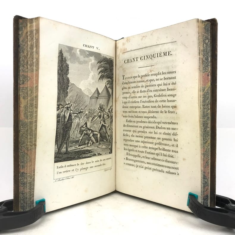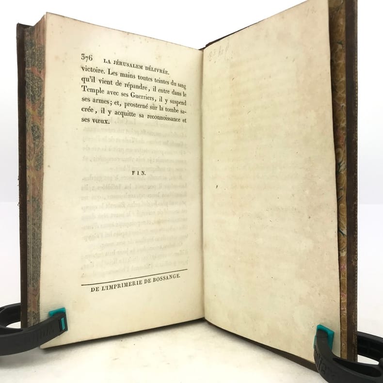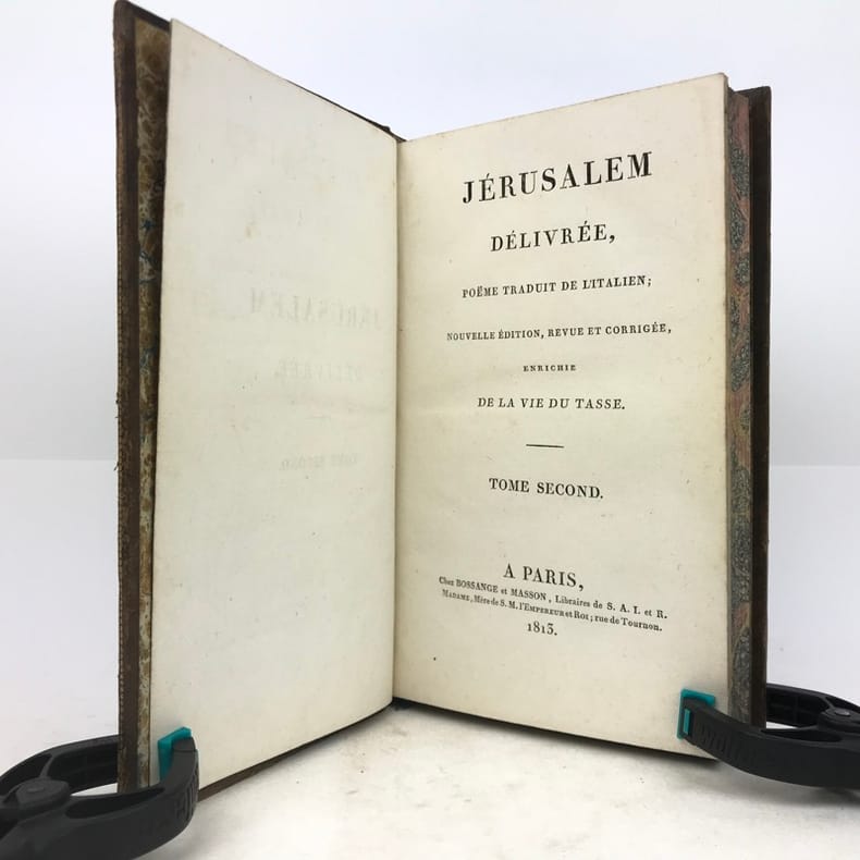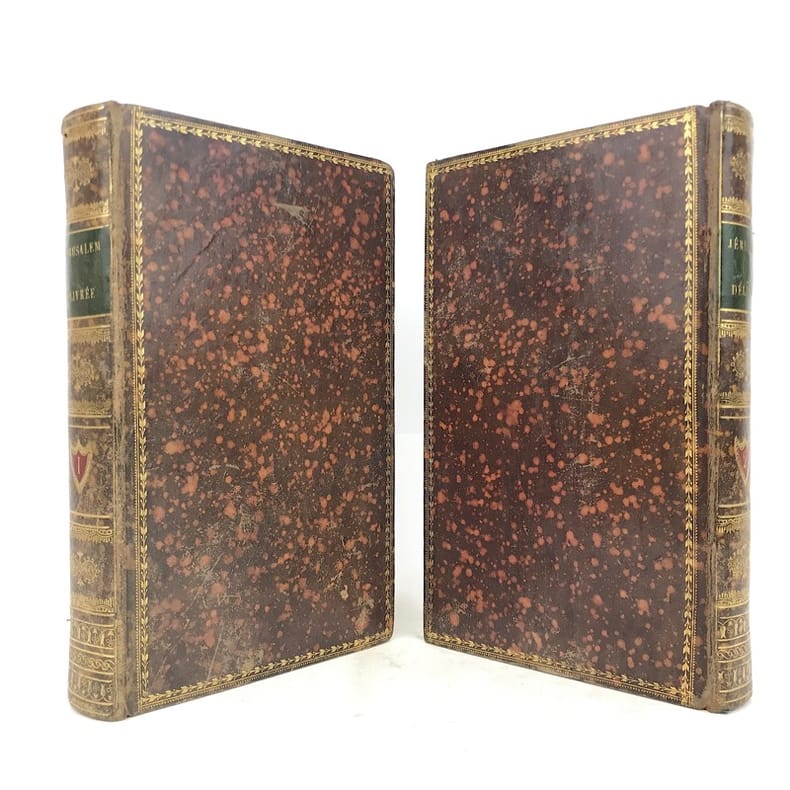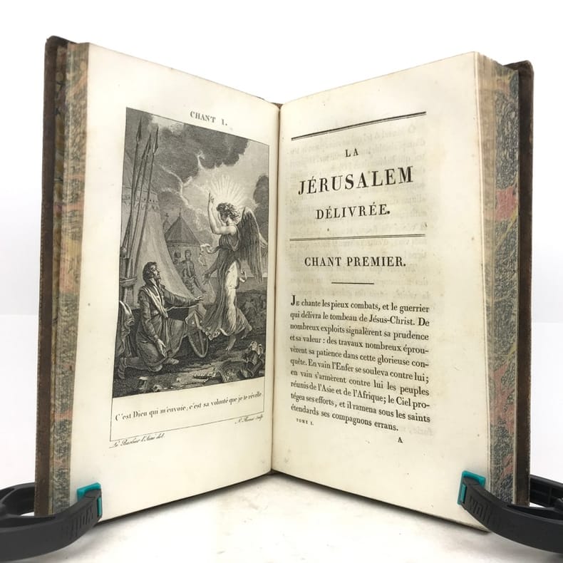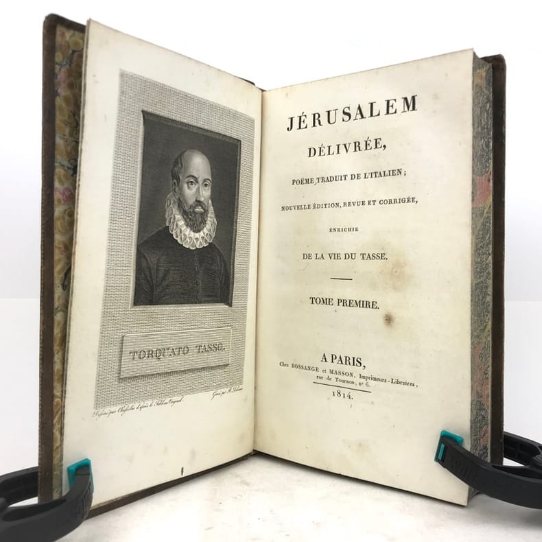 2 volumes in-8 (20 x 12 cm), basane mouchetée (reliure de l’époque), dos lisse orné, pièces de titre et de tomaison en maroquin vert et grenat, roulette dorée encadrant les plats et sur les coupes, tranches marbrées, [4]-xcii-328 ; [4]-376 pages (complet). Quelques rousseurs éparses. Bon état.Nouvelle édition, illustrée d’un portrait de l’auteur en frontispice et de 20 gravures hors-texte réalisées par Barbier l'Aîné.Torquato Tasso (1544-1595) est un poète italien du XVIe siècle, au service de la maison d’Este, à Ferrare. Il s’inspire pour la rédaction de ce poème épique de la première croisade (1095-1099), menée par Godefroi de Bouillon, qui aboutit à la conquête de Jérusalem en 1099.Nous avons ici sa traduction française en vers, donnée par Baour-Lormian (1770-1854), enrichie de la vie de l’auteur.Agréable exemplaire.