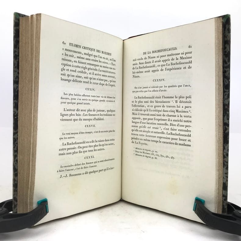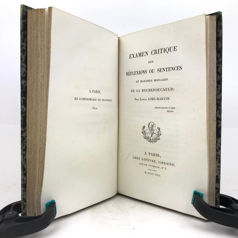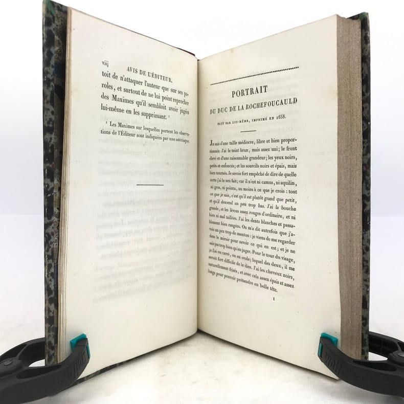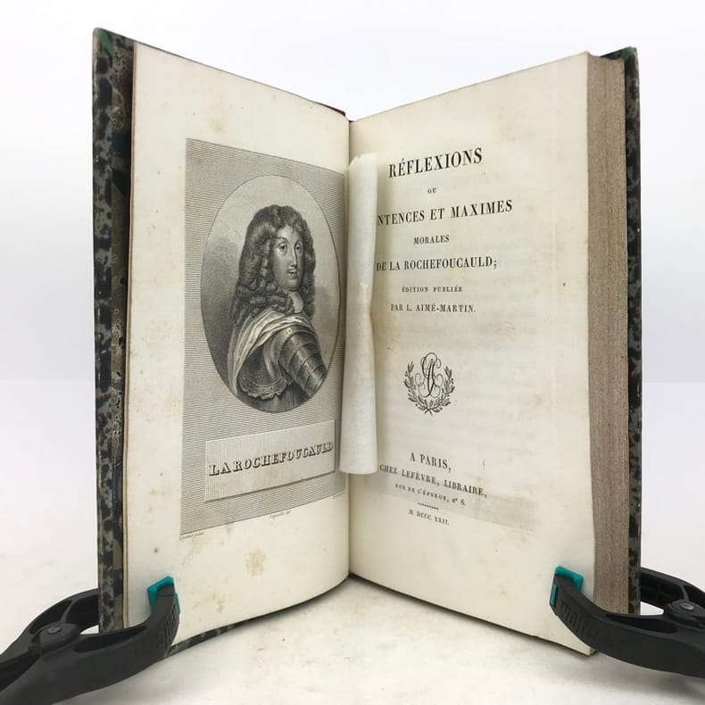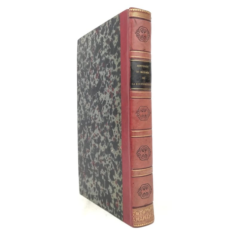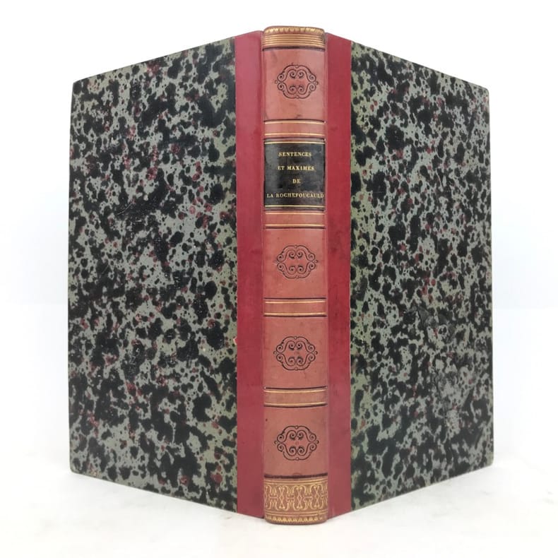 1 volume in-8 (20,3 x 12,7 cm), demi-veau rouge (reliure de l’époque), dos lisse orné de filets et fers à froid. viii-221-1 bl.-[4]-140 pages (complet). Dos légèrement insolé, rares rousseurs. Bon état. Nouvelle édition intéressante incluant les pensées supprimées par l’auteur, les pensées tirées des lettres manuscrites qui se trouvent à la Bibliothèque du Roi et l’ÉDITION ORIGINALE de l’Examen critique de Louis-Aimé Martin. Édition illustrée d’un portrait-frontispice par Bertonnier d’après Petitot. Parues pour la première fois en 1664 chez Barbin, les Maximes de La Rochefoucauld (1613-1680) ont permis la transmission du charme des salons. Bon exemplaire. Vendu 02/10/2025