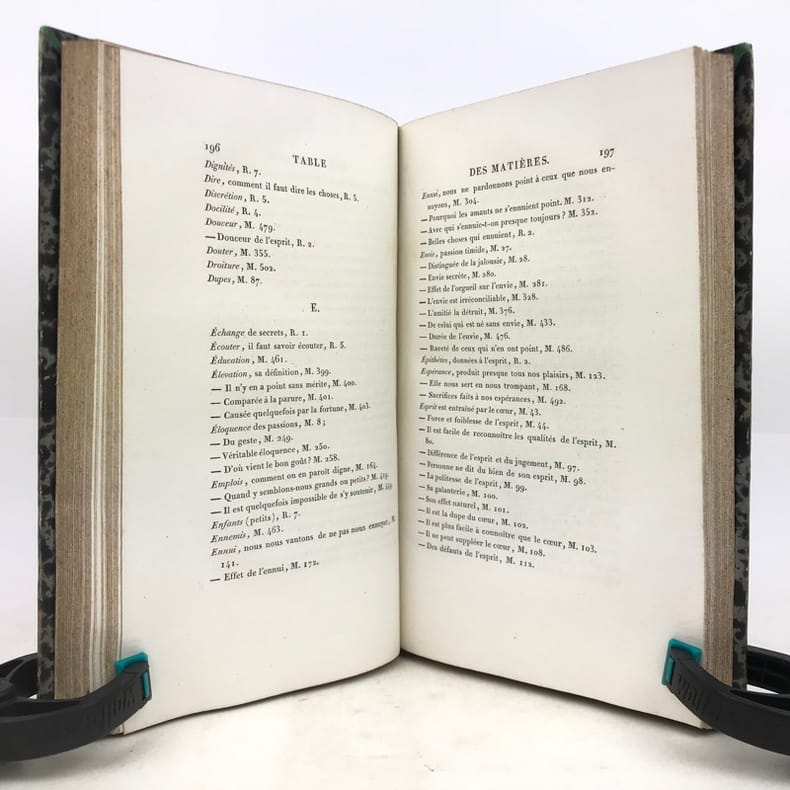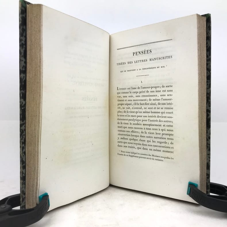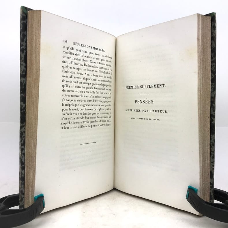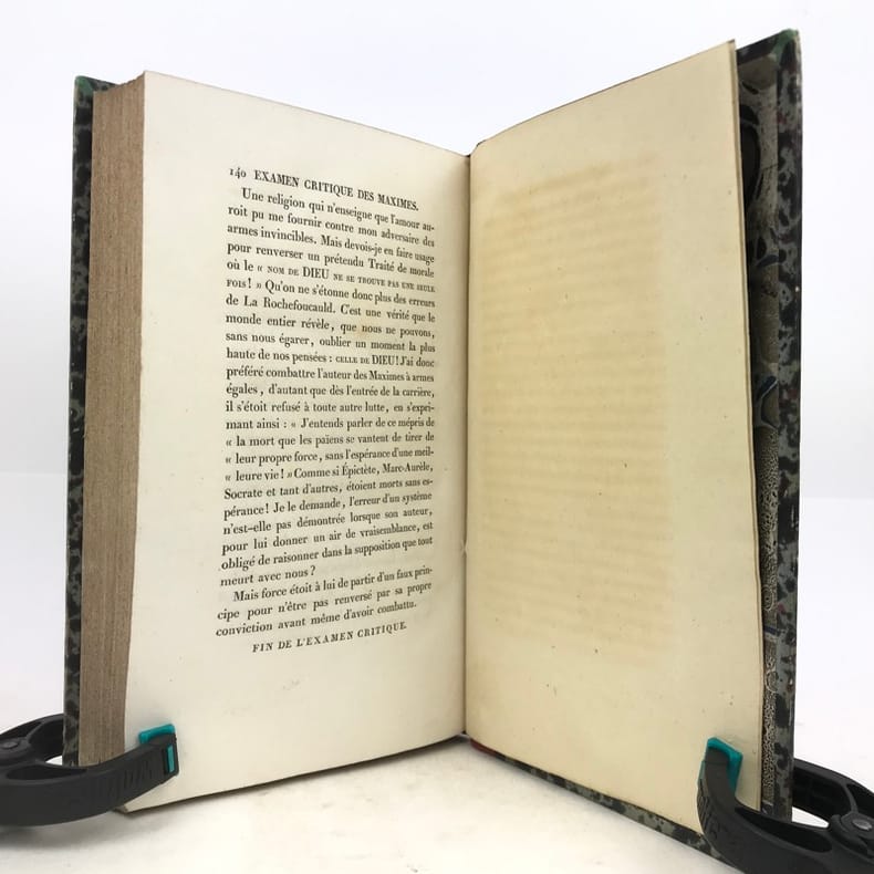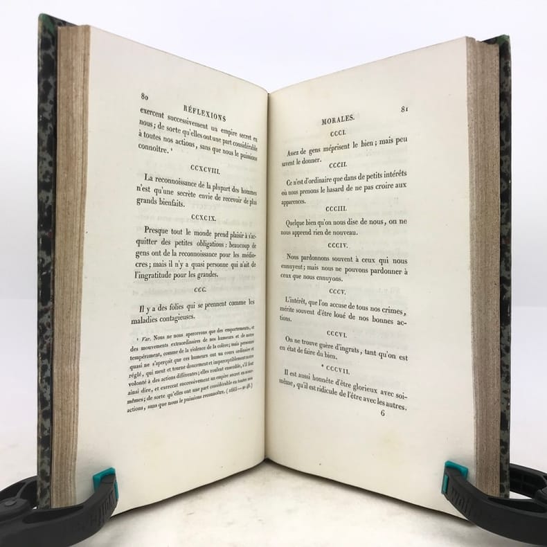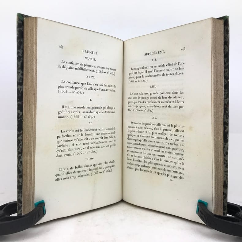 1 volume in-8 (20,3 x 12,7 cm), demi-veau rouge (reliure de l’époque), dos lisse orné de filets et fers à froid. viii-221-1 bl.-[4]-140 pages (complet). Dos légèrement insolé, rares rousseurs. Bon état. Nouvelle édition intéressante incluant les pensées supprimées par l’auteur, les pensées tirées des lettres manuscrites qui se trouvent à la Bibliothèque du Roi et l’ÉDITION ORIGINALE de l’Examen critique de Louis-Aimé Martin. Édition illustrée d’un portrait-frontispice par Bertonnier d’après Petitot. Parues pour la première fois en 1664 chez Barbin, les Maximes de La Rochefoucauld (1613-1680) ont permis la transmission du charme des salons. Bon exemplaire. Vendu 02/10/2025