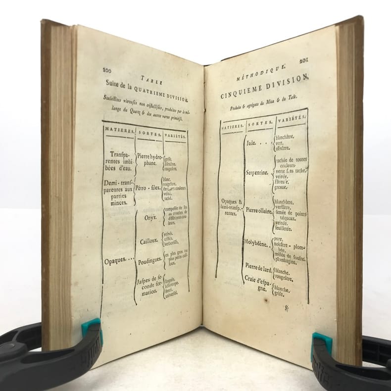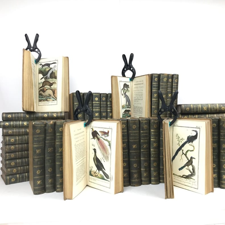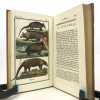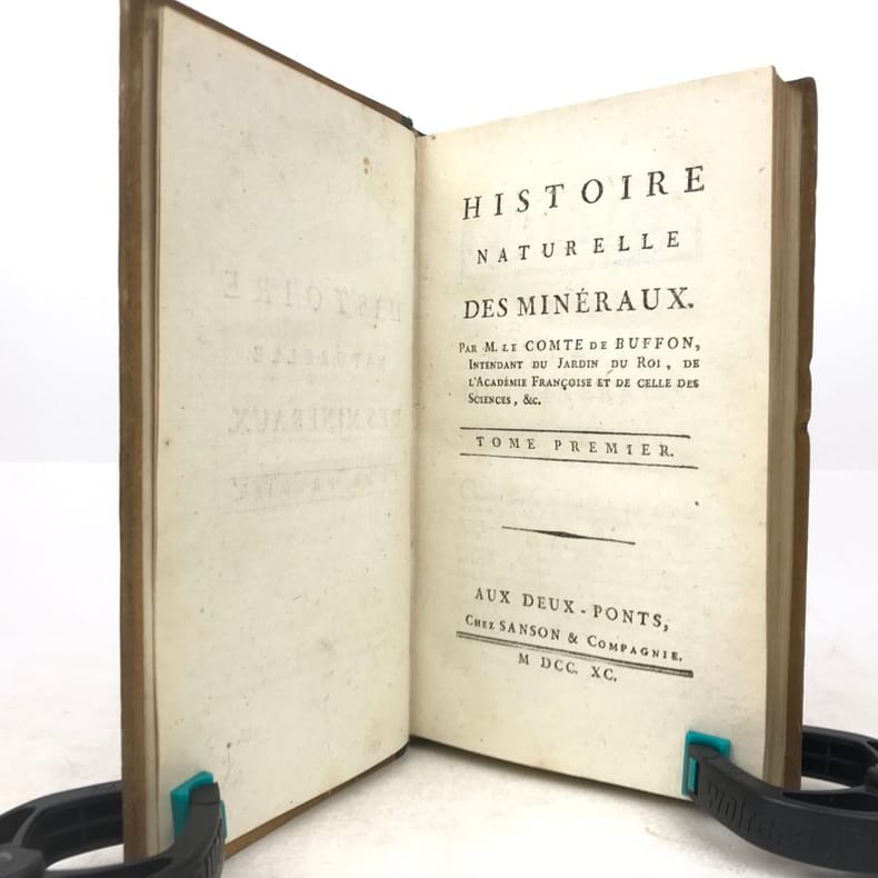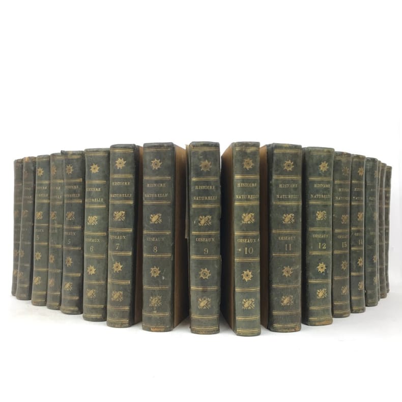54 volumes in-12 (16 x 10 cm), demi basane verte (reliure de l’époque), tranches jaunes, 334-[2] ; 332-[2] ; 347-[1] ; 392-[2] ; 321-[1] ; 324 ; 260-xlvi-[1] ; 336-[2] ; 285-[1]-liv-[2] ; 420-[2] ; 304-xxv-[1]-ii ; 373-[1] ; 290-xlvi ; 285-[1] ; 273-[1] ; 298-[1] ; xlvi-42 à 311-[1] ; 373-[1]-2 ; 283-[1]-2 ; 306-2 ; 256-3-[1] ; 186-xxxvi-2 ; 303-[1]-2 ; 220-xxxix-[1]-2 ; 342 ; 256 ; 248 ; xxxiv-[2]-258 ; 264 ; 303-[1] ; 299-[1] ; ix-10 à 372 ; 199-[1]-cxlix-150 à 154 ; 336 ; 339-[1]-li-[1]-7-[1] ; 377-[1]-5-[1] ; 246-xlx[sic xlvi]-4 ; 400-8 ; 391-[1]-6 ; 370-6 ; 299-[1]-xviii-6 ; 349-[1]-6 ; 258-3-[1] ; 385-3 ; 110-cxlix-[3] ; 326-[2] ; 287-[1] ; 272-[2] ; 270-[2] ; 291-[1] ; 288-[2] ; 329-[4] ; 271-[1] ; 303-[4] pages. Une page de faux-titre manquante au tome V, 48 gravures manquantes aux tomes des Quadrupèdes, dos insolés, mors supérieur fendu du tome I des Oiseaux (11cm), deux feuillets déchirés (Bb3 du tome XIII des Oiseaux et Z8 du tome IX des Minéraux), quelques rousseurs éparses. État correct tout de même. SUPERBE COLLECTION, illustrée d’un portrait de l’auteur en frontispice, de 4 cartes dépliantes, ainsi que de 276 gravures hors texte, dont 271 coloriées à l'époque. Nouvelle édition des œuvres complètes de Georges-Louis Leclerc (1707-1788), comte de Buffon, naturaliste et mathématicien français. Elle se divise comme suit : Tomes I à XIII d’Histoire naturelle, Tomes XIV à XXVII pour les Quadrupèdes, Tomes XXVIII à XLV pour les Oiseaux, Et enfin les tomes XLVI à LIV pour les Minéraux. Agréable ensemble.