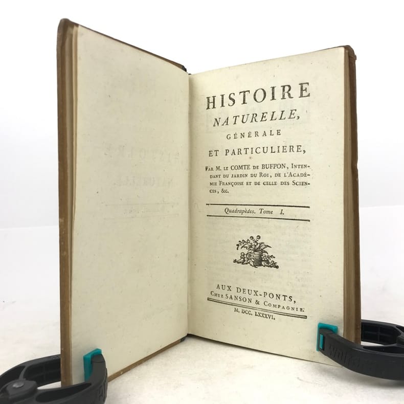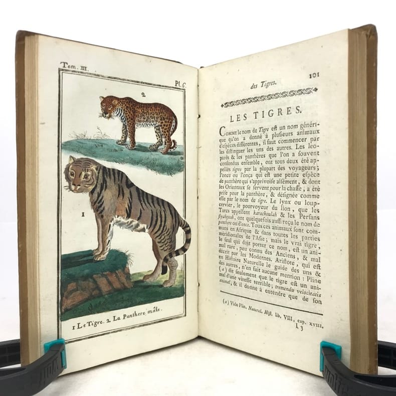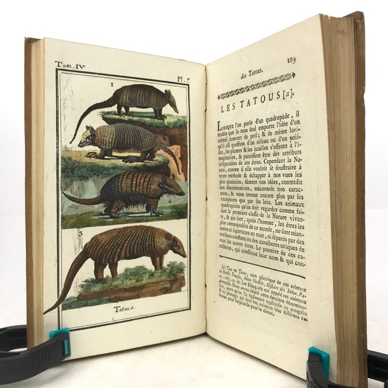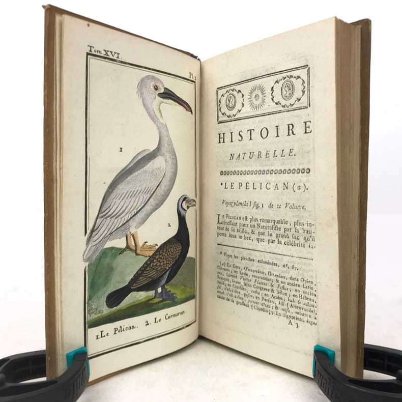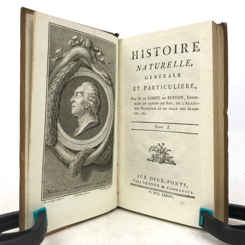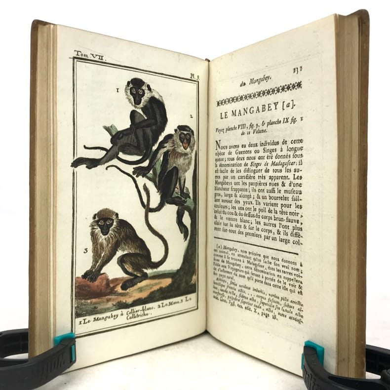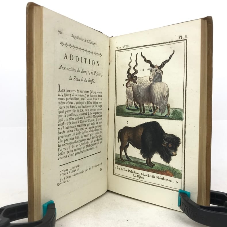 Tome. I : Histoire Naturelle, Théorie de la Terre, 1774, (1) fb. (4) ff (faux-titre, frontispice, titre, épître, table), 612 pages avec 1 portrait en frontispice, 2 planches non numérotées, et 2 cartes.Tome II : Histoire générale des Animaux, Récapitulation Histoire naturelle de l'Homme,1749, (2) ff., 603 pages avec 8 planches. Tome III : Histoire naturelle de l'Homme, Anatomie, 1749, (2) ff., 530 pages, avec 17 planches (pl. 14 située après la 17). Tome IV : Animaux, Discours sur les Animaux, Les Animaux domestiques, Le Cheval, l'Ane, le Boeuf, 1753, xvj-544 pages, avec 23 planches.Tome V : Animaux, La Brebis, la Chèvre, & la Chèvre d'Angora, Le Cochon, le Cochon de Siam & le Sanglier, le Chien avec ses variétés, 1755, (3) ff., 311 pages, avec 52 planches+ 1 tableau dépliant non numéroté.Tome VI : Animaux, Le Chat, les Animaux sauvages, le Cerf, le Daim, le Chevreuil, le Lièvre, le Lapin, 1755, vij-344 pages vec 57 planches.Tome VII : Animaux carnassiers, le Loup, le Renard, le Blaireau, la Loutre, la Fouine, la Marte, le Putois, le Furet, la Belette, l'Hermine ou le Roselet, l'Ecureuil, le Rat, la Souris, le Mulot, le Rat d'eau, le Campagnol, 1758, (3) ff. 378 pages avec 48 planches.Tome VIII : Animaux, Le Cochon d'Inde, le Hérisson, la Musaraigne, la Musaraigne d'eau, la Taupe, la Chauve-Souris, le Loir, le Lérot, le Muscardin, le Surmulot, la Marmotte, l'Ours, le Castor, le Raton, le Coati, l'Agouti, 1760, (3) ff., 402 pages, avec 54 planches.Tome IX : Animaux, Le Lion, Les Tigres, Animaux de l'ancien Continent, Animaux du Nouveau Monde, Animaux communs aux deux Continents, Le Tigre, la Panthère, l'Once & le Léopard, le Jaguar, le Cougar, le Lynx ou Loup-cervier, le Caracal, l'Hyaene, la Civette & le Zibet, La Genette, Un Loup noir,1761, (3) ff., 375 pages avec 41 planches.Tome X : Animaux, L'Ondatra & le Desman, le Pecari ou le Tajacu, la Roussette, la Rougette & le Vampire, le Polatouche, le Petit-gris, le Palmiste, le Barbaresque & le Suisse, le Tamanoir, le Tamandua & le Fourmillier, le Pangolin & le Phatagin, les Tatous, le Paca, le Sarigue ou l'Opossum, la Marmose, le Cayopollin, 1763, (4) ff., 368 pages avec 57 planches.Tome XI : Animaux, l'Eléphant, le Rhinocéros, le Chameau & le Dromadaire, le Buffle, le Bonafus, l'Aurochs, le Bison & le Zébu, le Mouflon & les autres Brebis, l'Axis, 1764, (2) ff., 450 pages avec 43 planches. Tome XII : Animaux, Le Zèbre, l'Hippopotame, l'Elan & le Renne, le Bouquetin, le Chamois & les autres Chèvres, le Saiga, les Gazelles, le Bubale & les autres animaux qui ont rapport aux Gazelles & aux Chèvres, le Condoma, le Guib, la Grimme, les Chevrotains, les Mazames, le Coudous, le Musc, le Cabiai, le Porc-épic, le Coendou, l'Urson, le Tanrec & le Tandrac, 1764, xvj-451 pages, avec 58 planches. Tome XIII : Animaux, De la Nature seconde vue, la Giraffe, le Lama & le Paco, l'Unau et l'Aï, le Surikate, le Tarsier, le Palanger, le Coquallin, le Hamster, le Bobak & les autres Marmottes, les Gerboises, la Mangouste, la Fossane, le Vansire, les Makis, le Loris, la Chauve-souris ver-de-lance, le Serval, l'Ocelot, le Margai, le Chacal & l'Adive, l'Isatis, le Glouton, les Mouffettes, le Pekan & le Vison, la Zibeline, le Leming, la Saricovienne, Une Loutre de Canada, les Phoques, les Morses & les Lamantins, 1765, xx-441 pages avec 58 planches (dont le 46 bis).Tome XIV : Animaux, Nomenclature des Singes, Les Orang-outangs ou le Pongo & le Jocko, le Pithèque, le Gibbon, le Magot, le Papion ou Babouin, le Mandrill, l'Ouanderou & le Lowando, le Maimon, le Macaque et l'Aigrette, le Patas, le Malbrouck & le Bonnet-chinois, le Mangabey, le Moustac, la Talapoin, Le Douc, De la Dégénération des Animaux, 1766, (3) ff. 411 pages avec 41 planches.Tome XV : Animaux, les Sapajous & les Sagoins, l'Ouarine & l'Alouate, le Coaita & l'Exquima, le Sajou, le Saï, le Saïmiri, le Saki, le Tamarin, l'Ouistiti, le Marikina, le Pinche, le Mico, Notice de quelques Animaux dont il n'a pas été fait mention expresse dans le cours de cet ouvrage :Ours blanc, Vache de Tartarie, le Tolai, le Zizel, le Zemmi, le Pouc, le Perouasca, le Souslik, Taupe dorée, Rat d'eau blanc, le Cochon de Guinée, le Sanglier du Cap-verd, le Loup du Mexique, l'Alco, le Tayra ou le Galera, le Philandre de Surinam, l'Acouchi, le Tucan, la Musaraigne du Brésil, l'Apéra, le Tapeti, Concordance & Table, Tables, 1767, (3) ff., 207-ccxxiv (tables) pages, avec 18 planches. Total : 578 planches + 1 portrait en frontispice+ 2 cartes+1 tableau dépliant (Chiens).SUPPLEMENT à L'HISTOIRE NATURELLE, générale et particulière Servant de suite à la Théorie de la Terre, & d'introduction à l'histoire des Minéraux : Tome I : Introduction à l'Histoire des Minéraux, Des Elémens, 1774, (3) ff., 542-xxviij pages avec 16 planches.Tome II : Servant de suite à la Théorie de la Terre, & de préliminaire à l'histoire des Végétaux. Partie Expérimentale & Hypothètique, 1775, (3) ff., 563-xxxiv pages, sans planches.Tome III : Servant de suite à l'histoire des Animaux quadrupèdes, 1776, (5) ff., 330-xxj pages, avec 67 planches (65+2bis). Tome IV : Servant de suite à l'Histoire Naturelle de l'Homme, 1777, (4) ff., 582-xx pages, avec 6 planches.Tome V : Des Epoques de la Nature, Additions et Corrections, Notes Justificatives des faits rapportés dans les Epoques de la Nature, 1778, viij-615 pages, avec 6 planches+ 1 carte dépliante des Chaines de Montagnes de Langres et une carte dépliante des deux Régions Polaires.Tome VI : Supplément à l'Histoire des Animaux Quadrupèdes, 1782, viij-405-xxv pages, avec 49 planches.LES OISEAUX.Tome I : les Aigles, le grand Aigle, le Petit Aigle, l'Aigle commun, le Pyrargue, le Balbuzard, l'Orfraie, le Jean-le-blanc - Oiseaux Etrangers : les Aigles & Balbuzards : les Vautours, le Percnoptere, le Griffon, le Vautour ou Grand Vautour, le Vautour à aigrettes, le petit Vautour - Vautours : le Condor, le Milan & les Buses, la Buse, la Bondrée, l'Oisea