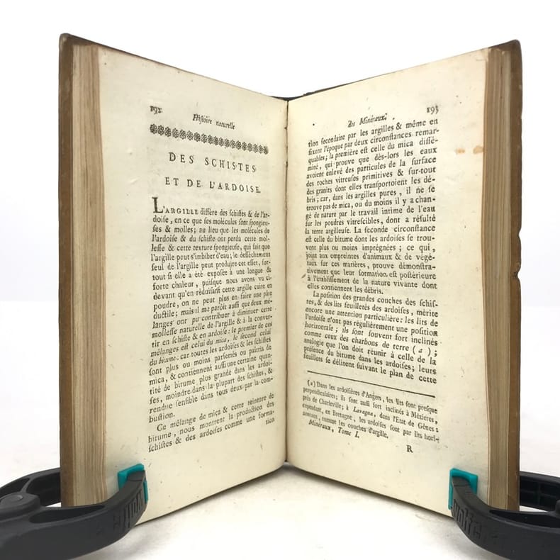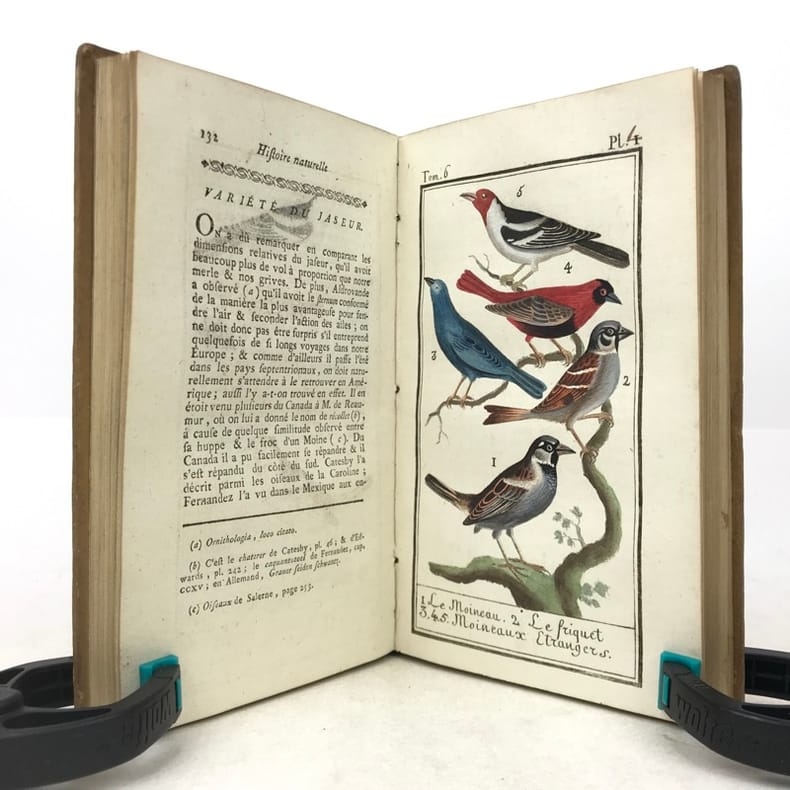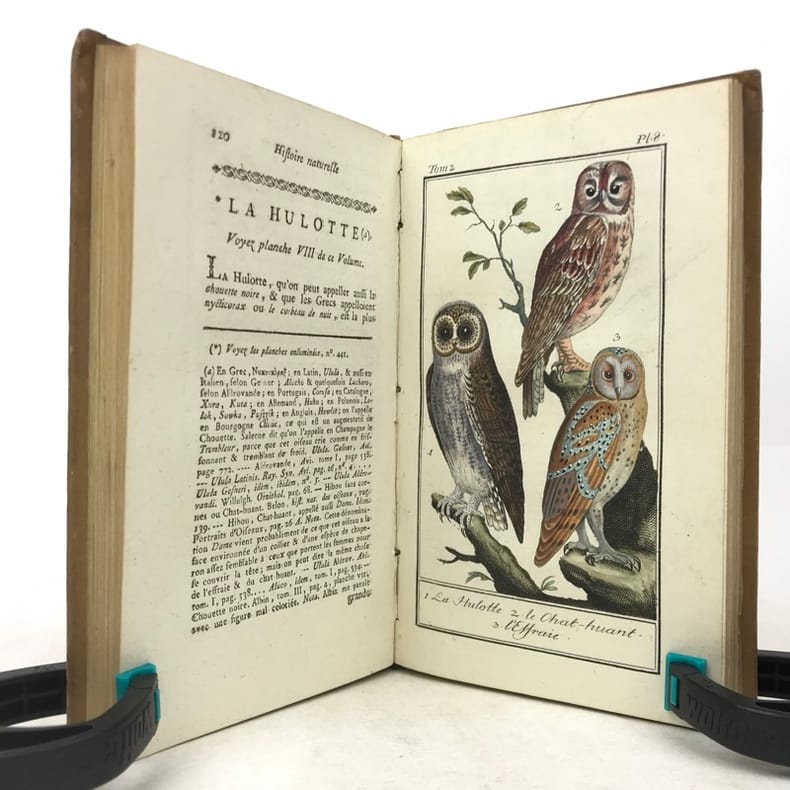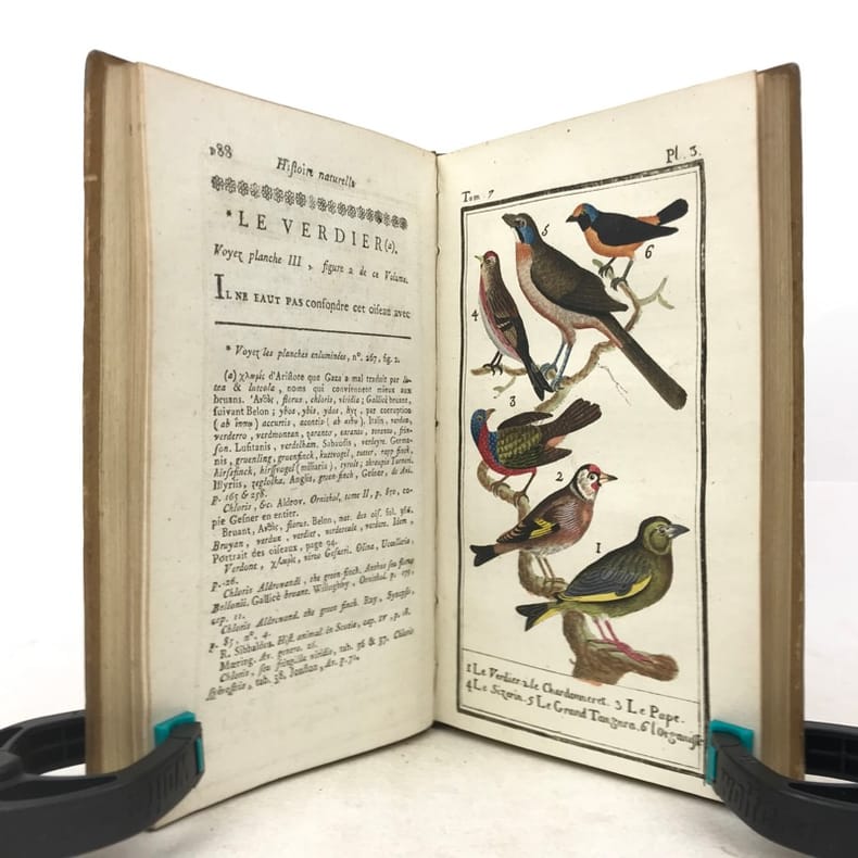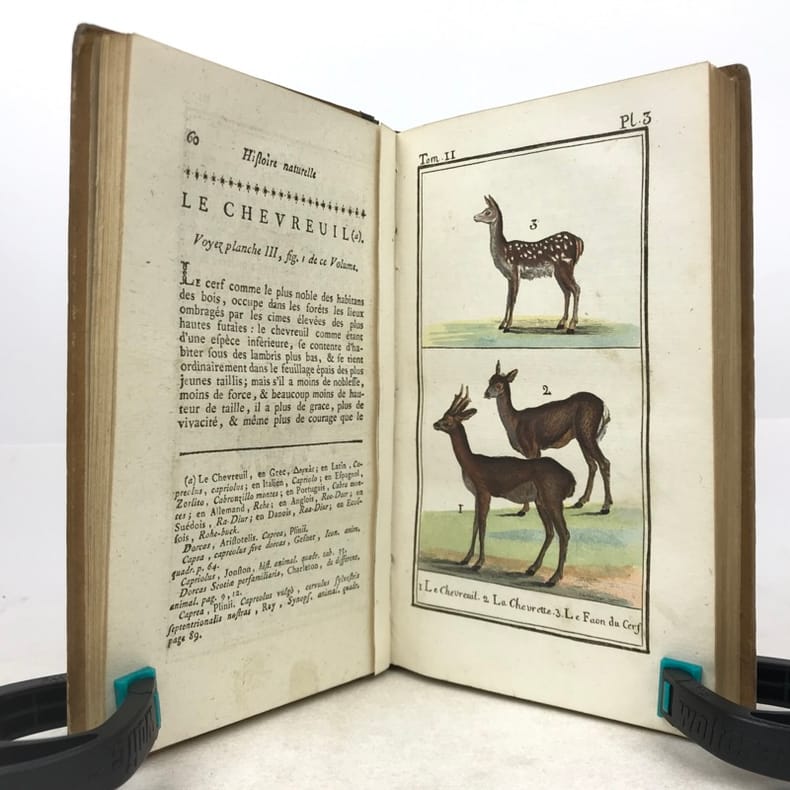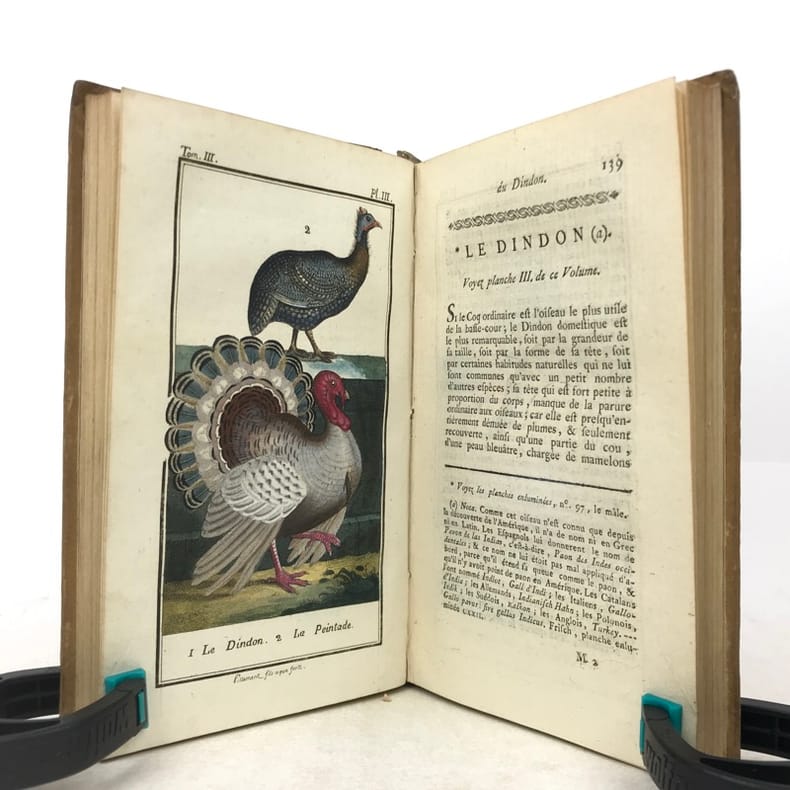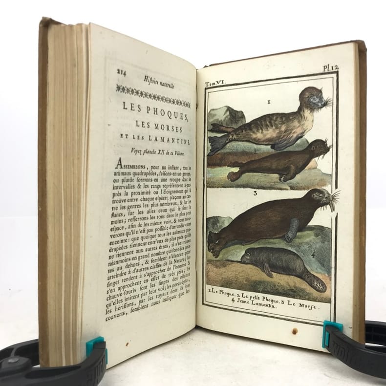 Tome. I : Histoire Naturelle, Théorie de la Terre, 1774, (1) fb. (4) ff (faux-titre, frontispice, titre, épître, table), 612 pages avec 1 portrait en frontispice, 2 planches non numérotées, et 2 cartes.Tome II : Histoire générale des Animaux, Récapitulation Histoire naturelle de l'Homme,1749, (2) ff., 603 pages avec 8 planches. Tome III : Histoire naturelle de l'Homme, Anatomie, 1749, (2) ff., 530 pages, avec 17 planches (pl. 14 située après la 17). Tome IV : Animaux, Discours sur les Animaux, Les Animaux domestiques, Le Cheval, l'Ane, le Boeuf, 1753, xvj-544 pages, avec 23 planches.Tome V : Animaux, La Brebis, la Chèvre, & la Chèvre d'Angora, Le Cochon, le Cochon de Siam & le Sanglier, le Chien avec ses variétés, 1755, (3) ff., 311 pages, avec 52 planches+ 1 tableau dépliant non numéroté.Tome VI : Animaux, Le Chat, les Animaux sauvages, le Cerf, le Daim, le Chevreuil, le Lièvre, le Lapin, 1755, vij-344 pages vec 57 planches.Tome VII : Animaux carnassiers, le Loup, le Renard, le Blaireau, la Loutre, la Fouine, la Marte, le Putois, le Furet, la Belette, l'Hermine ou le Roselet, l'Ecureuil, le Rat, la Souris, le Mulot, le Rat d'eau, le Campagnol, 1758, (3) ff. 378 pages avec 48 planches.Tome VIII : Animaux, Le Cochon d'Inde, le Hérisson, la Musaraigne, la Musaraigne d'eau, la Taupe, la Chauve-Souris, le Loir, le Lérot, le Muscardin, le Surmulot, la Marmotte, l'Ours, le Castor, le Raton, le Coati, l'Agouti, 1760, (3) ff., 402 pages, avec 54 planches.Tome IX : Animaux, Le Lion, Les Tigres, Animaux de l'ancien Continent, Animaux du Nouveau Monde, Animaux communs aux deux Continents, Le Tigre, la Panthère, l'Once & le Léopard, le Jaguar, le Cougar, le Lynx ou Loup-cervier, le Caracal, l'Hyaene, la Civette & le Zibet, La Genette, Un Loup noir,1761, (3) ff., 375 pages avec 41 planches.Tome X : Animaux, L'Ondatra & le Desman, le Pecari ou le Tajacu, la Roussette, la Rougette & le Vampire, le Polatouche, le Petit-gris, le Palmiste, le Barbaresque & le Suisse, le Tamanoir, le Tamandua & le Fourmillier, le Pangolin & le Phatagin, les Tatous, le Paca, le Sarigue ou l'Opossum, la Marmose, le Cayopollin, 1763, (4) ff., 368 pages avec 57 planches.Tome XI : Animaux, l'Eléphant, le Rhinocéros, le Chameau & le Dromadaire, le Buffle, le Bonafus, l'Aurochs, le Bison & le Zébu, le Mouflon & les autres Brebis, l'Axis, 1764, (2) ff., 450 pages avec 43 planches. Tome XII : Animaux, Le Zèbre, l'Hippopotame, l'Elan & le Renne, le Bouquetin, le Chamois & les autres Chèvres, le Saiga, les Gazelles, le Bubale & les autres animaux qui ont rapport aux Gazelles & aux Chèvres, le Condoma, le Guib, la Grimme, les Chevrotains, les Mazames, le Coudous, le Musc, le Cabiai, le Porc-épic, le Coendou, l'Urson, le Tanrec & le Tandrac, 1764, xvj-451 pages, avec 58 planches. Tome XIII : Animaux, De la Nature seconde vue, la Giraffe, le Lama & le Paco, l'Unau et l'Aï, le Surikate, le Tarsier, le Palanger, le Coquallin, le Hamster, le Bobak & les autres Marmottes, les Gerboises, la Mangouste, la Fossane, le Vansire, les Makis, le Loris, la Chauve-souris ver-de-lance, le Serval, l'Ocelot, le Margai, le Chacal & l'Adive, l'Isatis, le Glouton, les Mouffettes, le Pekan & le Vison, la Zibeline, le Leming, la Saricovienne, Une Loutre de Canada, les Phoques, les Morses & les Lamantins, 1765, xx-441 pages avec 58 planches (dont le 46 bis).Tome XIV : Animaux, Nomenclature des Singes, Les Orang-outangs ou le Pongo & le Jocko, le Pithèque, le Gibbon, le Magot, le Papion ou Babouin, le Mandrill, l'Ouanderou & le Lowando, le Maimon, le Macaque et l'Aigrette, le Patas, le Malbrouck & le Bonnet-chinois, le Mangabey, le Moustac, la Talapoin, Le Douc, De la Dégénération des Animaux, 1766, (3) ff. 411 pages avec 41 planches.Tome XV : Animaux, les Sapajous & les Sagoins, l'Ouarine & l'Alouate, le Coaita & l'Exquima, le Sajou, le Saï, le Saïmiri, le Saki, le Tamarin, l'Ouistiti, le Marikina, le Pinche, le Mico, Notice de quelques Animaux dont il n'a pas été fait mention expresse dans le cours de cet ouvrage :Ours blanc, Vache de Tartarie, le Tolai, le Zizel, le Zemmi, le Pouc, le Perouasca, le Souslik, Taupe dorée, Rat d'eau blanc, le Cochon de Guinée, le Sanglier du Cap-verd, le Loup du Mexique, l'Alco, le Tayra ou le Galera, le Philandre de Surinam, l'Acouchi, le Tucan, la Musaraigne du Brésil, l'Apéra, le Tapeti, Concordance & Table, Tables, 1767, (3) ff., 207-ccxxiv (tables) pages, avec 18 planches. Total : 578 planches + 1 portrait en frontispice+ 2 cartes+1 tableau dépliant (Chiens).SUPPLEMENT à L'HISTOIRE NATURELLE, générale et particulière Servant de suite à la Théorie de la Terre, & d'introduction à l'histoire des Minéraux : Tome I : Introduction à l'Histoire des Minéraux, Des Elémens, 1774, (3) ff., 542-xxviij pages avec 16 planches.Tome II : Servant de suite à la Théorie de la Terre, & de préliminaire à l'histoire des Végétaux. Partie Expérimentale & Hypothètique, 1775, (3) ff., 563-xxxiv pages, sans planches.Tome III : Servant de suite à l'histoire des Animaux quadrupèdes, 1776, (5) ff., 330-xxj pages, avec 67 planches (65+2bis). Tome IV : Servant de suite à l'Histoire Naturelle de l'Homme, 1777, (4) ff., 582-xx pages, avec 6 planches.Tome V : Des Epoques de la Nature, Additions et Corrections, Notes Justificatives des faits rapportés dans les Epoques de la Nature, 1778, viij-615 pages, avec 6 planches+ 1 carte dépliante des Chaines de Montagnes de Langres et une carte dépliante des deux Régions Polaires.Tome VI : Supplément à l'Histoire des Animaux Quadrupèdes, 1782, viij-405-xxv pages, avec 49 planches.LES OISEAUX.Tome I : les Aigles, le grand Aigle, le Petit Aigle, l'Aigle commun, le Pyrargue, le Balbuzard, l'Orfraie, le Jean-le-blanc - Oiseaux Etrangers : les Aigles & Balbuzards : les Vautours, le Percnoptere, le Griffon, le Vautour ou Grand Vautour, le Vautour à aigrettes, le petit Vautour - Vautours : le Condor, le Milan & les Buses, la Buse, la Bondrée, l'Oisea