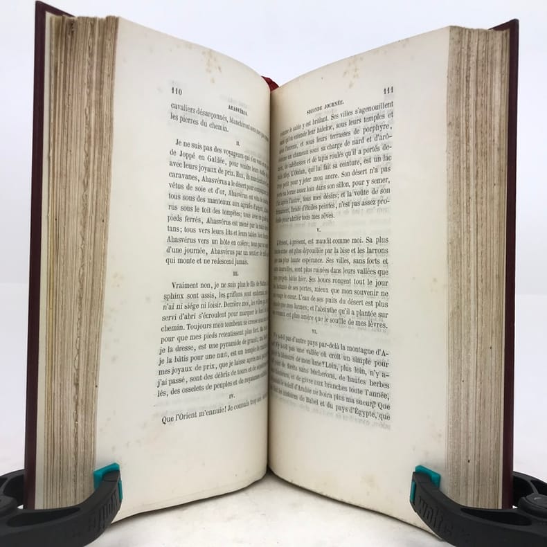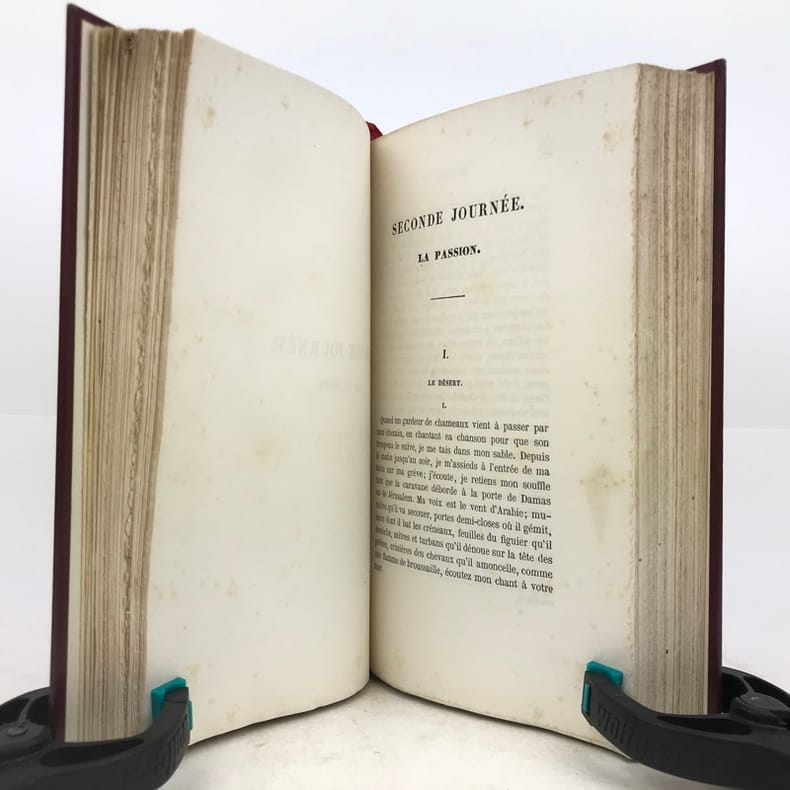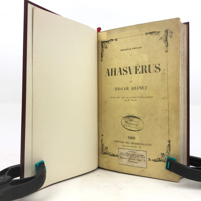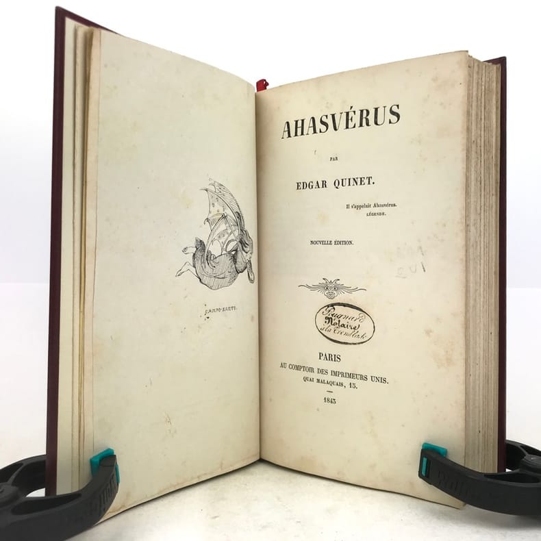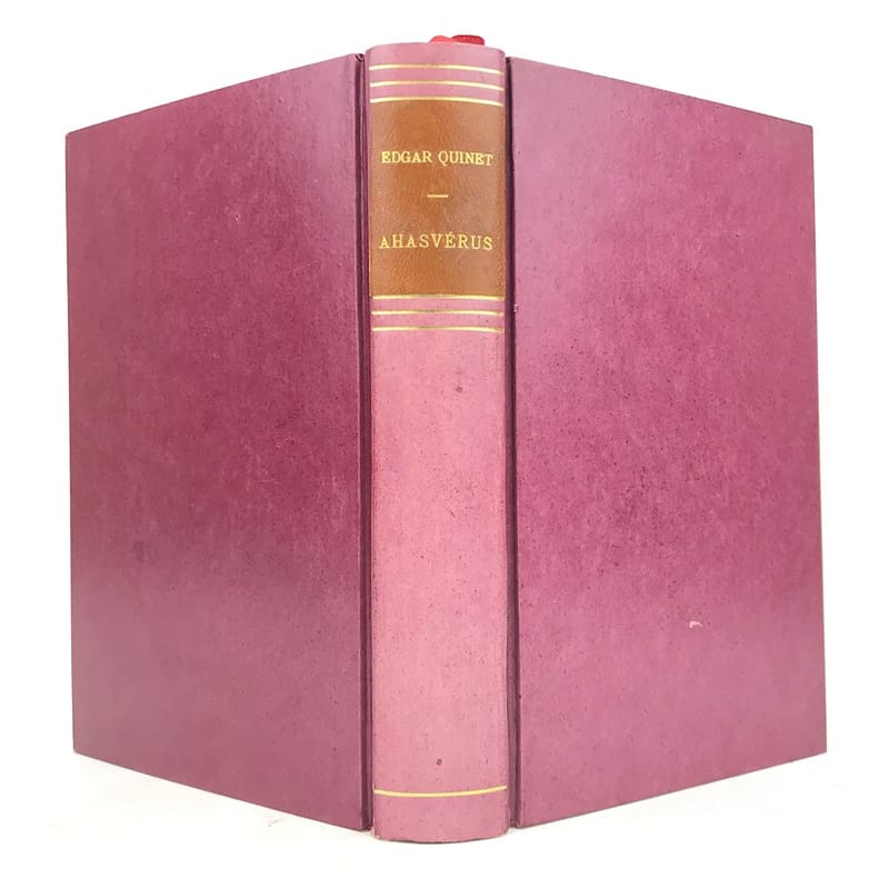 1 volume in-12 (18,2 x 11,5 cm), bradel papier lie-de-vin (reliure moderne, [signée Lavaux]), pièce de titre fauve, couverture jaune conservée, cachet ex-libris à 2 feuillets de “Pougnard, notaire à La Tremblade”, notes manuscrites sur le dernier feuillet blanc (recto-verso). lxiii-1bl.-401-1bl. pages (complet). Dos légèrement insolé, couverture jaune salie, pâles rousseurs marginales à plusieurs feuillets sans gêne de lecture. Bon état. Nouvelle édition ornée d’un frontispice compris dans la pagination, titré “Campo-Santo”. La première édition de ce poème en prose fut publiée en 1834. On a relié in-fine, 2 feuillets blancs supplémentaires sur lesquels est inscrit certains termes employés dans l’ouvrage avec leur définition, tels que Léviathan, Ibis, Sphinx, Péri, Lucifer, Astaroth, Belzébuth… Lexique inachevé, il manque les définitions de l’oiseau Vinateyna et du poisson Macar. Edgar Jean Louis Quinet, (1803-1875), historien, poète, philosophe et homme politique français, républicain et anticlérical. Bon exemplaire.