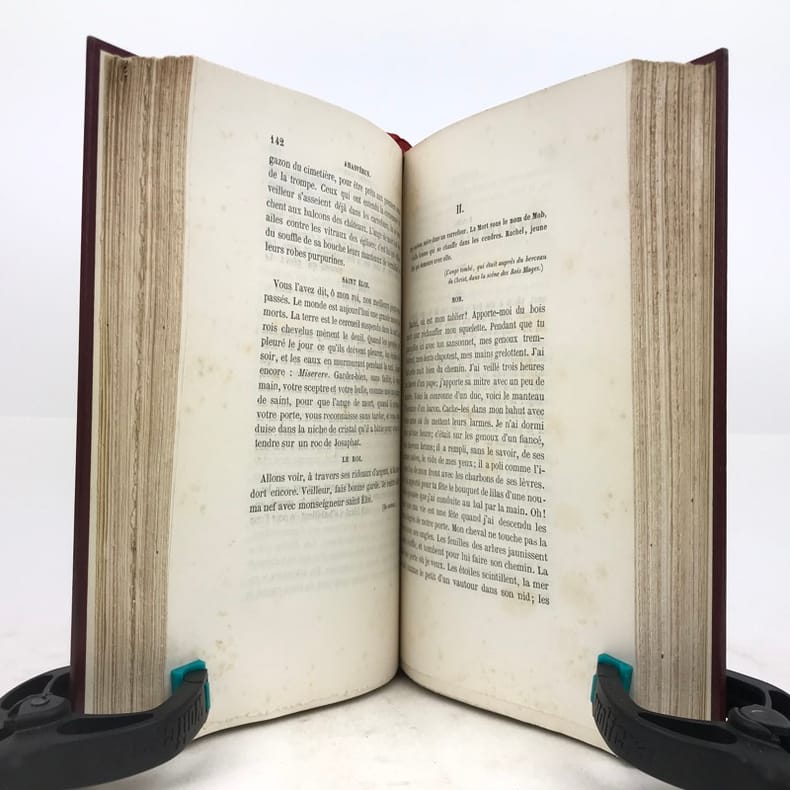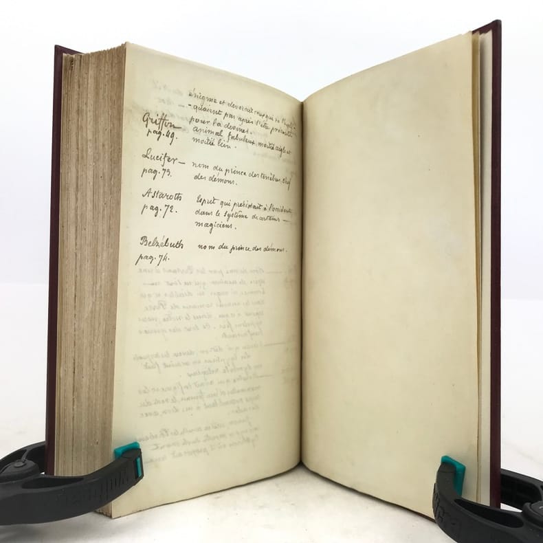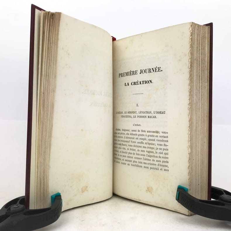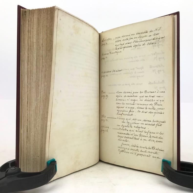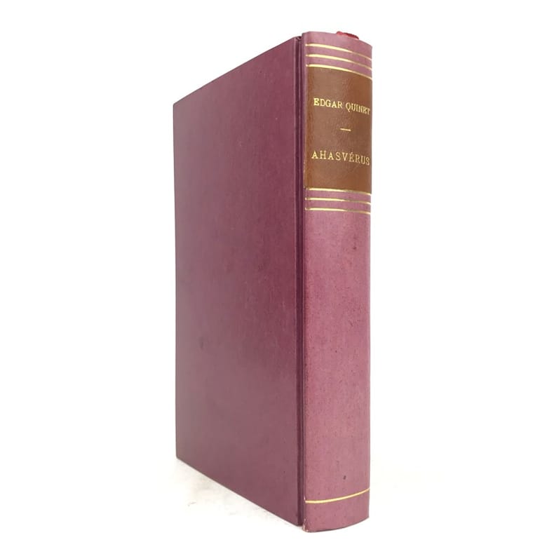 1 volume in-12 (18,2 x 11,5 cm), bradel papier lie-de-vin (reliure moderne, [signée Lavaux]), pièce de titre fauve, couverture jaune conservée, cachet ex-libris à 2 feuillets de “Pougnard, notaire à La Tremblade”, notes manuscrites sur le dernier feuillet blanc (recto-verso). lxiii-1bl.-401-1bl. pages (complet). Dos légèrement insolé, couverture jaune salie, pâles rousseurs marginales à plusieurs feuillets sans gêne de lecture. Bon état. Nouvelle édition ornée d’un frontispice compris dans la pagination, titré “Campo-Santo”. La première édition de ce poème en prose fut publiée en 1834. On a relié in-fine, 2 feuillets blancs supplémentaires sur lesquels est inscrit certains termes employés dans l’ouvrage avec leur définition, tels que Léviathan, Ibis, Sphinx, Péri, Lucifer, Astaroth, Belzébuth… Lexique inachevé, il manque les définitions de l’oiseau Vinateyna et du poisson Macar. Edgar Jean Louis Quinet, (1803-1875), historien, poète, philosophe et homme politique français, républicain et anticlérical. Bon exemplaire.