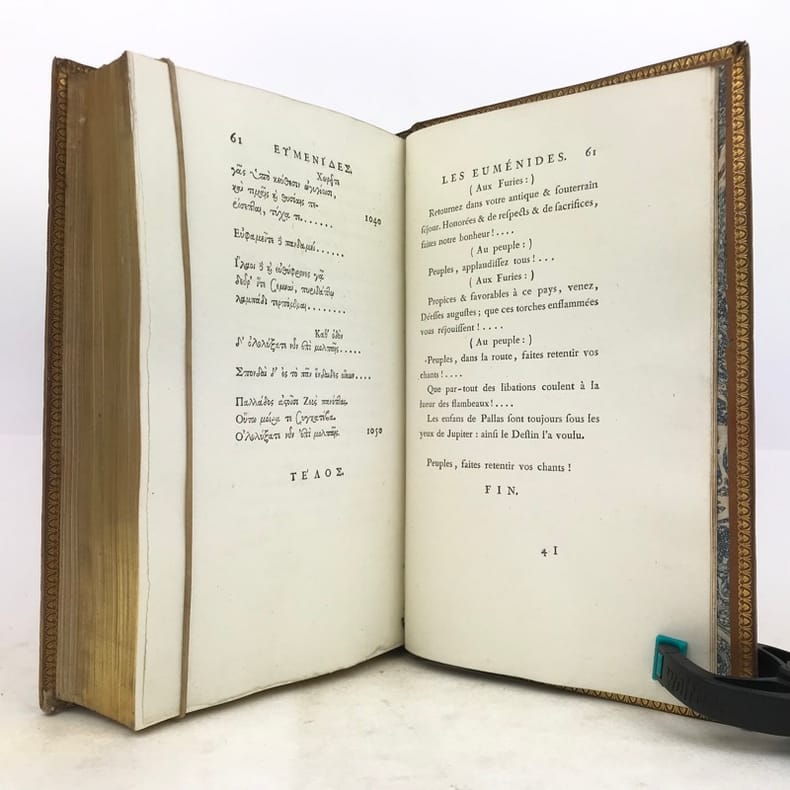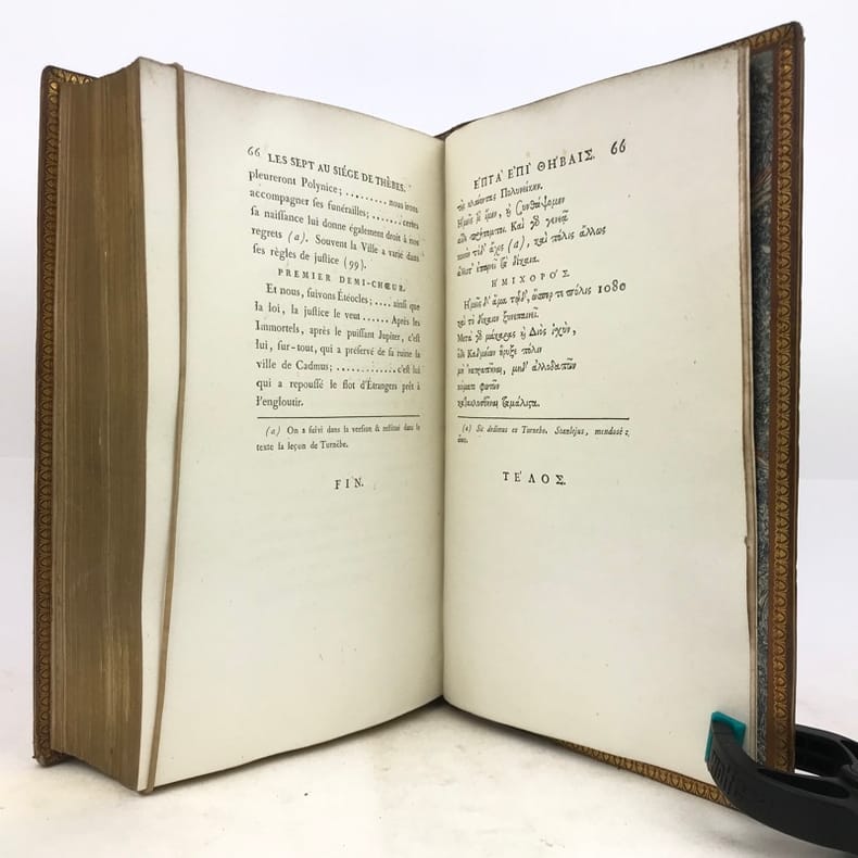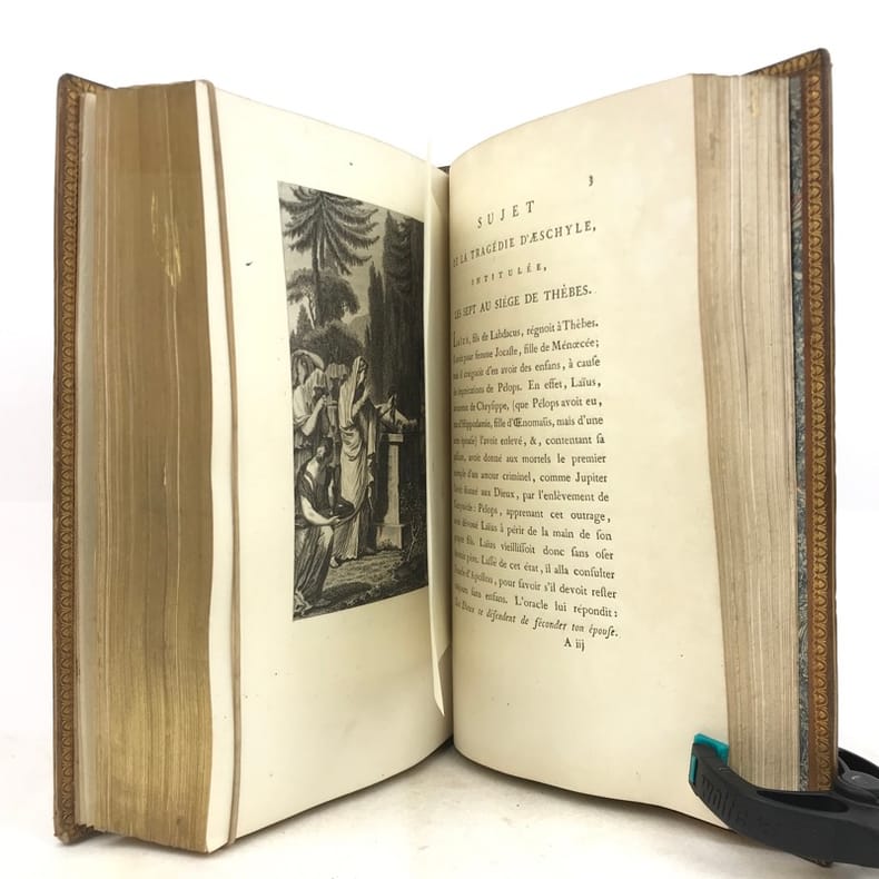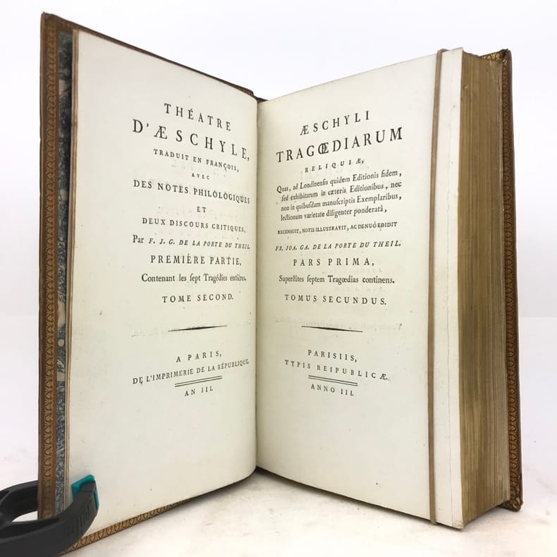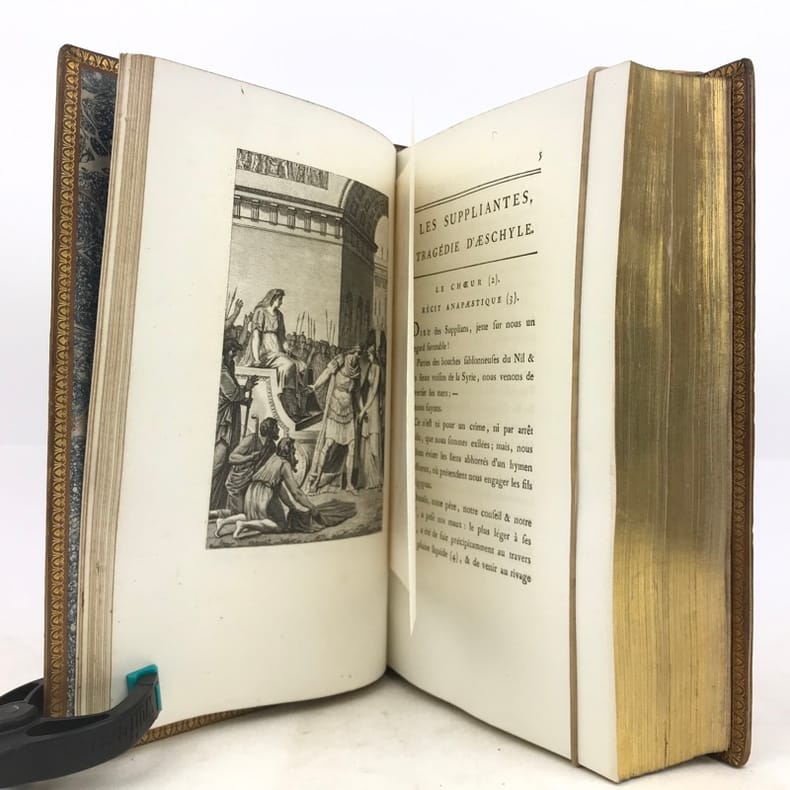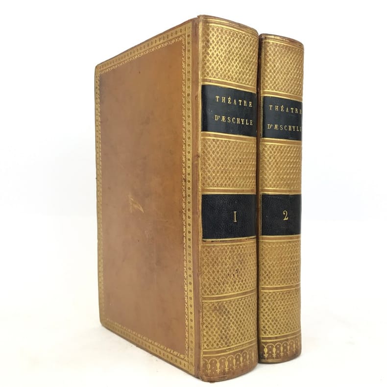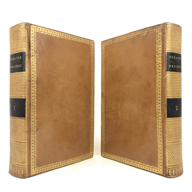 2 volumes (sur 3) in-8 (20,5 cm x 12,5 cm), veau glacé fauve (reliure postérieure signée Bozerian jeune), dos lisse à motifs dorés à la grotesque, pièce de titre et de tomaison noires, roulettes dorées en encadrement des plats, tranches dorées, ex-libris du comte de Beaufort et de Philippe-Louis de Bordes de Fortage contrecollés sur les contreplats. [4]-xxiv-1 bl.-64-2 bl.-63-2 bl.-64-2 bl.-66-1 bl. ; [4]-92-2 bl.-64-2 bl.-61 pages (complet en soi). Manque le dernier volume contenant les notes sur les Suppliantes. Épidermures sur le plat inférieur du tome I, quelques feuillets brunis, déchirures marginales. État très correct. Nouvelle édition bilingue franco-grecque, illustrée d’un frontispice ainsi que de 7 gravures hors-texte.Eschyle (525-456 av. J.-C.) est né à Éleusis dans une famille d'Eupatrides. Il a vu la chute de la tyrannie et la mise en place des réformes de Clisthène qui devaient conduire Athènes à la démocratie. Il aurait en outre participé, contre les Perses, aux batailles de Marathon et de Salamine. Il est pour nous le premier des grands tragiques. Reconnu de son vivant, il bouleverse les règles du théâtre en introduisant un deuxième acteur sur scène. Ses pièces ont une forte valeur morale, dans un style grandiose et imagé. Sur les soixante-treize œuvres qu’il aurait écrites, sept nous sont parvenues. Parmi elles se trouve la seule trilogie dont nous disposons, L'Orestie, qui relate l’assassinat d’Agamemnon à son retour de Troie, puis celui de Clytemnestre par son fils, et, enfin, le procès d’Oreste. De lui nous possédons encore Prométhée Enchaîné, Les Sept contre Thèbes, Les Suppliantes et Les Perses. Bel exemplaire.