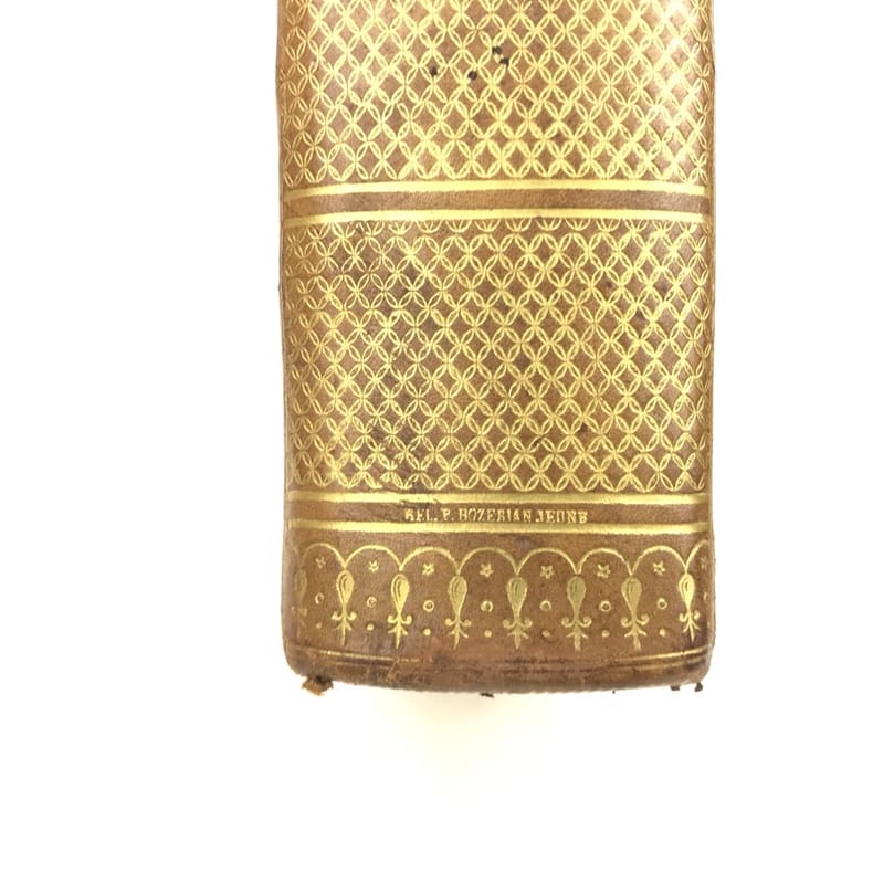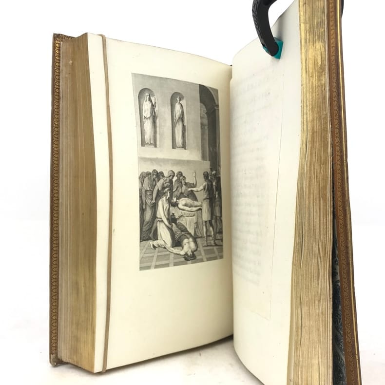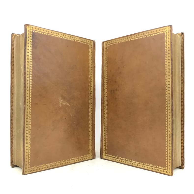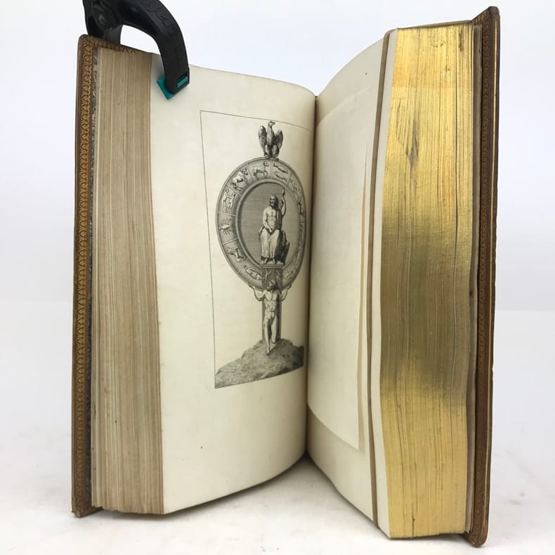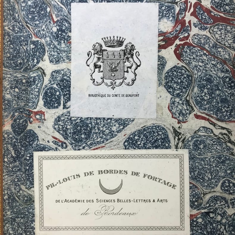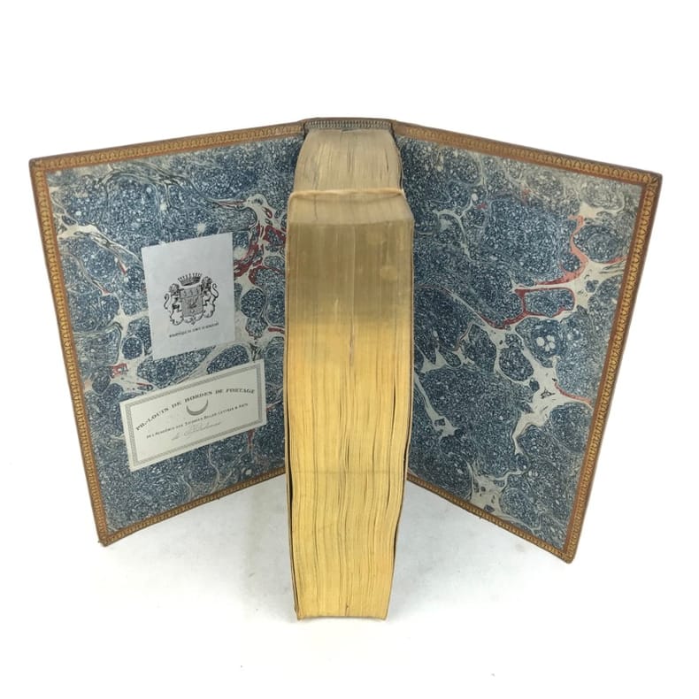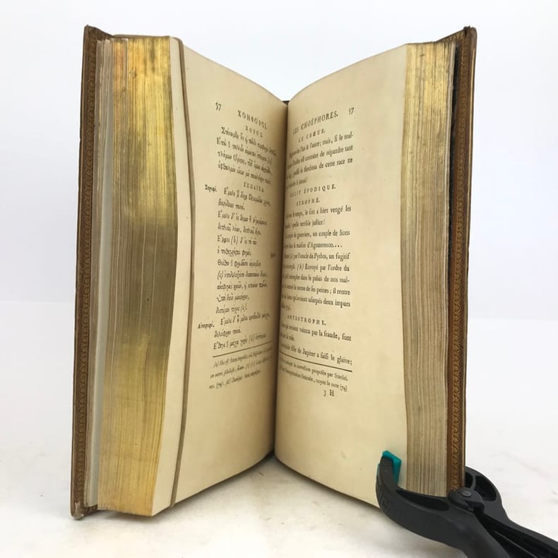 2 volumes (sur 3) in-8 (20,5 cm x 12,5 cm), veau glacé fauve (reliure postérieure signée Bozerian jeune), dos lisse à motifs dorés à la grotesque, pièce de titre et de tomaison noires, roulettes dorées en encadrement des plats, tranches dorées, ex-libris du comte de Beaufort et de Philippe-Louis de Bordes de Fortage contrecollés sur les contreplats. [4]-xxiv-1 bl.-64-2 bl.-63-2 bl.-64-2 bl.-66-1 bl. ; [4]-92-2 bl.-64-2 bl.-61 pages (complet en soi). Manque le dernier volume contenant les notes sur les Suppliantes. Épidermures sur le plat inférieur du tome I, quelques feuillets brunis, déchirures marginales. État très correct. Nouvelle édition bilingue franco-grecque, illustrée d’un frontispice ainsi que de 7 gravures hors-texte.Eschyle (525-456 av. J.-C.) est né à Éleusis dans une famille d'Eupatrides. Il a vu la chute de la tyrannie et la mise en place des réformes de Clisthène qui devaient conduire Athènes à la démocratie. Il aurait en outre participé, contre les Perses, aux batailles de Marathon et de Salamine. Il est pour nous le premier des grands tragiques. Reconnu de son vivant, il bouleverse les règles du théâtre en introduisant un deuxième acteur sur scène. Ses pièces ont une forte valeur morale, dans un style grandiose et imagé. Sur les soixante-treize œuvres qu’il aurait écrites, sept nous sont parvenues. Parmi elles se trouve la seule trilogie dont nous disposons, L'Orestie, qui relate l’assassinat d’Agamemnon à son retour de Troie, puis celui de Clytemnestre par son fils, et, enfin, le procès d’Oreste. De lui nous possédons encore Prométhée Enchaîné, Les Sept contre Thèbes, Les Suppliantes et Les Perses. Bel exemplaire.