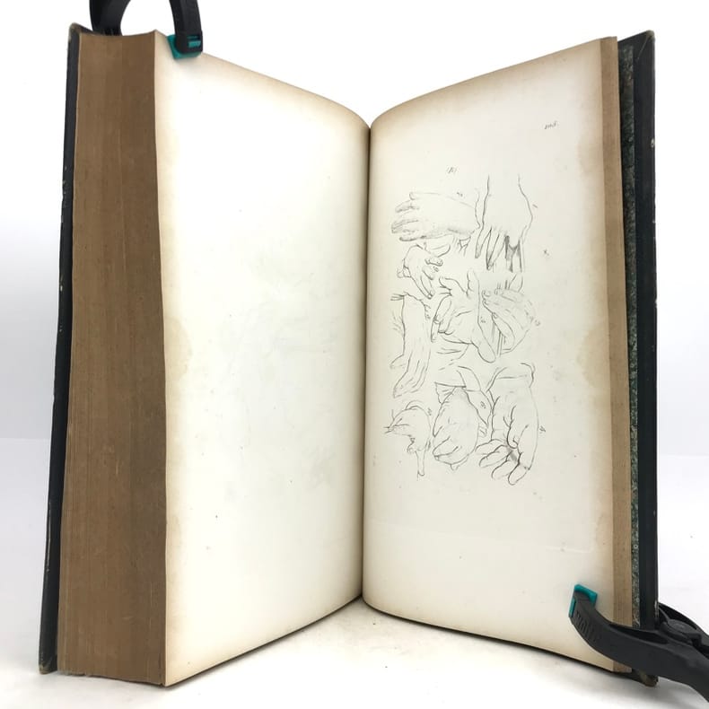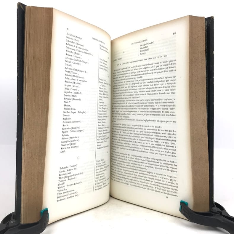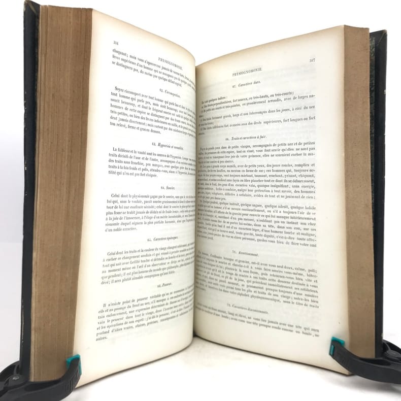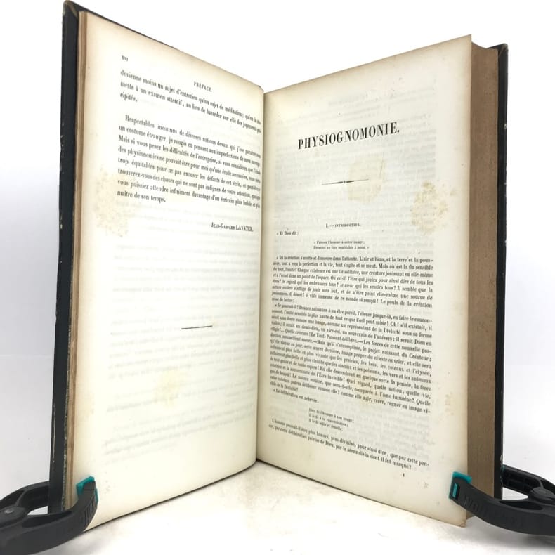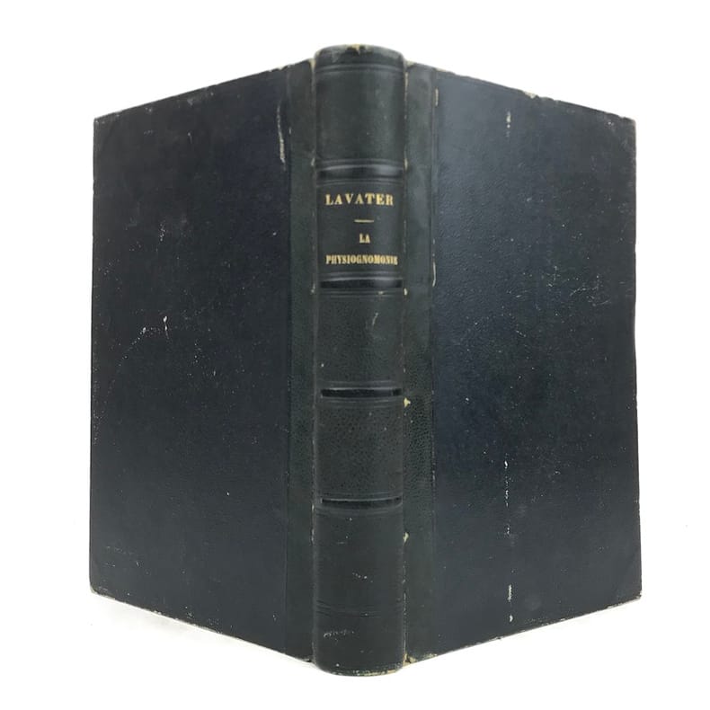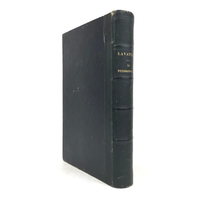 1 volume in-4 (26 x 16,5 cm), demi chagrin bleu (reliure de l’époque), dos à nerfs avec titre doré, tranches mouchetées, xvi-320 pages (texte complet). Une gravure manquante, reliure émoussée, rousseurs. État correct tout de même. Édition illustrée d’un frontispice et de 119 planches hors-texte, reliées in-fine. Johann Caspar Lavater (1741-1801) est un penseur, théologien, poète et écrivain suisse de langue allemande. Nouvelle traduction de son célèbre Essai sur la physiognomonie, publié la première fois en 1775 et inspiré du Religio Medici de Thomas Browne. Il la définit lui-même ainsi : “La physionomie humaine est pour moi, dans l’acception la plus large du mot, l’extérieur, la surface de l’homme en repos ou en mouvement, soit qu’on l’observe lui-même, soit qu’on n’ait devant les yeux que son image.” Bon exemplaire.