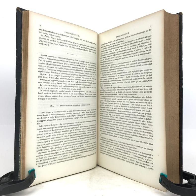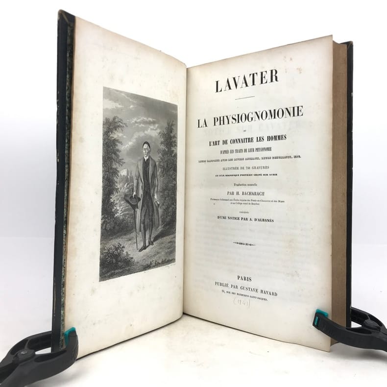 PREMIÈRE ÉDITION de la traduction française d'Henri Bacharach, précédée d'une notice sur la vie de Lavater par François Fertiault. 120 PLANCHES hors-texte sur vélin fort, gravées sur acier, dont un portrait en pied de Lavater. Elles contiennent environ 700 PORTRAITS d'êtres humains ou d'animaux qui ont permis à Lavater d'étayer ses théories sur la relation entre la physionomie et la personnalité humaines. EXEMPLAIRE du bibliophile René Amédée CHOPPIN DE VILLY (1806-1886), avec son ex-libris héraldique. BON EXEMPLAIRE. GOOD COPY. PICTURES AND MORE DETAILS ON REQUEST.