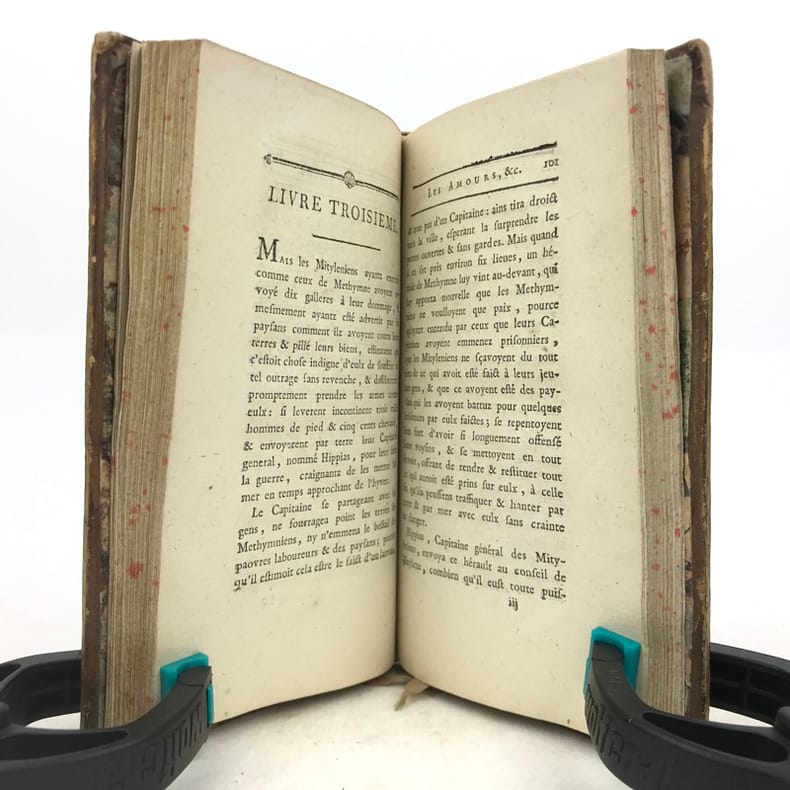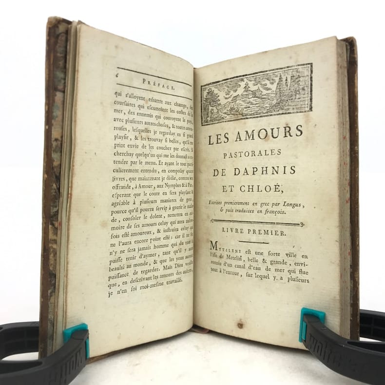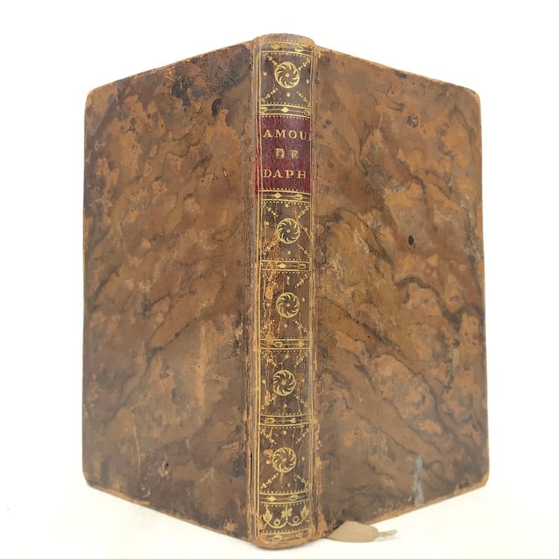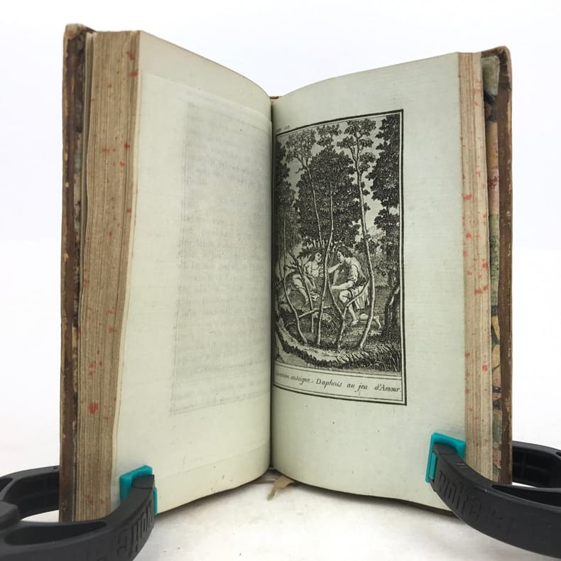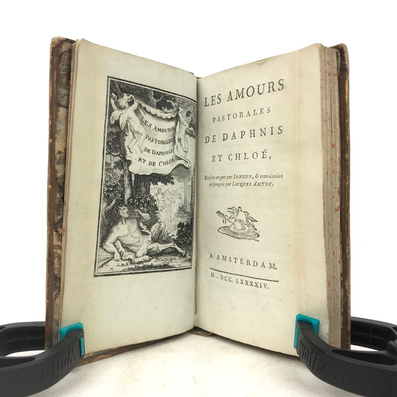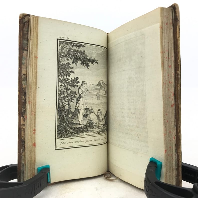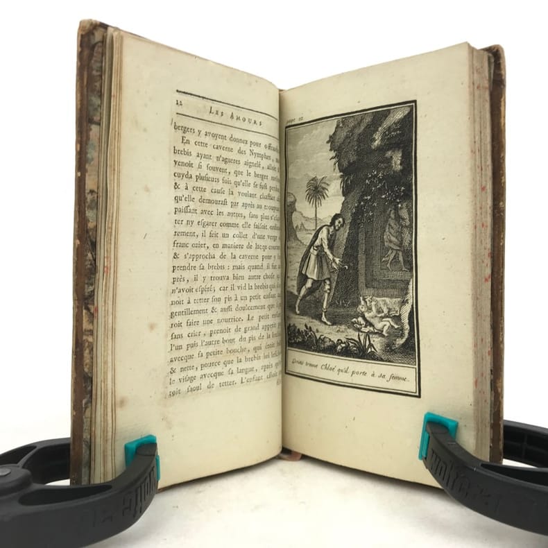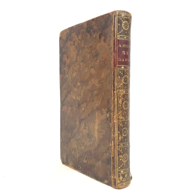 1 volume in-16 (13 cm x 7,5 cm), veau marbré brun (reliure de l’époque), dos lisse orné de motifs dorés, pièce de titre rouge, ex-libris de Jacques Laget contrecollé sur le contreplat. [4]-200 pages (complet). Frottements à la reliure, feuillets ternis, rousseurs. État correct. Nouvelle édition traduite par Jacques Amyot, illustrée d’un frontispice ainsi que de 7 gravures hors-texte. Considéré comme l'un des premiers romans d'amour antique, Daphnis et Chloé est un roman grec attribué à Longus et daté du iie ou iiie siècle de l'ère commune. Il s'agit d'une pastorale en prose dont le thème est la naissance et les progrès de l'amour entre deux adolescents. Derrière une apparente simplicité, ce roman mène une réflexion importante sur les rapports entre la nature et la culture. Agréable exemplaire.